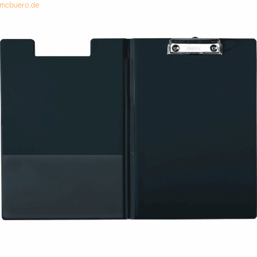 Klemmmappe (Clipboard); Schreibunterlage in Mappenform; stabile Klemm-Mechanik am oberen Rand des Rückteils.; mit Innentasche am Vorderdeckel und Stiftelasche; Material: Einband mit PVC-Folie umschweisst; für A4; Farbe: schwarz;