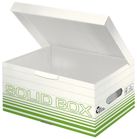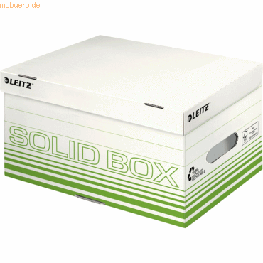 Leitz Archiv Container Solid S; Mit integriertem Klappdeckel; Für A4 Ordner; Mit Automatikboden für einen schnellen und bequemen Aufbau; Mit Beschriftungslinien; Doppelter Boden und doppelte Wände für besondere Haltbarkeit und schwere Beladung; Sehr hohe Beständigkeit: bis zu 4 Container übereinander stapelbar (BCT in N: 1549); Tragkraft: maximal 15kg; Lieferung flach liegend; Material: 100% Wellpappe (RC), 100% recycelbar; Format Außenmaß: 370 x 195 x 265 mm; FSC-zertifiziert; Farbe: hellgrün;