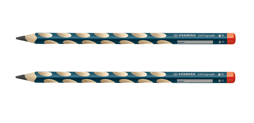 Ergonomischer Bleistift STABILO EASYgraph; Ausführung der Schaftform: Dreikantform; gespitzt; Schaft lackiert; für Rechtshänder - sichtbar durch roten Farbcode am Stiftende; Dreikantform und rutschfeste Griffmulden für eine entspannte Handhaltung; Minendurchmesser 3,15 mm; Holz aus nachhaltiger Waldwirtschaft; Mit Namensfeld; Härtegradkennzeichnung vorhanden; Länge: 175 mm; Farbe des Schaftes: petrol; Bezeichnung der Härte: HB; Packungs-Inhalt: Blisterkarte mit 2 Stiften;