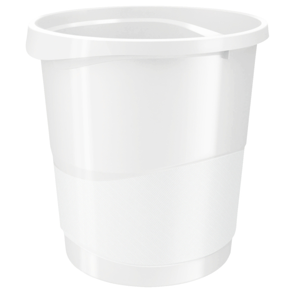 Esselte Papierkorb VIVIDA, 14 Liter; Mit stabilem, umlaufendem Griffrand für eine feste Anbringung von Müllbeuteln; Glatte Innenoberfläche für einfache Reinigung; Mit integriertem Tragegriff für einfaches Entleeren; Zur Aufbewahrung platzsparend ineinander stapelbar; Oberfläche mit 3-D-Effekt geprägt; Material: Polypropylen (PP); Format: Durchmesser 305 mm, 350 mm hoch; Farbe: weiß;