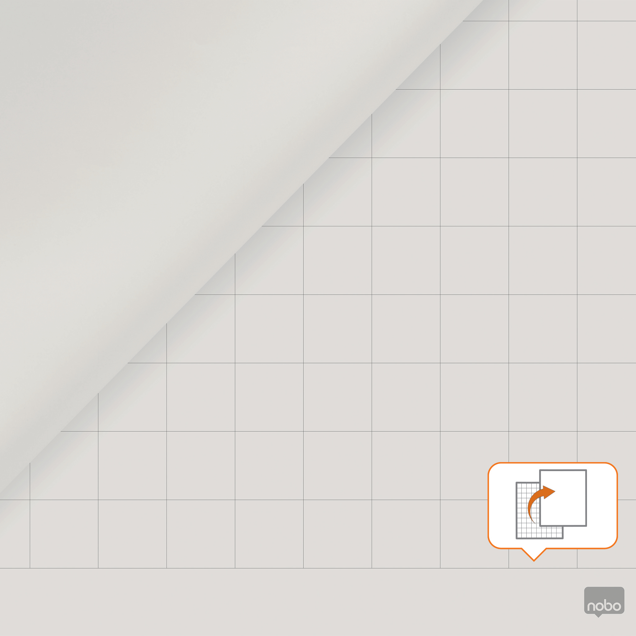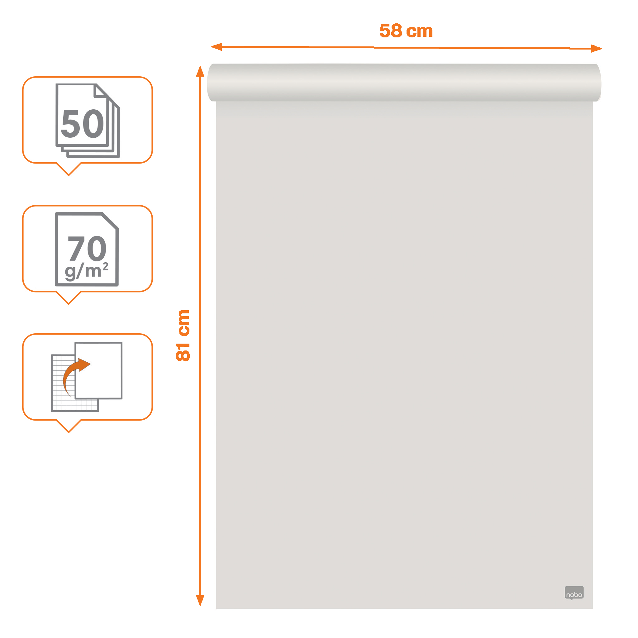 Nobo Flipchartblock Recycling; Blanko/Kariert, 70 g/qm; Beidseitig verwendbar; Rastergröße 50 x 50 mm; Mit Perforation; Aus 95 % Recyclingpapier, 100 % recycelbar und alterungsbeständig, wodurch das Papier länger sauber und weiß bleibt; Durch die hohe Blickdichte des Papiers kommt die Tinte besonders gut zur Geltung und verhindert, dass die Tinte auf der Rückseite ausläuft; Mit 15 vorgestanzten Löchern zur Verwendung auf den meisten Flipcharts; Bedruckt mit lösungsmittelfreier Tinte auf Wasserbasis; 50 Blatt; Mit plastikfreier Verpackung; Flach; Format: 580 x 810 mm; Farbe: weiß;