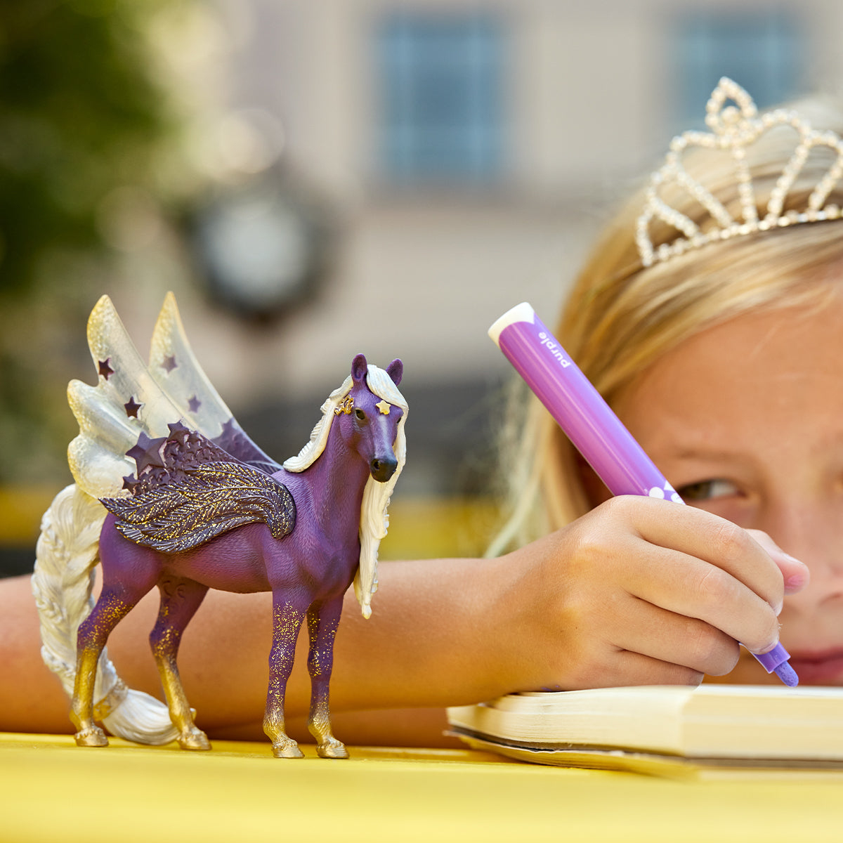 Diese wunderschöne Sternen-Pegasus Stute ist nicht von dieser Welt; Sie entstammt der Unendlichkeit des Universums und das sieht man ihr auf den ersten Blick an; Sie behütet Geheimnisse von denen wir nicht einmal etwas ahnen; Ihre äußere Erscheinung lässt sie besonders magisch wirken, da sie den Eindruck erweckt, sie sei gerade vom nächtlichen Sternenhimmel herabgestiegen; Sie und ihre Familie, der stolze Mond Einhorn Hengst und ihr gemeinsames, niedliches Sternschnuppen Einhorn Fohlen, bilden eine zauberhafte Einheit; Wissenswertes: Die wunderschöne Sternen-Pegasus Stute ist ein Wesen von einem anderen Stern; Abmessungen: 15,0 x 8,20 x 18,0 cm (B x T x H);