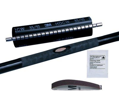 rnDie 3M Warmschrumpf-Reparaturmanschetten HDCW dient der schnellen und sicheren Reparatur von beschädigten Kabelmänteln von Nieder- und Mittelspannungskabeln. Ihre Innenseite ist mit einem Heiß-Schmelzkleber beschichtet, so bietet sie einen wasserdichten Abschluss auf allen Kunststoff- und Metallmänteln. Dabei zeigt eine außen auf der Manschette befindliche Beschichtung mit Temperaturindikatorfarbe das Ende des Schrumpfvorganges durch einen Farbumschlag an. Als Verschluss dient eine nichtrostende Schiene aus Metall, die Sie nach dem Abkühlen der Manschette entfernen können. Die Reparaturmanschette besteht aus vernetztem Polyolefin. Sie ist UV-beständig und halogenfrei.rnrn Hauptmerkmale rn rn Merkmale rn Typ Schrumpfschlauch rn Produktfarbe Schwarz rn Schlauch-/Rohrlänge 50 cm rn Durchmesser vor Schrumpfen 12 cm rn Menge pro Packung 1 Stück(e) rn Durchmesser nach Schrumpfen 2,8 cm rn Schrumpftemperatur 120 °C rn