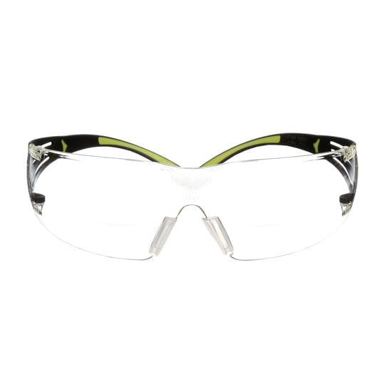 rnDie leichten 3M SecureFit Schutzbrillen Serie 400 mit Vergrößerungsbereich besitzen randlose Polycarbonatgläser, 3M Bügeldruckverteilungstechnologie, breite, flexible Bügel, weiche, verstellbare Nasenstege und einen Vergrößerungsbereich.rnFür komfortablen Augenschutz mit Vergrößerungsbereich zur deutlichen Erkennung kleiner Detail empfiehlt sich die 3M SecureFit Safety Readers Schutzbrille Serie 400. Die Schutzbrille mit schwarz/grünem Rahmen wiegt nur 19 g und verfügt unten über einen Vergrößerungsbereich mit +1,5 oder +2,0 oder +2,5 Dioptrien. Sie verfügt außerdem über die 3M Bügeldruckverteilungstechnologie, durch welche sich die doppelt gepolsterten Bügelverbindungspunkte natürlich an die Kopfgröße des jeweiligen Trägers anpassen. Das garantiert einen sicheren und bequemen Sitz. Die weichen und verstellbaren Nasenstege ermöglichen eine noch bessere Passform und reduzieren das Verrutschen der Schutzbrille bei Kopfbewegungen. Die breiten und flexiblen Bügel mit Sitz über den