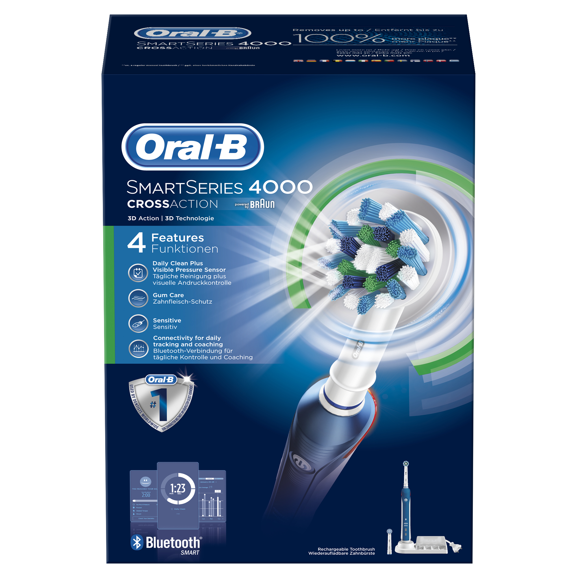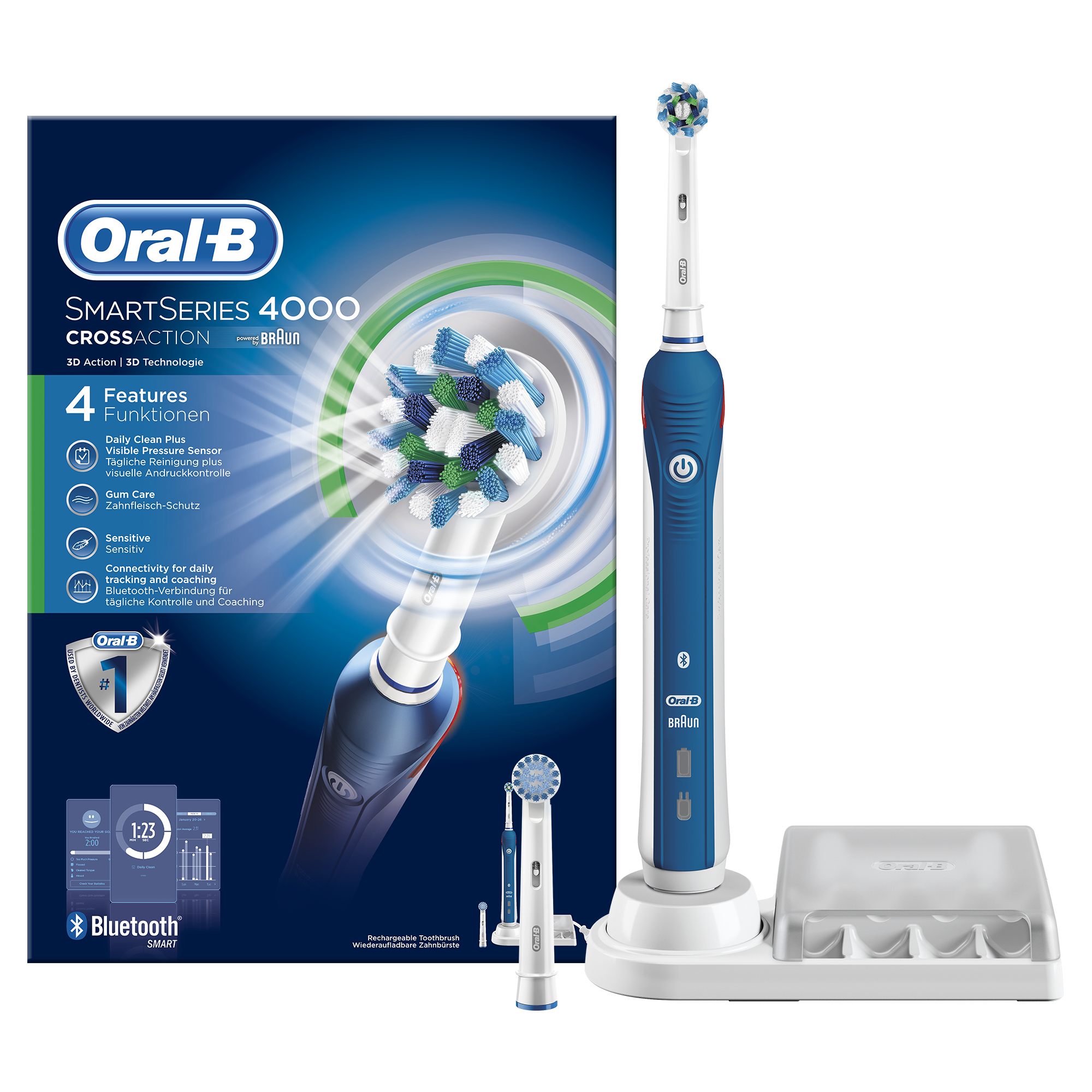 Braun Oral-B Smart Serie 4000 BT elektrische Zahnbürste in Weiß-Blau - zuverlässige Hygiene für die tägliche Nutzung Lassen Sie sich von der Braun Oral-B Smart Serie 4000 BT überzeugen und nutzen Sie die präzise angeordneten Borsten, um Ihre Zähne schonend und dabei gründlich zu säubern. Unliebsamer Belag und hartnäckige Verschmutzungen werden effektiv beseitigt. Dabei wird das Zahnfleisch geschont. Die Smart Serie 4000 BT wurde nach dem Vorbild professioneller Reinigungsgeräte entwickelt und reinigt besonders effizient. Die Braun Oral-B Smart Serie 4000 - mit professionellem Bürstenkopf Die Braun Oral-B Smart Serie 4000 reinigt mit ihrem professionellen Design, indem der Bürstenkopf jeden Zahn einzeln umschließt. Dabei sorgt die dynamische 3D-Reinigung dafür, dass sich die Bürste Ihren Zähnen mit oszillierenden, rotierenden und pulsierenden Bewegungen anpasst, um bis zu 100 Prozent mehr Plaque im Vergleich zu einer herkömmlichen Handzahnbürste zu entfernen. Neu an der Braun Oral-B Smart Serie 4000 ist auch, dass sie eine Verbindung zu Ihrem Smartphone aufnehmen kann. Via Bluetooth können Sie Kontakt zur Oral B-App aufnehmen und sich ein optimiertes Zahnpflegeprogramm von Ihrem Zahnarzt erstellen lassen. Die App erinnert sogar daran, wenn es Zeit für einen Bürstenkopfwechsel ist. Gründliche, sanfte Reinigung Die Braun Oral-B Smart Serie 4000 ermöglicht Ihnen eine gründliche sowie jetzt noch sanftere Reinigung der Zähne. Dabei unterstützt Sie die integrierte Andruckkontrolle, die akustisch und visuelle Warnzeichen gibt, wenn Sie zu fest reinigen. Sie haben die Wahl zwischen der Sensitiv-Bürste und der Cross Action-Bürste, die mit um 16 Grad angewinkelten Borsten bis in die Zahnzwischenräume gelangt. Unsere Kaufempfehlung Mit der Braun Oral-B Smart Serie 4000 erhalten Sie ein besonders gründliches, hocheffizientes Gerät für die tägliche Zahnhygiene. Dabei sorgen die innovativen Bürstenköpfe für eine gründliche Zahnhygiene.