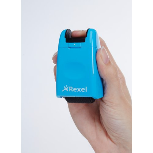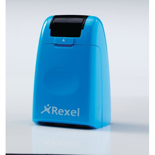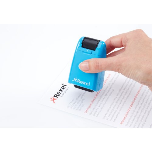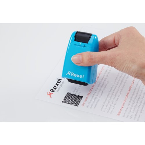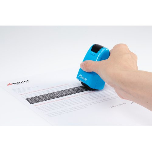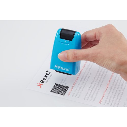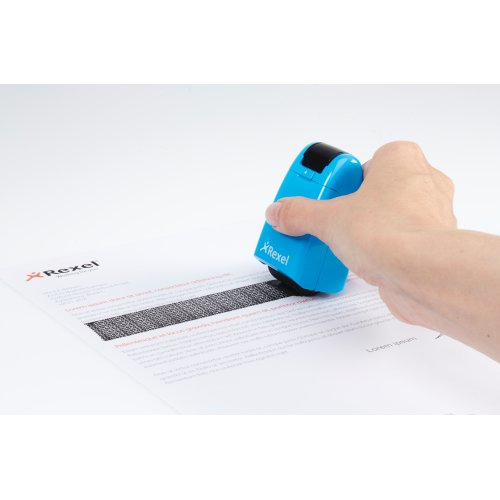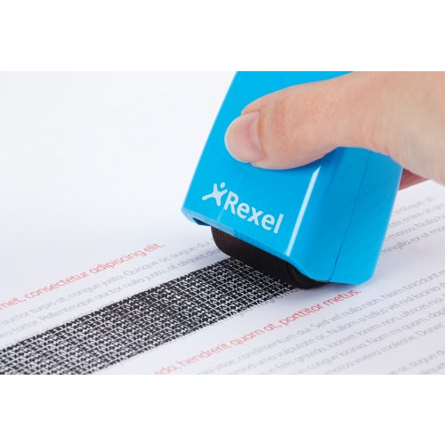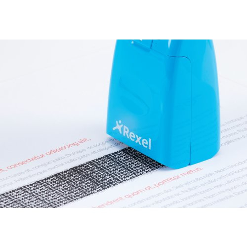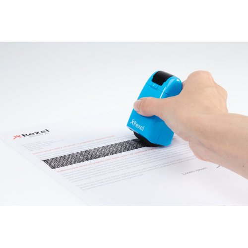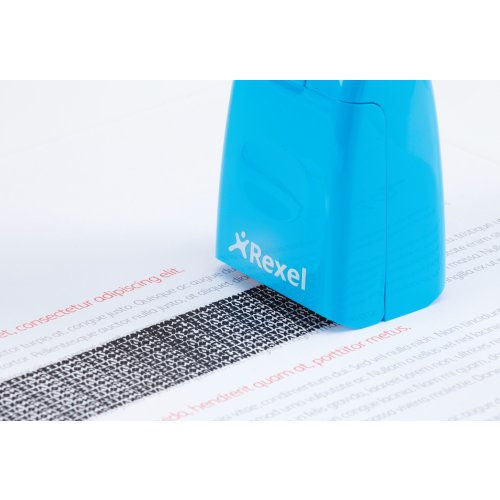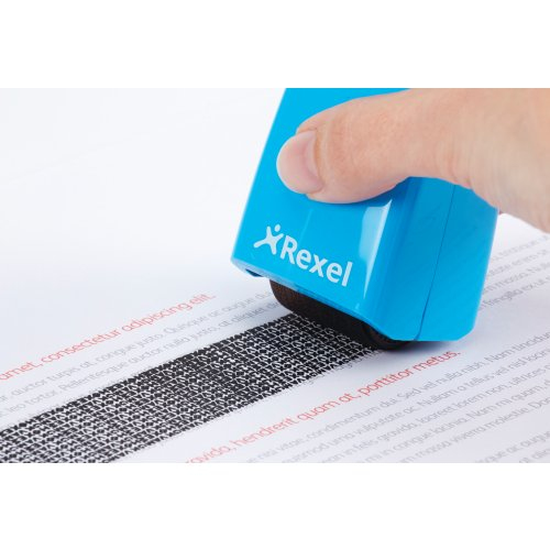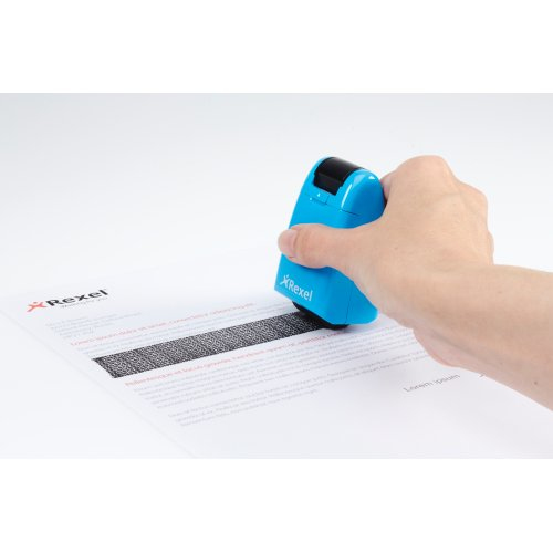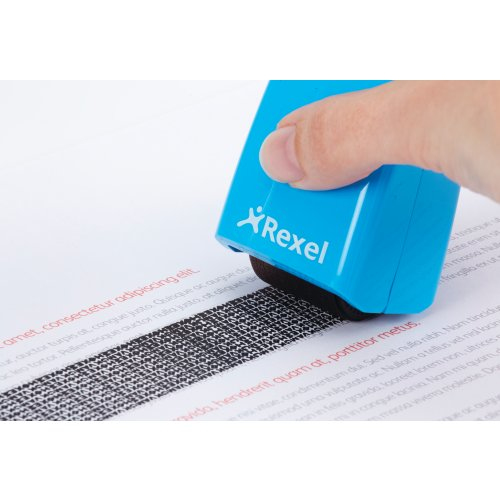 Rexel Tintenrollstempel ID Guard; Einziehbar; Für die schnelle, einfache und wirksame Art, vertrauliche Informationen durch Überrollen unkenntlich zu machen; Praktisch mit einziehbarer Stempelkappe für saubere Aufbewahrung bei Nichtgebrauch; Mit speziell entwickeltem Muster zum Unkenntlichmachen von gedrucktem Text; Für Links- und Rechtshänder; Die mitgelieferte Tintenpatrone hält ca. 715 Anwendungen mit Durchmesser 70 mm Länge, das entspricht ca; 50 m; Stempelbreite: 26 mm; Format: 47 x 77 x 38 mm; Farbe: blissful blue; Gefahrenkennzeichnung: GHS07 Reizend; Signalwort: Achtung;