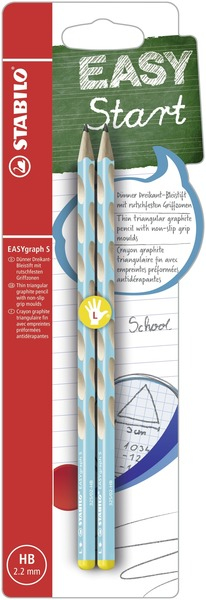 Ergonomischer Dreikant-Bleistift STABILO EASYgraph S; Ausführung der Schaftform: Dreikantform; gespitzt; Schaft lackiert; für Linkshänder - sichtbar durch gelben Farbcode am Stiftende; Dreikantform und rutschfeste Griffmulden für eine entspannte Handhaltung; Minendurchmesser 2,2 mm; Holz aus nachhaltiger Waldwirtschaft; Mit Namensfeld; Härtegradkennzeichnung vorhanden; Länge: 175 mm; Farbe des Schaftes: blau; Bezeichnung der Härte: HB; Packungs-Inhalt: Blisterkarte mit 2 Stiften;