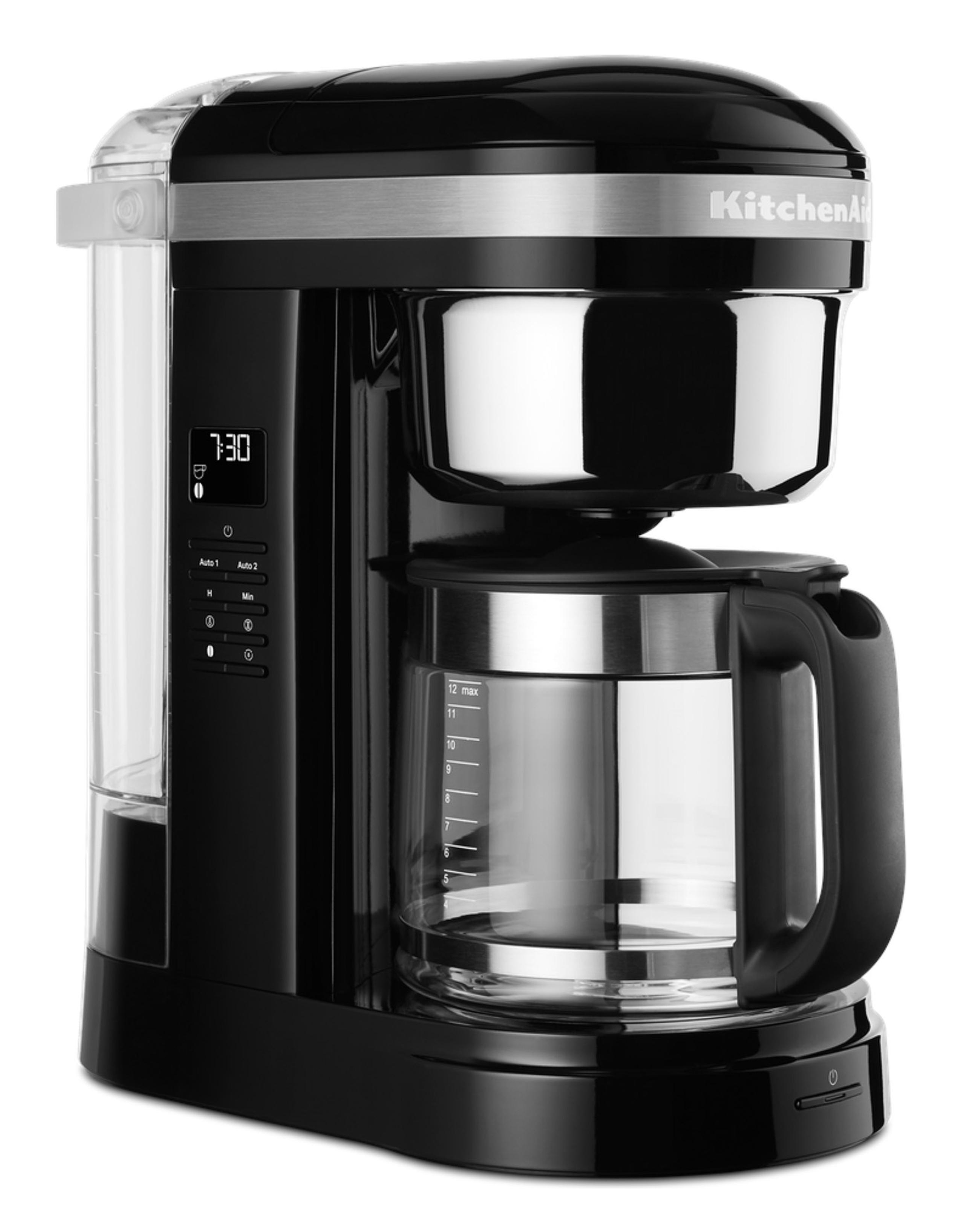 1,7 L-Filter-Kaffeemaschine für 12 Tassen mit spiralförmigem Wasserauslauf und einer programmierbaren Warmhalteplatte Einfach in der Benutzung, Bedientasten zur Auswahl der Brühstärke, Menge und des Brüh- oder Warmhaltevorgangs. Für frischen Kaffee mit der perfekten Temperatur (hoch und niedrig), selbst nach 40 Minuten. Wiederverwendbarer goldfarbener Permanentfilter mit Dosierungsanzeige und herausnehmbarem Wassertank mit großer Öffnung und Dosierungsgrafik Langlebig, einfach zu bedienen und zu reinigen, ersetzt den kegelförmigen Papierfilter. Einfaches Nachfüllen von Wasser, Vermeidung von Verschüttungen und benutzerfreundliche Bedienung. Zwei Brühtasten (eine an der Seite und die andere an der Vorderseite) und Programmiereinstellungen für zwei automatische Brühzeiten Einfache Bedienung und flexible Stellmöglichkeiten. Ermöglicht Programmiereinstellungen für zwei automatische Brühzeiten, damit Sie Ihren Kaffee unter der Woche sowie am Wochenende zu denen von Ihnen bestimmten Zeiten brühen können. 24-Stunden-Programmierung und intuitive One-Touch-Programmierung mit optimaler Temperaturkontrolle und einem eleganten, gut lesbaren LCD-Display Damit Ihr Kaffee zu jeder Tages- oder Nachtzeit für Sie bereit steht. Zur Aufrechterhaltung der optimalen Brühtemperatur während des gesamten Vorgangs. Leicht lesbare, einfache Bedienung ohne komplizierte Menüeinstellungen. Reinigungsanzeige und Reinigungszyklus Für die perfekte Tasse Kaffee in jedem Moment. 1,7 L-Glaskanne mit einzigartigem Auslauf und ergonomischem Griff Verhindert das Tropfen und Verschütten und sorgt so für ein müheloses Ausgießen. Für ein einfaches und komfortables Ausgießen. Brühstärken-Auswahltaste Ermöglicht die Auswahl der Kaffeestärken von mild bis kräftig und garantiert so jedes Mal eine vollmundige Tasse Kaffee. Pausieren und Ausgießen; nach Ablauf der gewünschten Warmhaltezeit schaltet sich die Kaffeemaschine automatisch ab. Um bereits vor Abschluss des Brühvorgangs eine köstliche Tasse Kaffee zu genießen.
