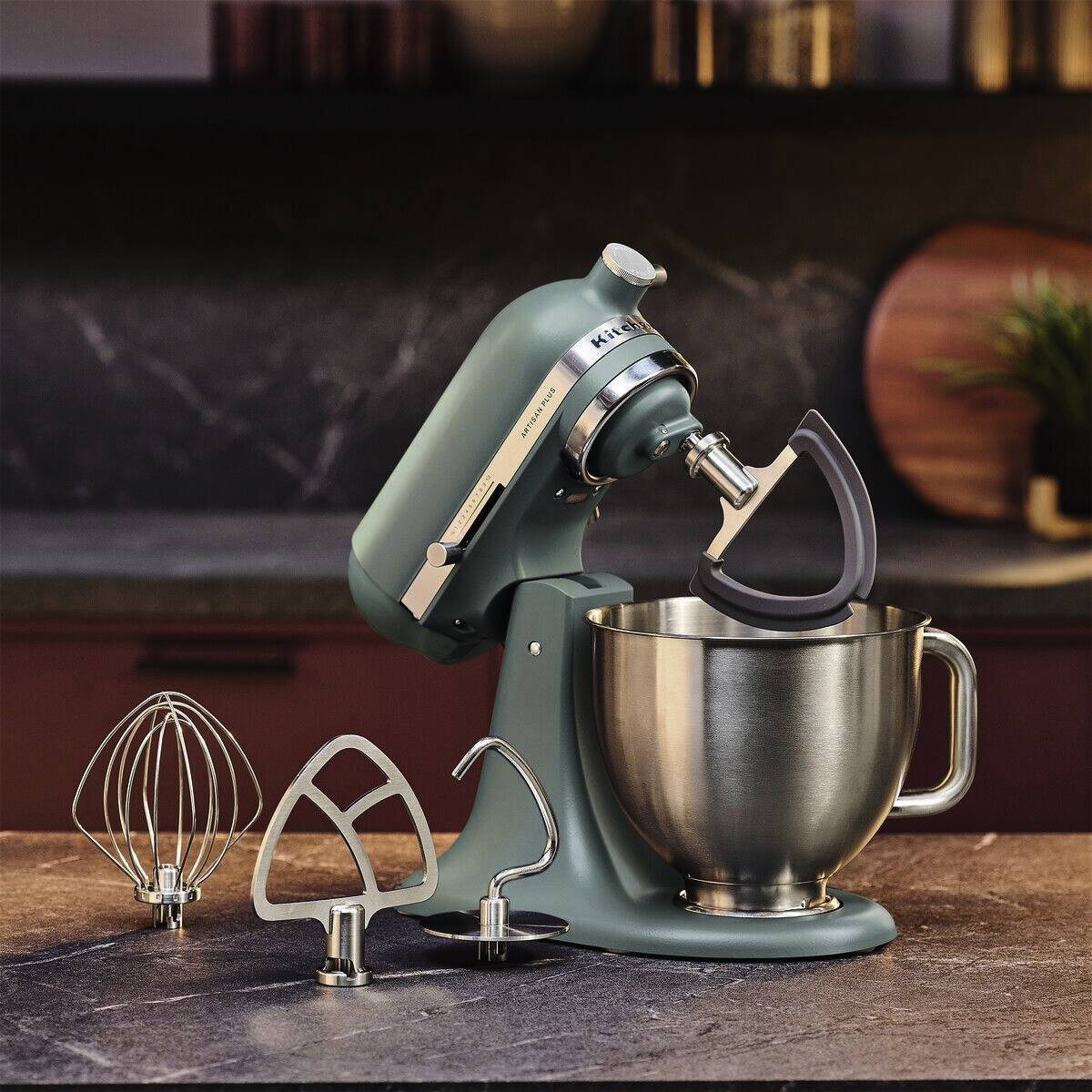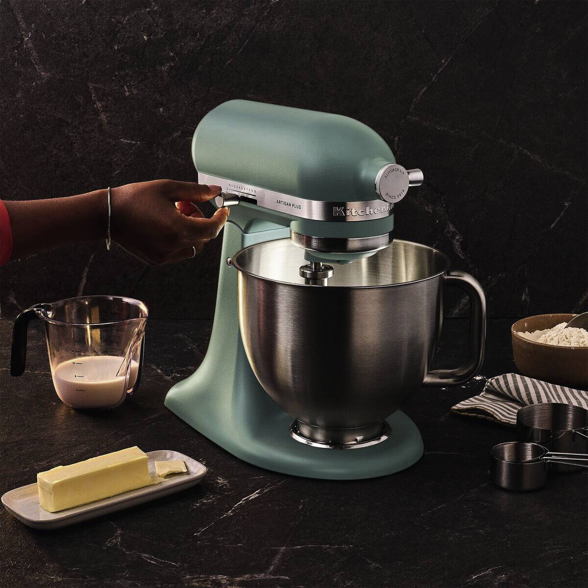 Setzen Sie Ihre Rezepte perfekt in Szene Sie werden die Artisan Plus lieben – die erste Küchenmaschine von KitchenAid mit integrierter Schüsselbeleuchtung. Beobachten Sie, was passiert, während Sie mischen und sehen Sie, wie Ihre Kreationen Gestalt annehmen. Wechseln Sie im Handumdrehen zwischen Geschwindigkeitsstufen mit der präzisen Geschwindigkeitseinstellung, um die ideale Textur zu erhalten. Das tägliche Kochen wird zum Kinderspiel – von Stampfkartoffeln bis hin zu zerkleinertem Hähnchenfleisch und cremiger Guacamole. Entdecken Sie, wie jedes Detail der Artisan Plus Ihnen noch mehr Möglichkeiten in der Küche gibt. Entwickelt für perfekte Ergebnisse Die Artisan Plus Küchenmaschine wurde entwickelt, um dank ihres leistungsstarken Motors auch feste und schwere Teige mit Leichtigkeit zu bewältigen. Aber sie glänzt nicht nur mit ihrer starken Leistung. Wie alle unsere Küchenmaschinen verfügt auch sie über das Planetenrührwerk von KitchenAid. Das bedeutet, dass sich die Zubehörnabe in eine Richtung dreht und das Zubehörteil in die andere Richtung. Dadurch wird sichergestellt, dass die Zutaten gleichmäßig vermischt werden und nichts übrig bleibt. Da der Rührer mindestens 59 Berührungspunkte in der gesamten Schüssel erreicht, erhalten Sie jedes Mal eine gründliche, gleichmäßige Mischung. Finden Sie die passende Geschwindigkeit Wählen Sie schnell und zuverlässig aus elf voreingestellten Geschwindigkeitsstufen oder drehen Sie den praktischen Regler, um die präzise Geschwindigkeitseinstellung zu aktivieren. Mit dieser Funktion können Sie mühelos zwischen den Stufen wechseln, sodass Sie genau die Geschwindigkeit wählen können, die Sie für Ihr Rezept benötigen. Vom Aufschlagen von Sahne bis hin zum Kneten von Teig – Sie erhalten jedes Mal die ideale Konsistenz – ohne Rätselraten, sondern durch mühelose Präzision. Sehen Sie Ihre Kreationen in einem ganz neuen Licht Die Artisan Plus Küchenmaschine ist das erste Modell von KitchenAid mit integrierter Schüsselbeleuchtung, damit Sie jedes Detail Ihres Rezepts sehen können. Die integrierte Schüsselbeleuchtung schaltet sich automatisch ein, wenn der Kopf abgesenkt wird oder die Küchenmaschine in Betrieb ist. Sie können sie aber auch mit einer einfachen Drehung des Geschwindigkeitsreglers einschalten, wann immer Sie möchten. Mit der Maschine bleibt kein Stäubchen Mehl zurück und Sie können jederzeit die Textur überprüfen. So sind Klarheit und Sicherheit bei jeder Mischung garantiert. Nichts wird verschwendet Dank der flexiblen Silikonkanten schabt der doppelseitige Flexi-Rührer beim Mischen sanft die Schüssel ab, sodass man dies nicht mehr von Hand tun muss. Es ist ein einfaches Upgrade, das einen großen Unterschied beim täglichen Mischen macht. Robustes Zubehör für jeden Einsatz Jede Artisan Plus Küchenmaschine wird mit einem kompletten Satz Edelstahlzubehör geliefert – einer präzisionsgeschweißten Schüssel, einem doppelseitigen Flexi-Rührer, einem Knethaken, einem Schneebesen und einem Flachrührer. Spülmaschinenfest und für die Verarbeitung anspruchsvoller Mischungen und Ihrer Lieblingsgerichte entwickelt. Sanftes Unterheben, keine Spritzer Bei einigen Rezepten muss man mit etwas mehr Gefühl arbeiten. Deswegen bietet die Artisan Plus eine ½ Geschwindigkeitsstufe – perfekt zum vorsichtigen Mischen leichter, luftiger Zutaten, ohne dass diese an Fluffigkeit verlieren. Und mit Soft Start beginnt die Maschine bei jeder Mischung ganz sanft und erhöht allmählich die Geschwindigkeit, damit Mehl, Zucker und Kakao dort bleiben, wo sie hingehören – in der Schüssel. Noch mehr Möglichkeiten Die Artisan Plus Küchenmaschine ist ein Kraftpaket, das weit mehr kann als nur Backen, sondern auch beim Zerkleinern, Kneten und vielem mehr besticht. Holen Sie sich optionales Zubehör aus unserem stetig wachsenden Sortiment, und Sie können noch mehr kreieren. Probieren Sie alles von Eiscreme und frischer Pasta bis hin zu geschnittenem Gemüse und zerkleinertem Fleisch. Ikonisches Design, leuchtende Farben Eine KitchenAid Küchenmaschine ist mehr als nur eine Küchenmaschine – sie ist ein Statement und eine Ikone. Die Artisan Plus ist in dezenten neutralen Tönen und knallig-hellen Farben erhältlich. Jeder Farbton lädt Sie dazu ein, Persönlichkeit und Freude in Ihre Küche zu bringen. Mit den neuen Premium-Farben ist jetzt die perfekte Gelegenheit, um Ihren Stil zum Ausdruck zu bringen. Ihre Küche, Ihre Mischung, Ihr Moment.