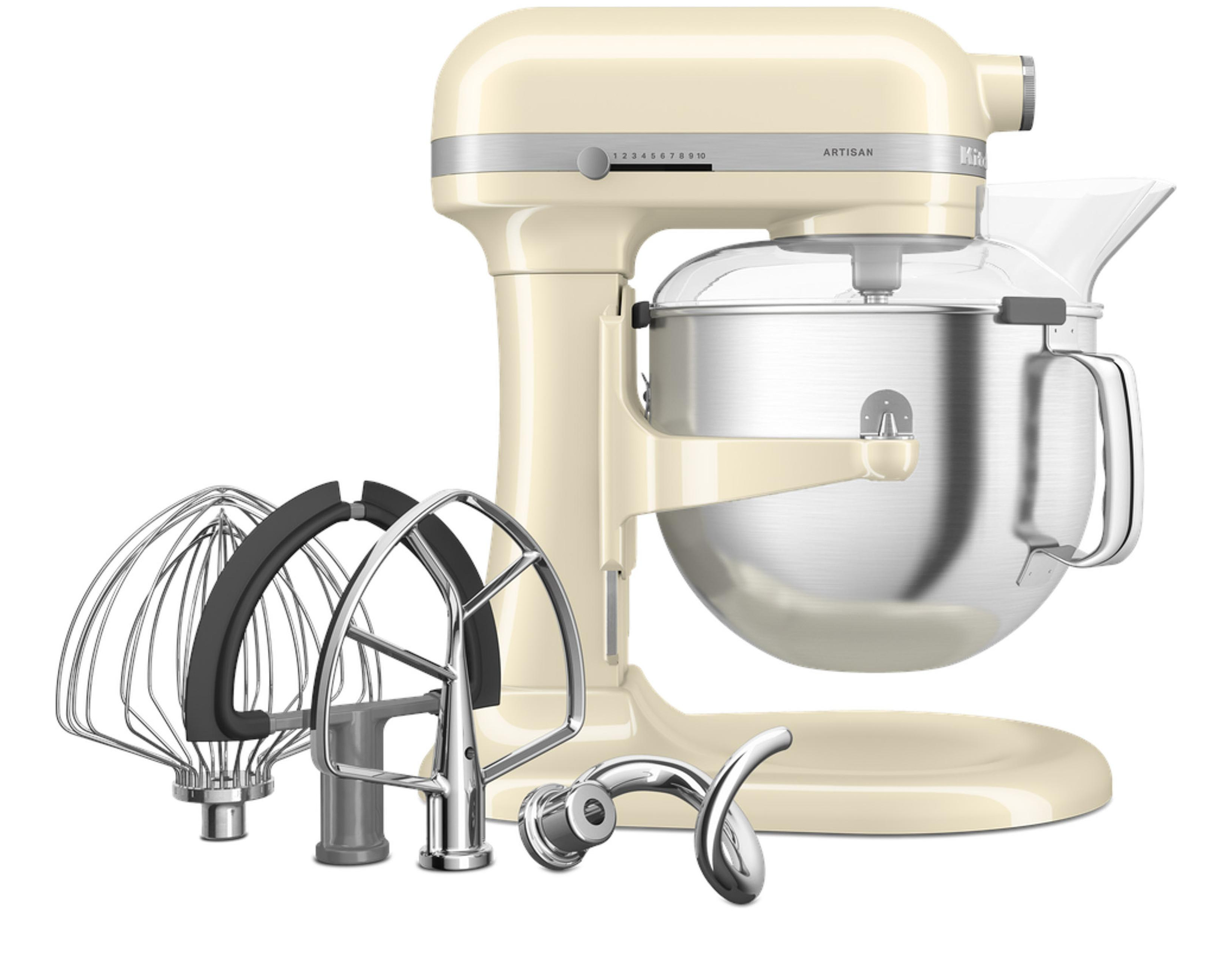 Die leistungsstärkste Küchenmaschine mit Schüsselheber von KitchenAid präsentiert sich in einem vollkommen neuen Design und bietet 1,5 Mal mehr Leistung als je zuvor* Kann mehr als je zuvor. Knetet 3,9 kg Brotteig** und meistert auch schwierige Aufgaben mühelos Das Schüsselheber-Design bietet eine 3-Punkt-Verriegelung Für maximale Stabilität* und leistungsstarkes Vermengen Hitzeabschaltung Die Küchenmaschine schützt sich selbst und schaltet sich bei Überhitzung ab Ganzmetallgehäuse, Metallgetriebe und Wärmeschutz Zuverlässige Ergebnisse und Langlebigkeit Neues Design mit Kabelaufwicklung, zweifarbiger abnehmbarer Abdeckung der Zubehörnabe und gestreiftem Trimmband mit Prägung sowie Nabenrändelschraube, Auswurf und Geschwindigkeitsregler aus Spritzgussmetall Einfach zu reinigen und zu bedienen Schüssel mit einer Kapazität von 6,6 l aus gebürstetem Edelstahl mit ergonomischem Griff Wird leicht mit kleinen und großen Mengen fertig 11 verschiedene Geschwindigkeitsstufen (von niedrigen Geschwindigkeiten zum Unterheben bis hin zu hohen Geschwindigkeiten zum Schlagen) einschließlich einer neuen Geschwindigkeit zum Unterheben mit halber Rührgeschwindigkeit Für Präzision, Leistung und Kontrolle von schnell bis langsam und bei allem dazwischen Die Geschwindigkeitsstufe zum Nachahmen des Unterhebens per Hand: Damit heben Sie vorsichtig empfindliche Zutaten, Eiweiß oder Sahne unter, der Teig wird luftig und übermäßiges Rühren verhindert Soft Start Eine langsame Beschleunigung auf die gewünschte Geschwindigkeit sorgt dafür, dass die Küche sauber bleibt Original-Planetenrührwerk Schnelles und gründliches Mischen, Kneten, Rühren Eine Zubehörnabe für viele Vorsätze Große Auswahl an optionalem Zubehör verfügbar Vielseitig und leicht zu bedienen Der silberbeschichtete, doppelte Flexi-Rührer weist eine Verwindung und zwei flexible Kanten auf Schabt die Seiten und den Boden der Schüssel ab und minimiert so Abschaltpausen, um festklebende Reste manuell abzuschaben. Für leichtes Vermengen und Reinigen Flachrührer, Knethaken und ein einzigartiger spiralförmiger Knethaken aus Edelstahl, der das Kneten von Hand nachahmt Robust, langlebig und spülmaschinenfest im Oberkorb. Zur schnellen Zubereitung von köstlichem Brot Passgenauer Spritzschutz mit verbessertem Design Sorgt dafür, dass die Zutaten beim Mixen in der Schüssel bleiben