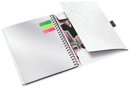 Leitz Collegeblock WOW Be Mobile; Lineatur: liniert; Spiralbindung; Mit Mikroperforation und Abtrennfunktion; Mit Lochung 8x8x8 cm; Mit Stiftelasche; Mit Gummizugverschluss; Kopfzeile sowie seitliche Begrenzungslinien auf jedem Blatt; Mit beschriftbarem Inhaltsverzeichnis; Mit 3 herausnehmbaren Trennblättern 0,35 mm, die auch als Lesezeichen geeignet sind; Rückdeckel mit 3 integrierten Klappen zur Aufbewahrung von bis zu 60 losen Blättern, mit 3 x 15 Haftnotizen auf herausnehmbarem PP-Blatt; Material: Polyproplyen (PP); Format: DIN A4; Blatt: 80, 80 g/qm; Papier FSC-zertifiziert; Farbe: weiß;