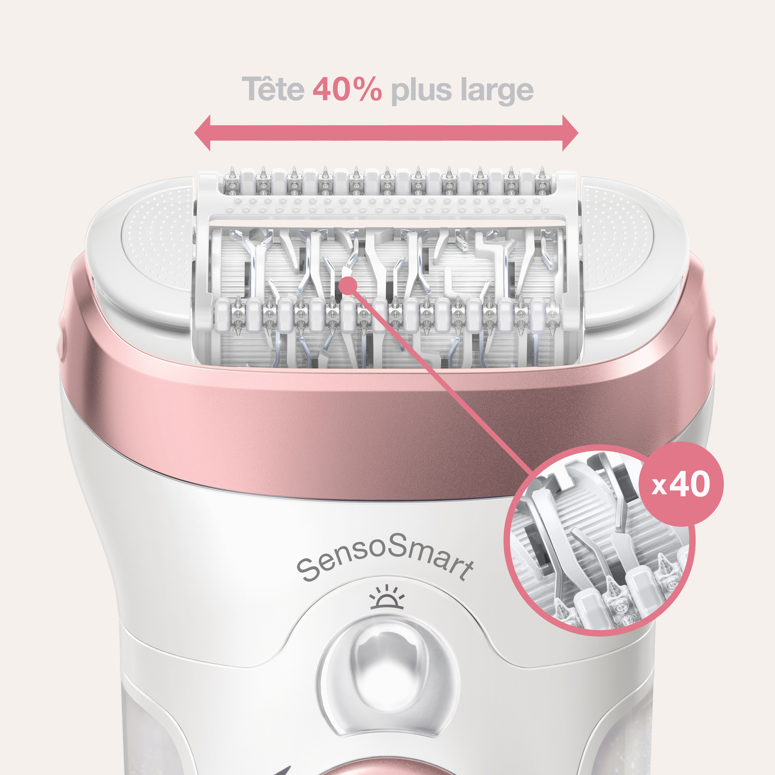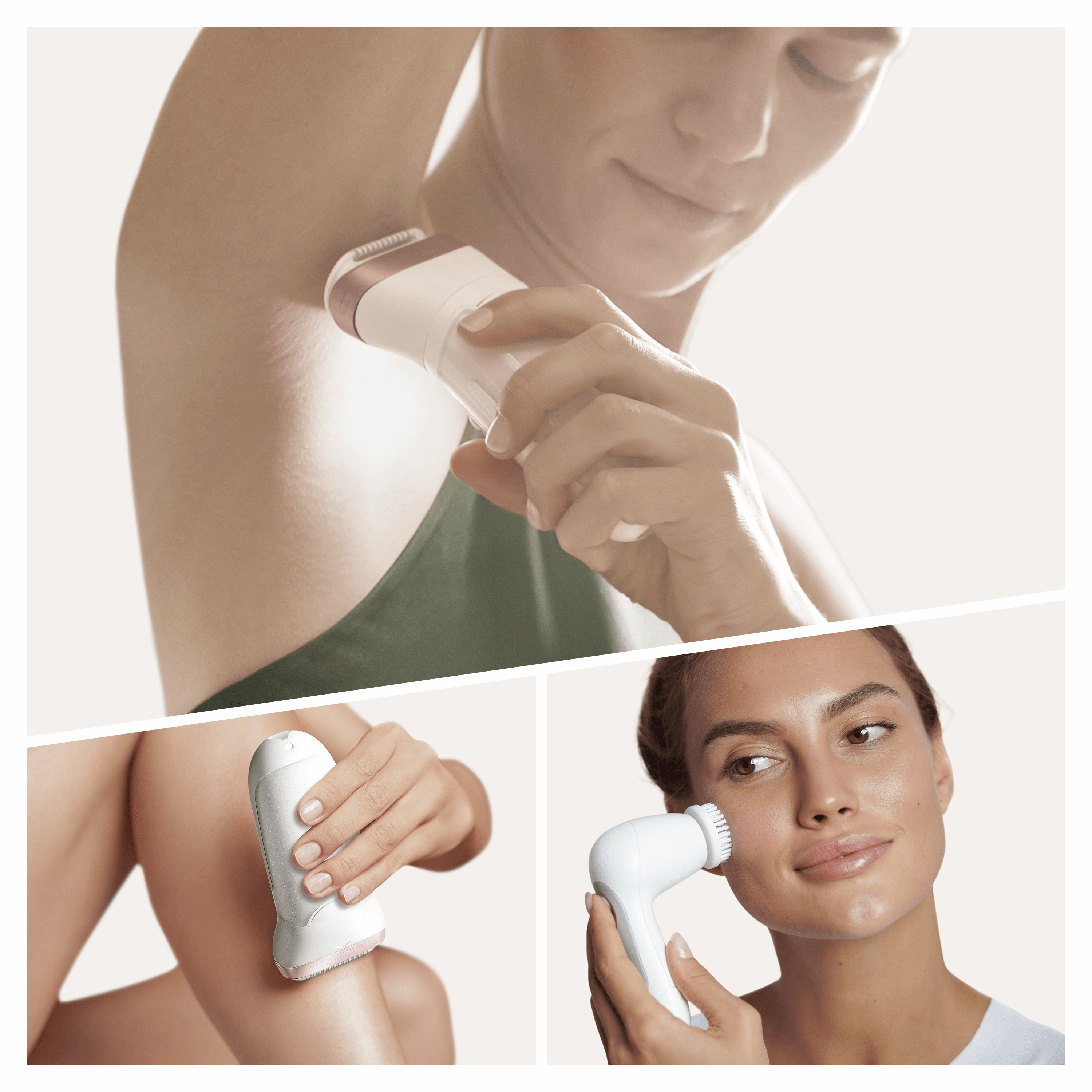 Der Braun Silk-épil mit einem breiten Kopf für eine besonders schnelle Epilation. Die Micro-Grip-Technologie und der 40% breitere Kopf entfernen selbst die kürzesten Härchen (0,5 mm) – für wochenlang glatte Haut. Mit dem Rasier- und Trimmeraufsatz können empfindliche Bereiche behandelt werden. Der Epilierer für Frauen ist 100% wasserdicht und kann problemlos in der Badewanne oder Dusche verwendet werden, was das Schmerzempfinden deutlich reduziert. Im Lieferumfang enthalten: 1x Epilierer, 1x Rasieraufsatz, 1x Trimmeraufsatz, 1x Gesichtsreinigungsbürste, 1x Ladegerät