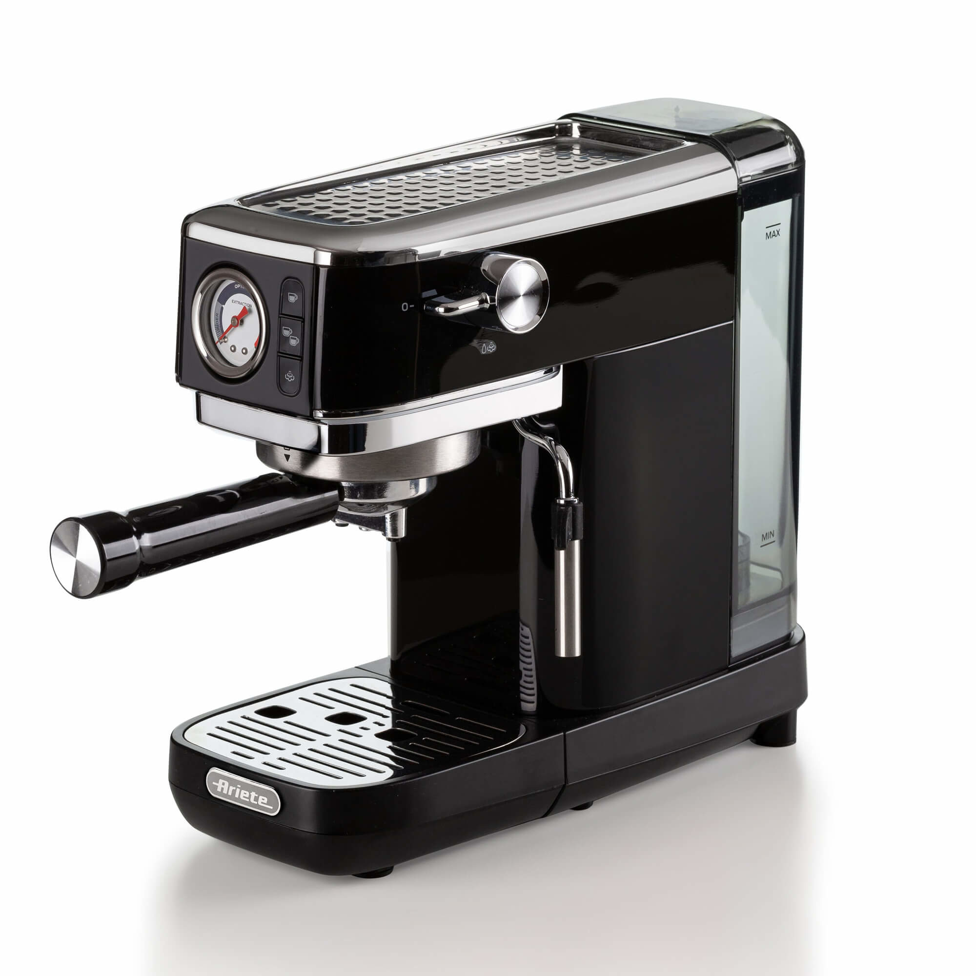 Volle Kontrolle, voller Geschmack – Ariete Slim Moderna Siebträgermaschine schwarzMit der Ariete Slim Moderna Siebträgermaschine schwarz haben Sie die Freiheit, verschiedene Bohnen und Zubereitungen auszuprobieren. Jede Tasse wird zu einer kleinen Entdeckungsreise.Alles, was Sie über das Brühsystem wissen müssenEin Espresso, der wie bei diesem Gerät per Siebträgermethode hergestellt wird, weist ein unvergleichliches Aroma auf. Wasserdampf wird hierbei mit hohem Druck durch das mit Espressopulver gefüllte Sieb gepresst. So gelangt das volle Aroma ins Endprodukt, jedoch ohne starke Bitterstoffe.Alles zu Gewicht und MaßeDer Artikel verfügt über einen Tank mit insgesamt 1,1 l. Das Modell ist 3,85 kg schwer. Des Weiteren hat es folgende Abmessungen:Breite: 14 cmTiefe: 34,0 cmHöhe: 29,0 cmDank der neutralen Farbe schwarz passt das Gerät wunderbar in jede Küche.Was Sie zur Bedienung wissen solltenDamit Sie unterschiedlich hohe Tassen immer bequem unter dem Ausguss platzieren können, lässt er sich in der Höhe verstellen. Per Tasten lässt sich das Produkt ganz einfach bedienen.MaterialeigenschaftenBestehend aus Edelstahl hat das Exemplar alle Vorteile dieses Materials, wie z.B. ein edles Äußeres und Strapazierfähigkeit.Die richtige PowerSie wollen Ihre Kaffeespezialität zügig, heiß und natürlich lecker? Dann sind Sie mit diesem Gerät bestens beraten, denn hier wird mit einer Leistung 1.300 W alles rasch zubereitet. Außerdem überzeugt die Hochleistungswasserpumpe mit einem Druck von 15 bar.Trifft, wonach Sie suchen?Bestellen können Sie die Ariete Slim Moderna Siebträgermaschine schwarz schnell und bequem hier bei uns online.