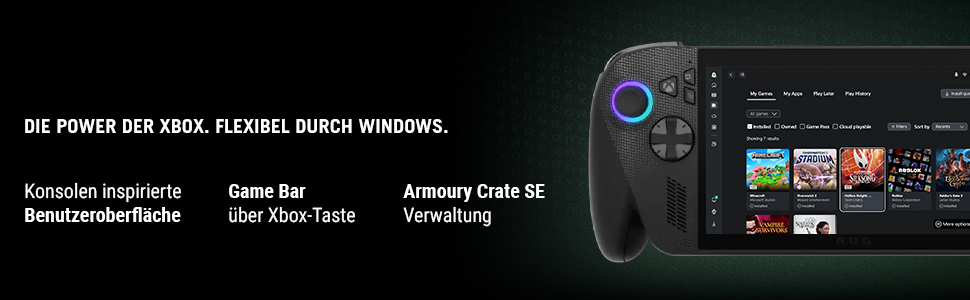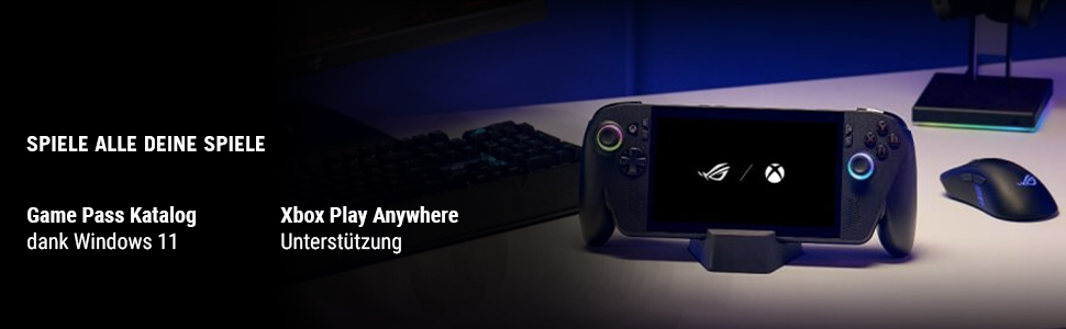 Der ROG Xbox Ally X ist ein leistungsstarker Gaming-Handheld, der speziell für Xbox- und PC-Gaming unterwegs entwickelt wurde. Mit einem AMD Ryzen AI Z2 Extreme Prozessor, 24 GB LPDDR5X RAM und einer 1 TB PCIe 4.0 SSD bietet er Desktop-Performance im kompakten Format. Das 7-Zoll-FHD-Display mit 120 Hz und AMD FreeSync Premium sorgt für flüssiges Gameplay, während Dolby Atmos und AI-Rauschunterdrückung ein immersives Audioerlebnis liefern. Dank Windows 11 Home, Xbox Cloud Gaming und Remote Play ist der Ally X bereit für Gaming ohne Grenzen überall und jederzeit.> Highlights- AMD Ryzen AI Z2 Extreme Prozessor (8 Kerne, 16 Threads, bis zu 5.0 GHz)- AMD Radeon Grafik mit AI-NPU (bis zu 50 TOPS)- 24 GB LPDDR5X RAM (Dual-Channel)- 1 TB PCIe 4.0 NVMe M.2 SSD (2280)- 17,78 cm (7 Zoll) FHD IPS-Display (1920 x 1080), 120 Hz, 500 Nits, Gorilla Glass Victus + DXC- AMD FreeSync Premium für variable Bildwiederholrate- Windows 11 Home Betriebssystem- Dolby Atmos, Hi-Res Audio, AI-Rauschunterdrückung- 2 Lautsprecher + Array-Mikrofon- Steuerung: Hall-Effekt-Trigger, HD-Haptik, 6-Achsen-Gyrosensor, Thumbsticks, D-Pad, Xbox-Taste, Armoury Crate- Anschlüsse: USB 3.2 Gen 2 Type-C, USB 4 (Thunderbolt 4), 3.5 mm Audio, UHS-II microSD-Kartenleser- Wi-Fi 6E (Triple Band), Bluetooth 5.2- Akku: 80 Wh, 4-Zellen Li-Ion> Produkttyp- Spielekonsole- ear-Kategorie (ElektroG): relevant, Kategorie 5: Kleingeräte < 50 cm (alle Seiten), Kleingeräte B2C> Versand- WEEE: 38765828> Speicher- Interner Speicher: 1 TB- Arbeitsspeicher: 24 GB- Speichermedium: microSD> Display- Displaydiagonale Zoll: 7 -- Displaydiagonale cm: 17.8 cm- Displayhighlights: 100% sRGB; Gorilla Glass Victus; 120 Hz Bildfrequenz; 500 Nits Bildschirmhelligkeit; AMD FreeSync Premium- Displaytechnologie: IPS-LCD- Touchdisplay- Displayart: Farbe- Displaybeleuchtung> Stromversorgung- Akku-/Batterie-Technologie: Li-Ion - Lithium-Ionen- Akkutyp: gerätespezifischer Akku- Anzahl Akkus/Batterien: 1- Akku verbaut: in Gerät eingebaut- Energie: 80 Wh- Anzahl Zellen Akku/Batterie: 4- Ladeleistung min.: 45 W- Ladeleistung max.: 65 W- Ladenetzteil enthalten: Ja- Ladefunktion Power Delivery (PD): Ja> Grundeigenschaften- Farbe: Schwarz- Höhe: 12.1 cm- Länge/Tiefe: 2.75 cm- Breite: 29 cm- Gewicht: 715 g> Lieferumfang- ROG Xbox Ally X Gaming-Handheld- Netzteil (65 W)- USB-C Kabel- Kurzanleitung