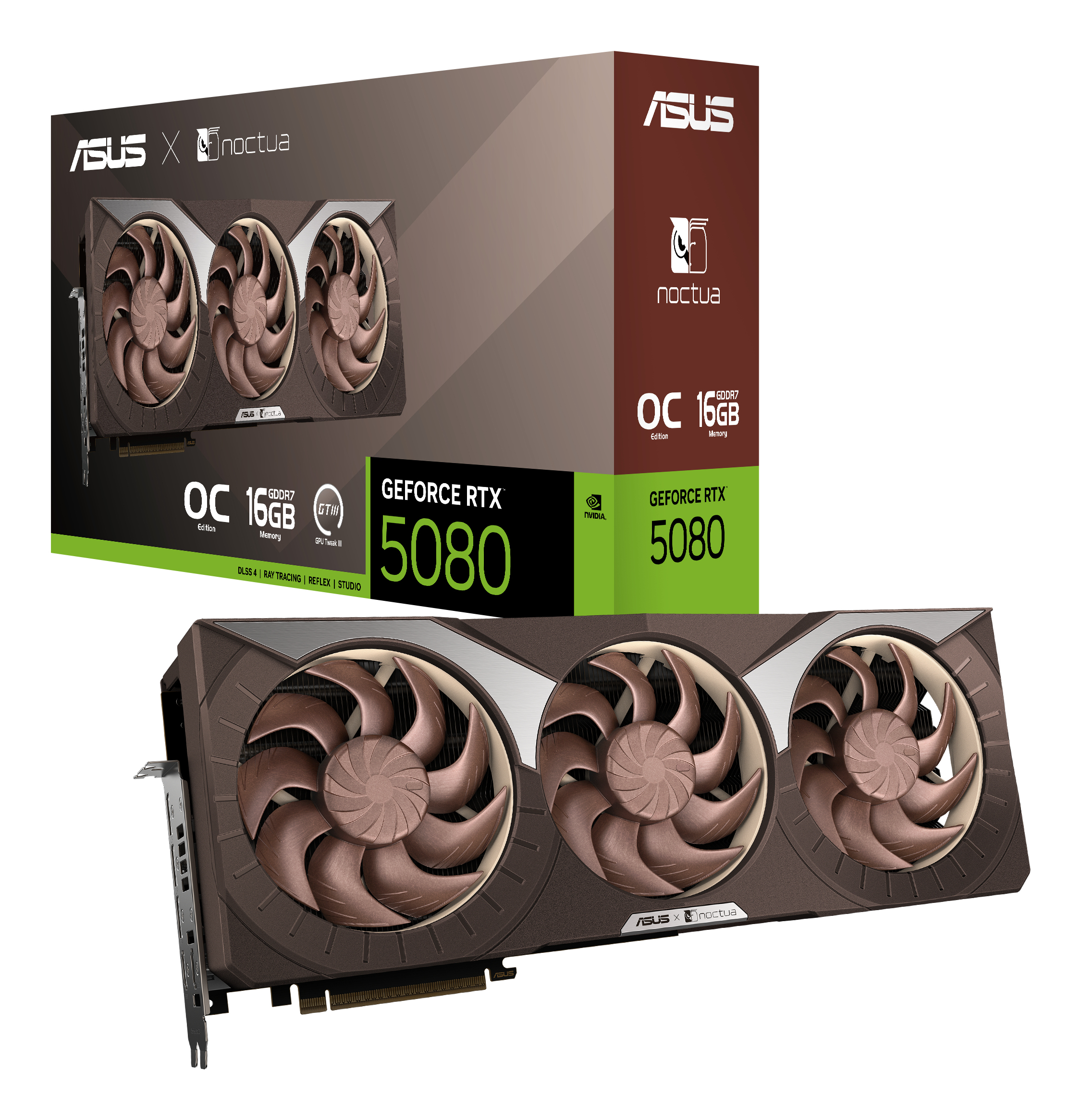 DLSS 4, 3x DisplayPort, 2x HDMI 2.1 Die ASUS GeForce RTX 5080 Noctua OC Edition ist eine High-End-Grafikkarte mit der GeForce RTX 5080 GPU von NVIDIA. Die leistungsfähigen GeForce RTX 50-Grafikkartenserie basiert auf der NVIDIA Blackwell Architektur und b