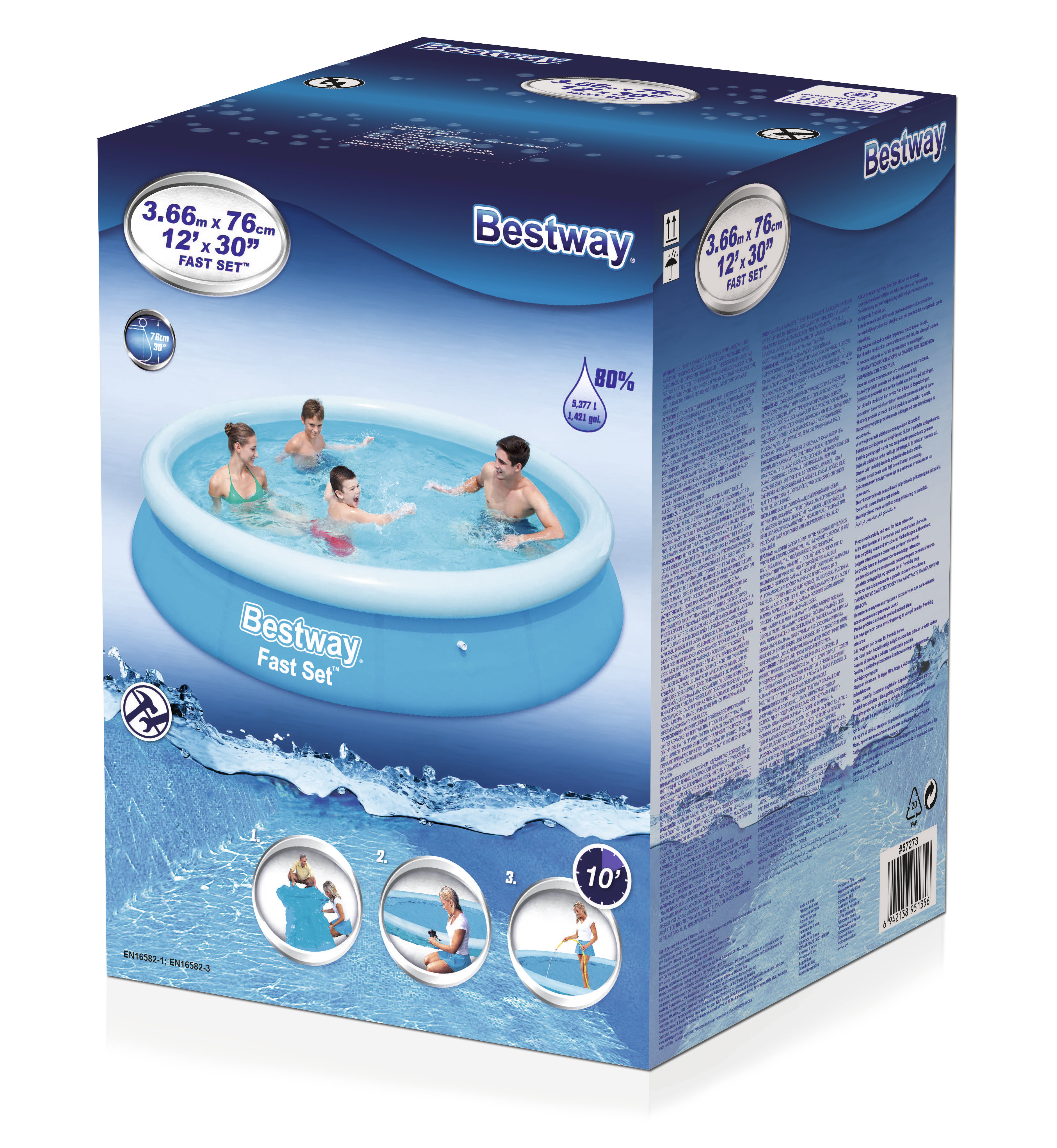 Bestway® Fast Set™ Aufstellpool ohne Pumpe Ø 366 x 76 cm , blau, rund • Konstruktion: · Größe: Ø 366 x 76 cm · Wasserkapazität (80%): 5.377 Liter · Robustes, 3-lagiges DuraPlus™ -Material · Anschlussmöglichkeit eines Filtersystems (Ø 32 mm) • Desi