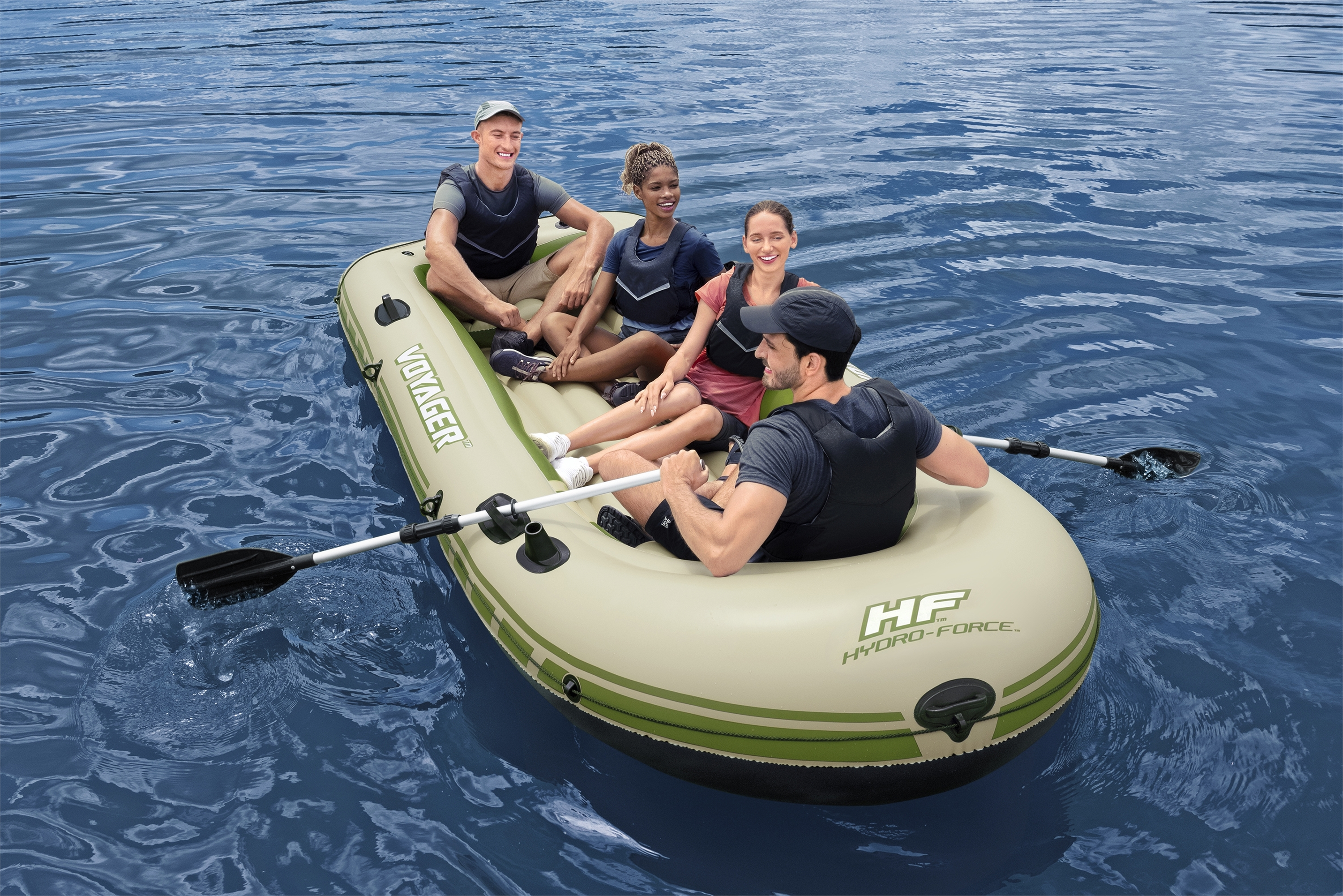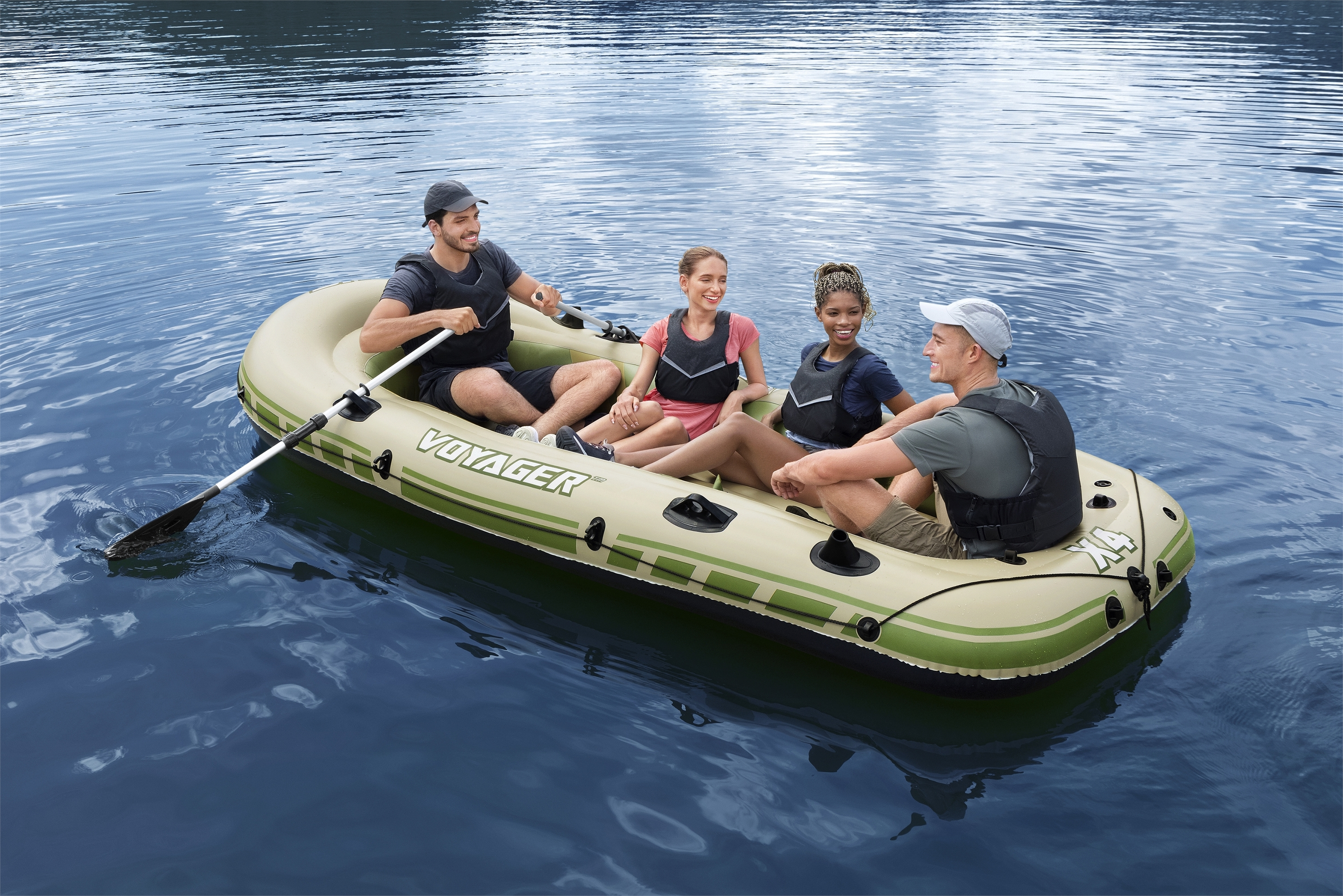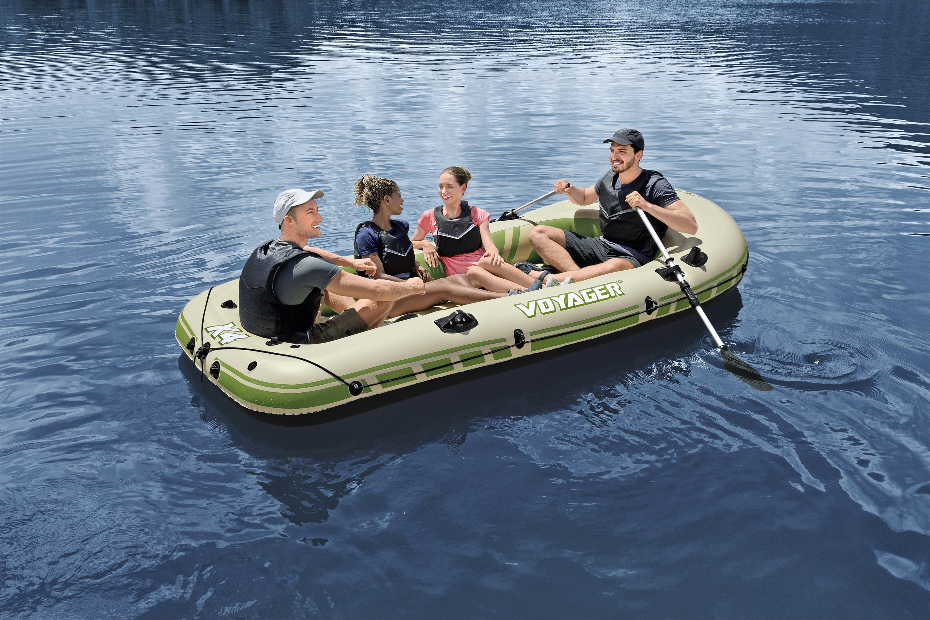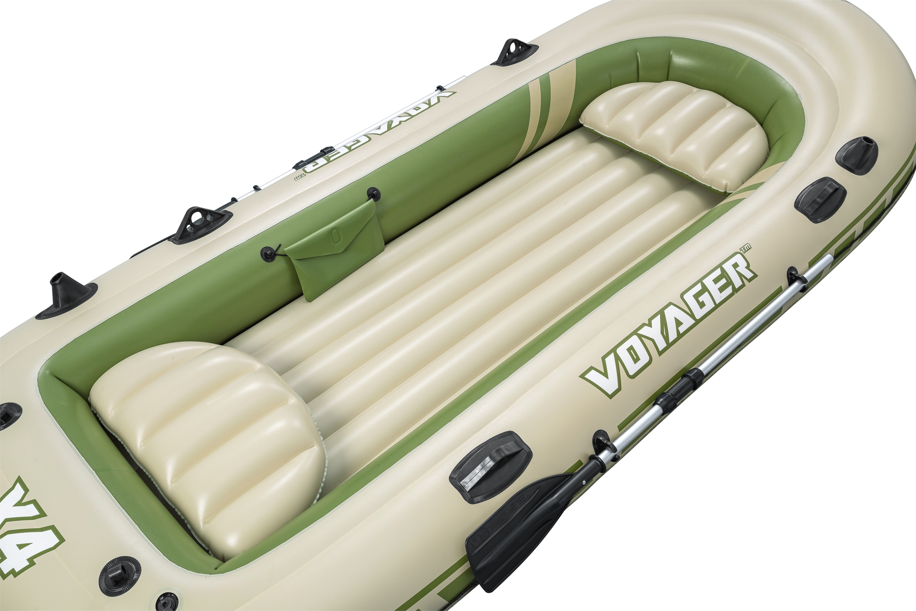 Bestway® Hydro-Force™ Schlauchboot Komplett-Set Voyager™ X4 350 x 145 x 49 cm Konstruktion: Größe aufgeblasen: 350 x 145 x 49 cm Maximale Belastbarkeit: 480 kg 3 Luftkammern Aus reißfestem Inflata-Shield™ -Material GS-zertifiziert (TÜV R