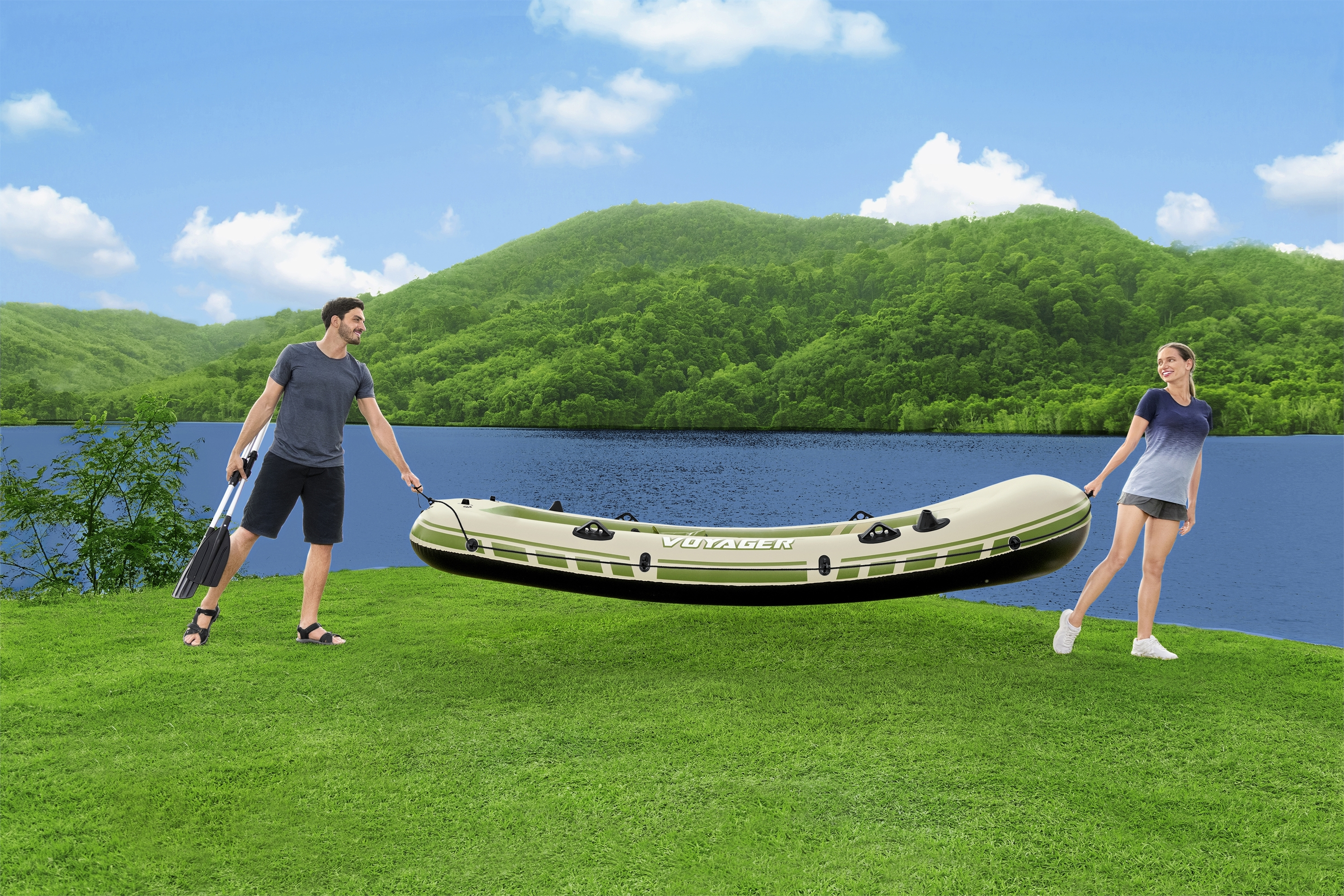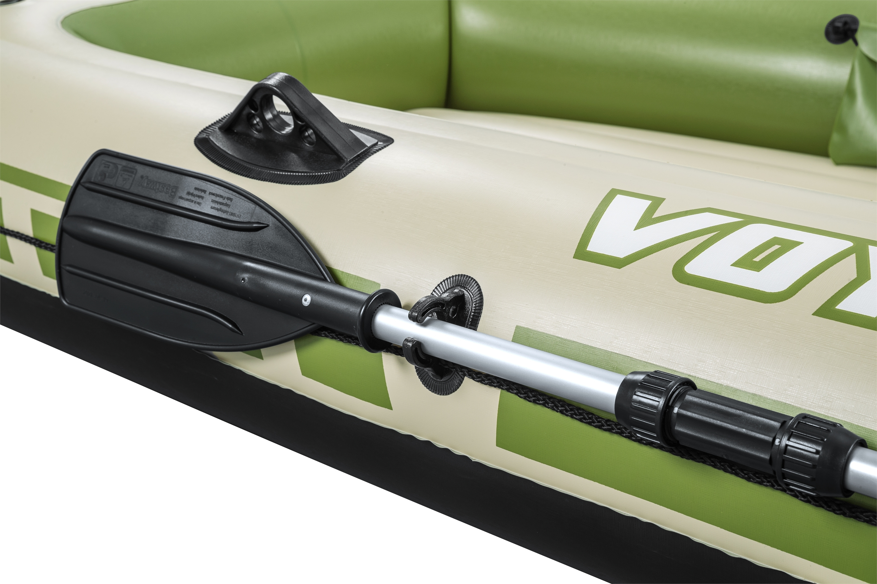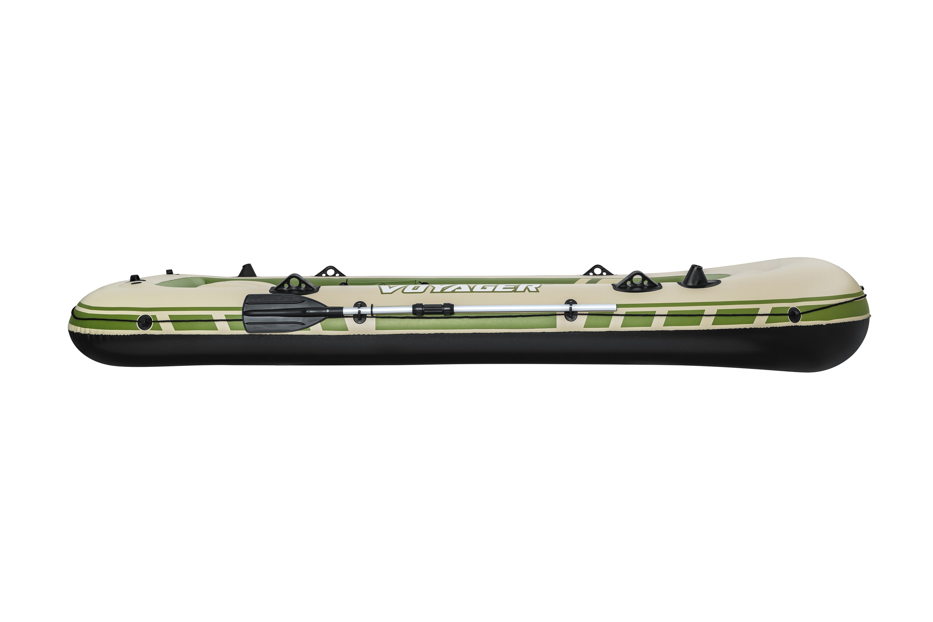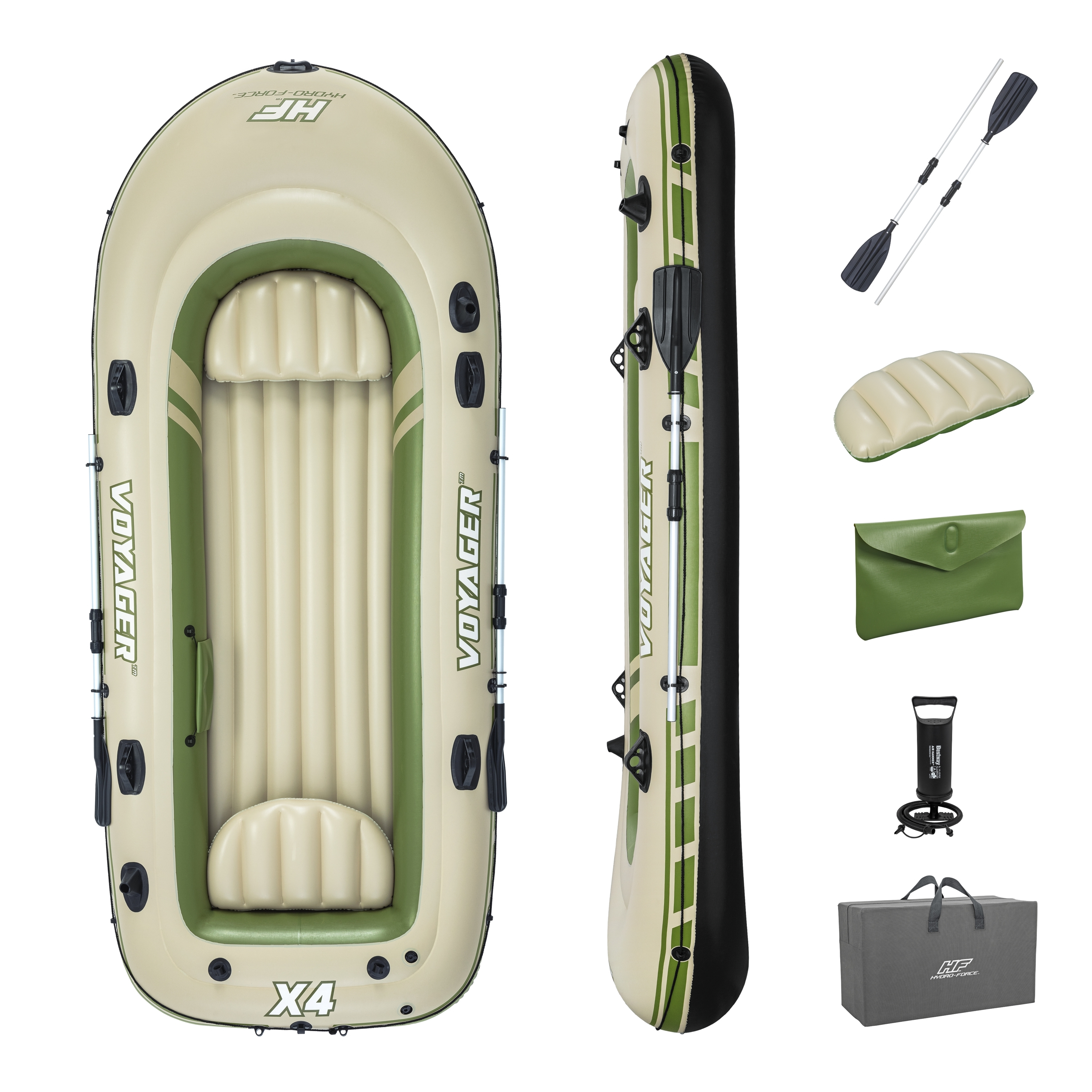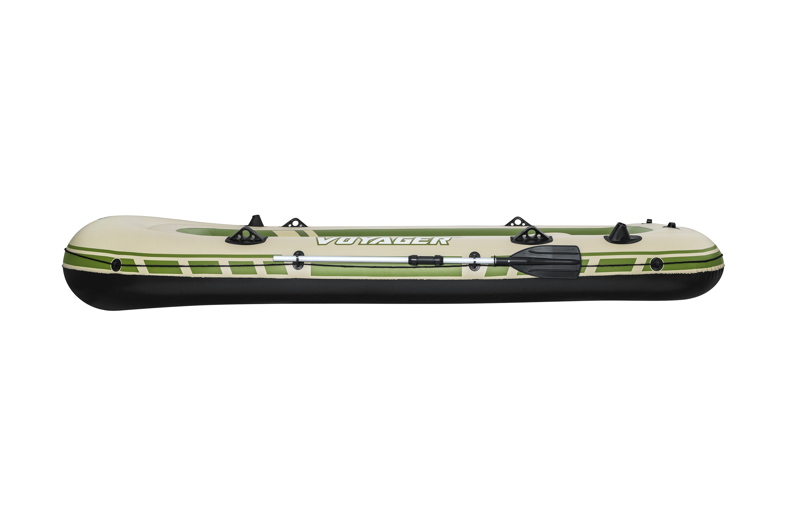 Bestway® Hydro-Force™ Schlauchboot Komplett-Set Voyager™ X4 350 x 145 x 49 cm Konstruktion: Größe aufgeblasen: 350 x 145 x 49 cm Maximale Belastbarkeit: 480 kg 3 Luftkammern Aus reißfestem Inflata-Shield™ -Material GS-zertifiziert (TÜV R