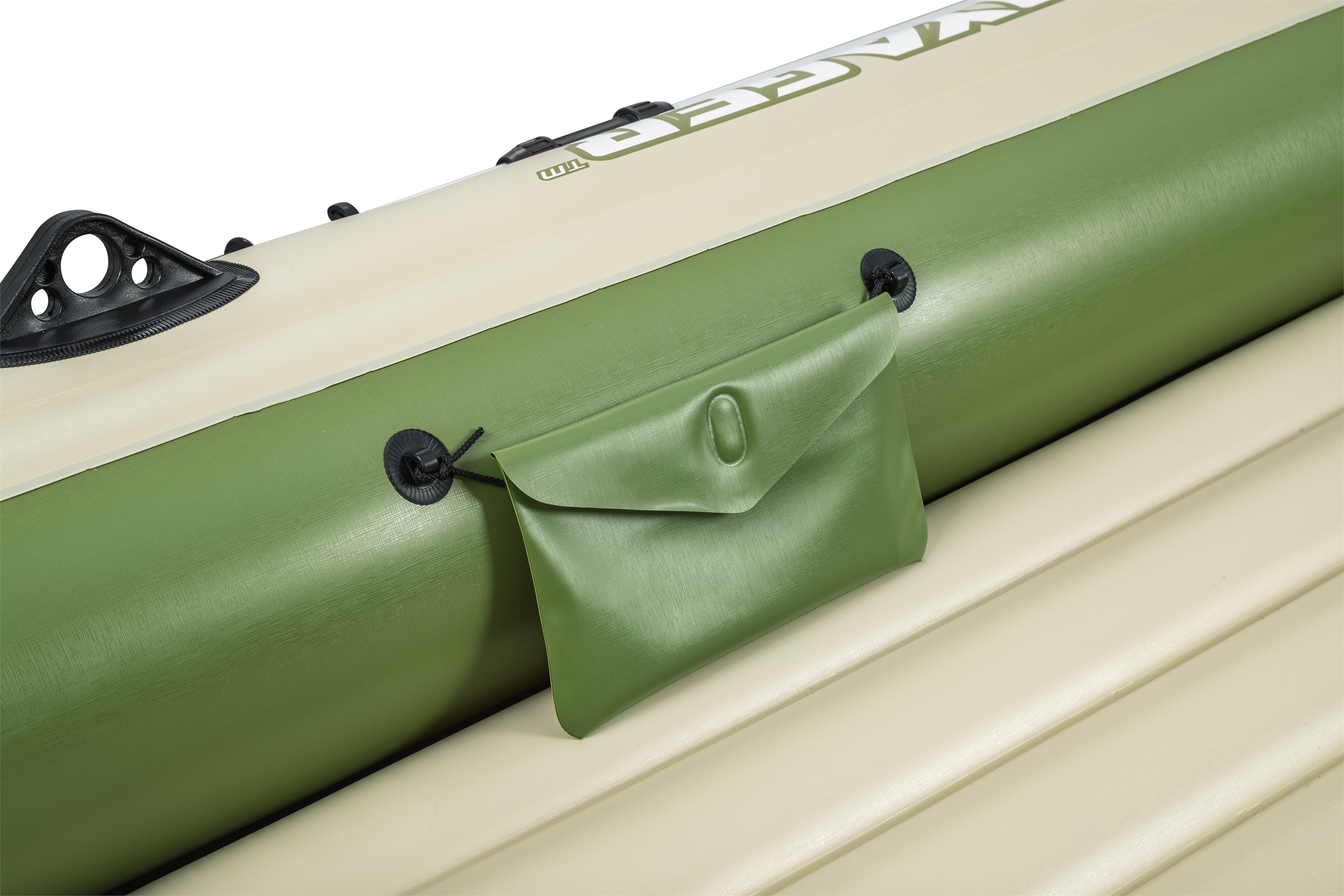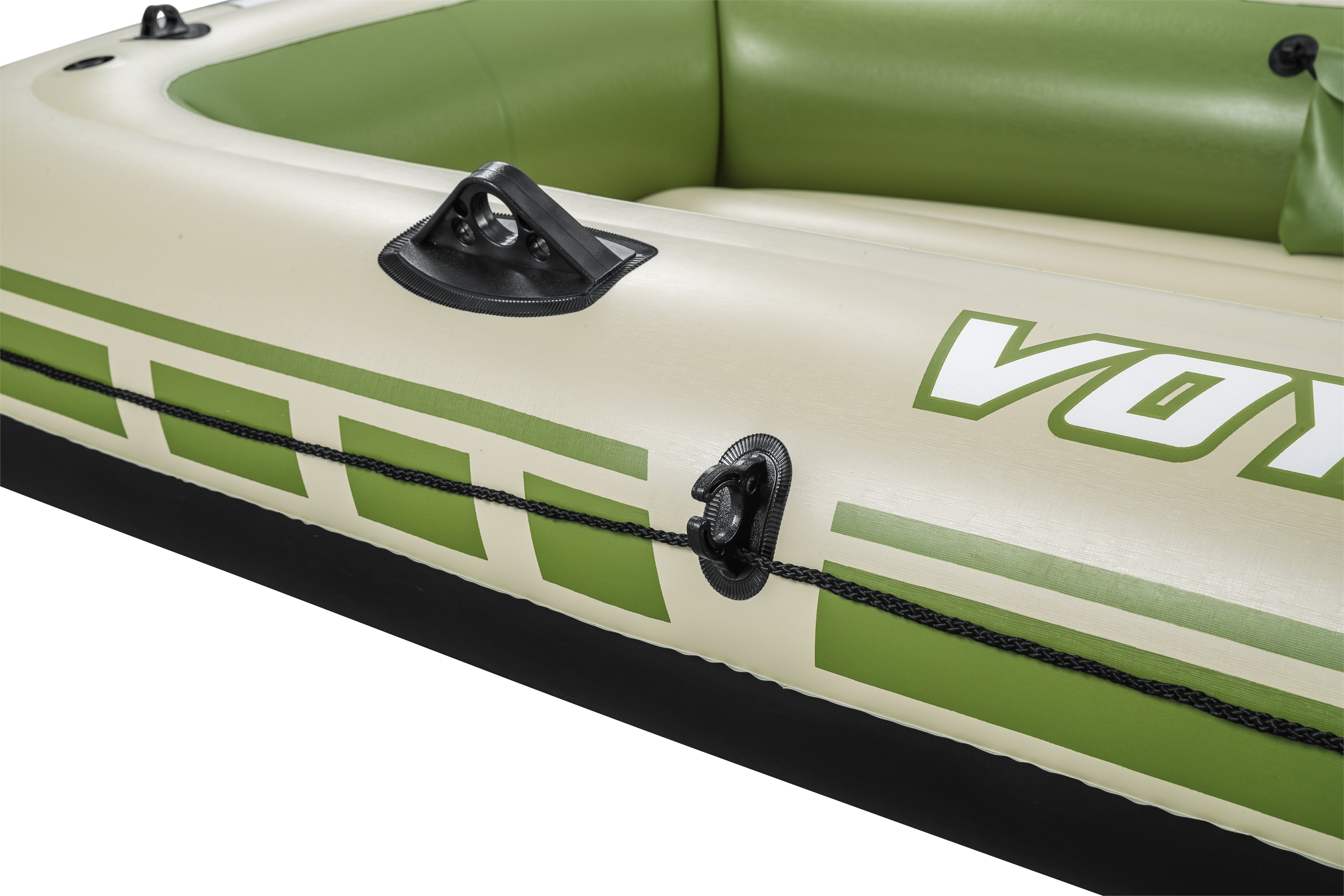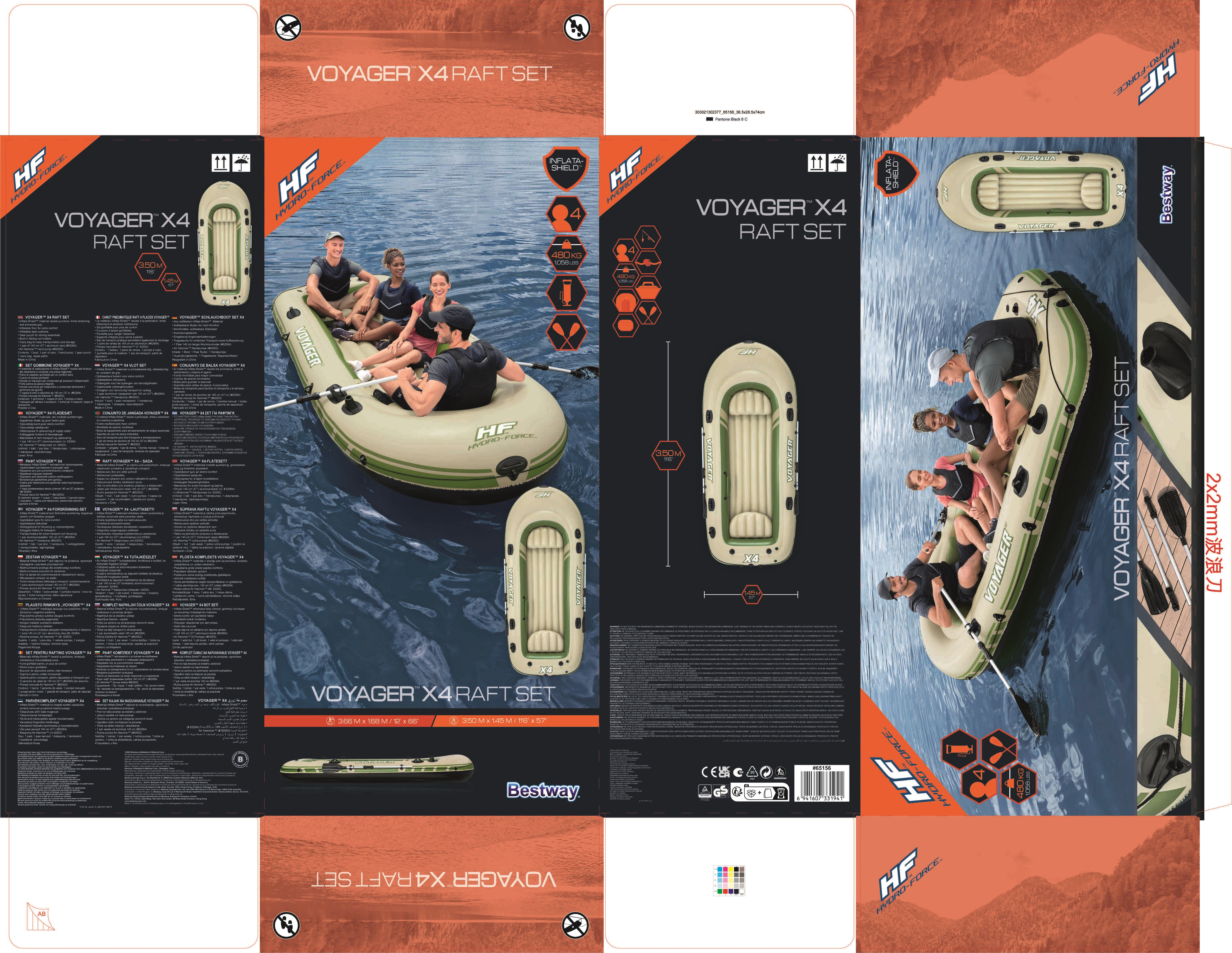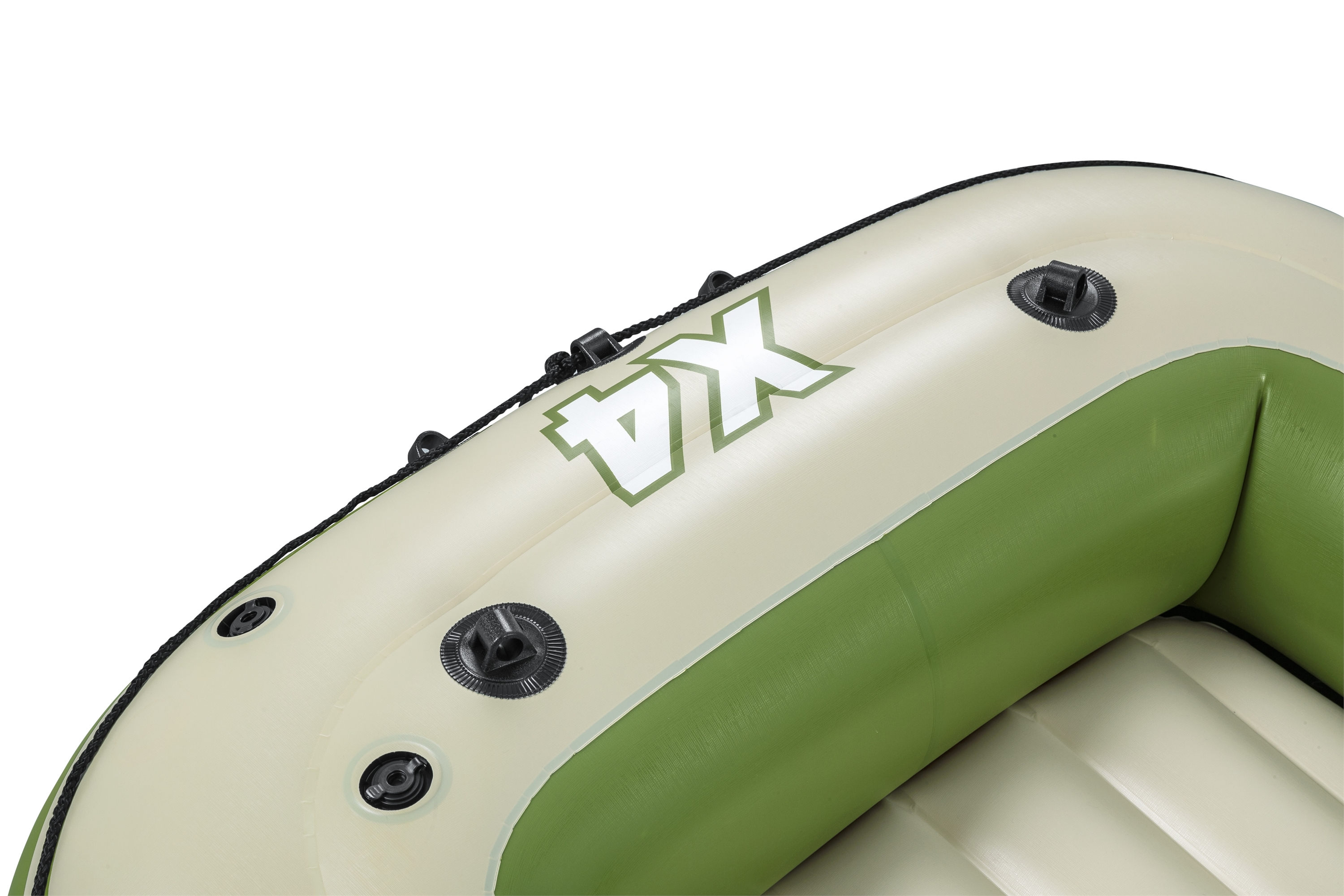 Bestway® Hydro-Force™ Schlauchboot Komplett-Set Voyager™ X4 350 x 145 x 49 cm Konstruktion: Größe aufgeblasen: 350 x 145 x 49 cm Maximale Belastbarkeit: 480 kg 3 Luftkammern Aus reißfestem Inflata-Shield™ -Material GS-zertifiziert (TÜV R