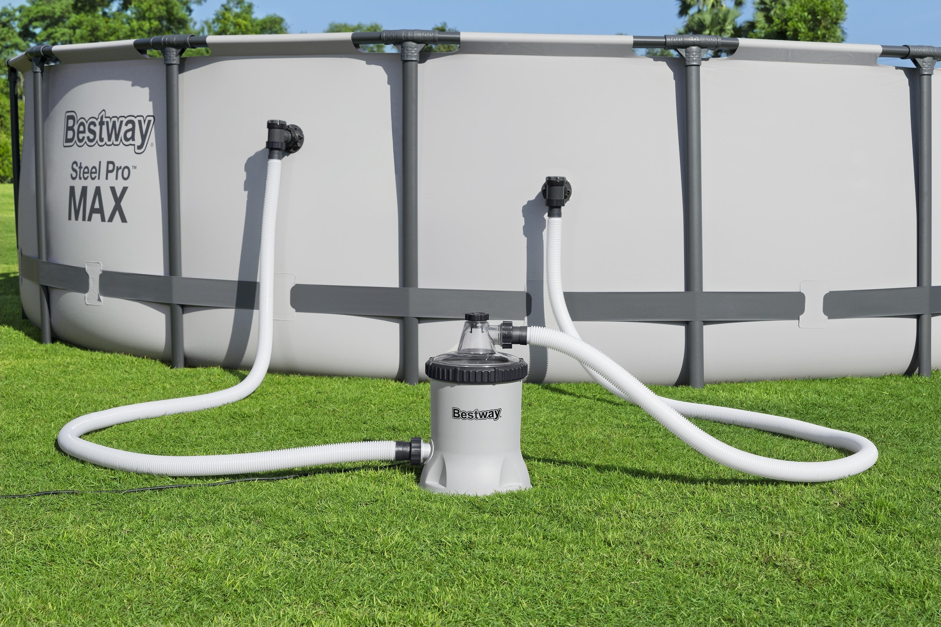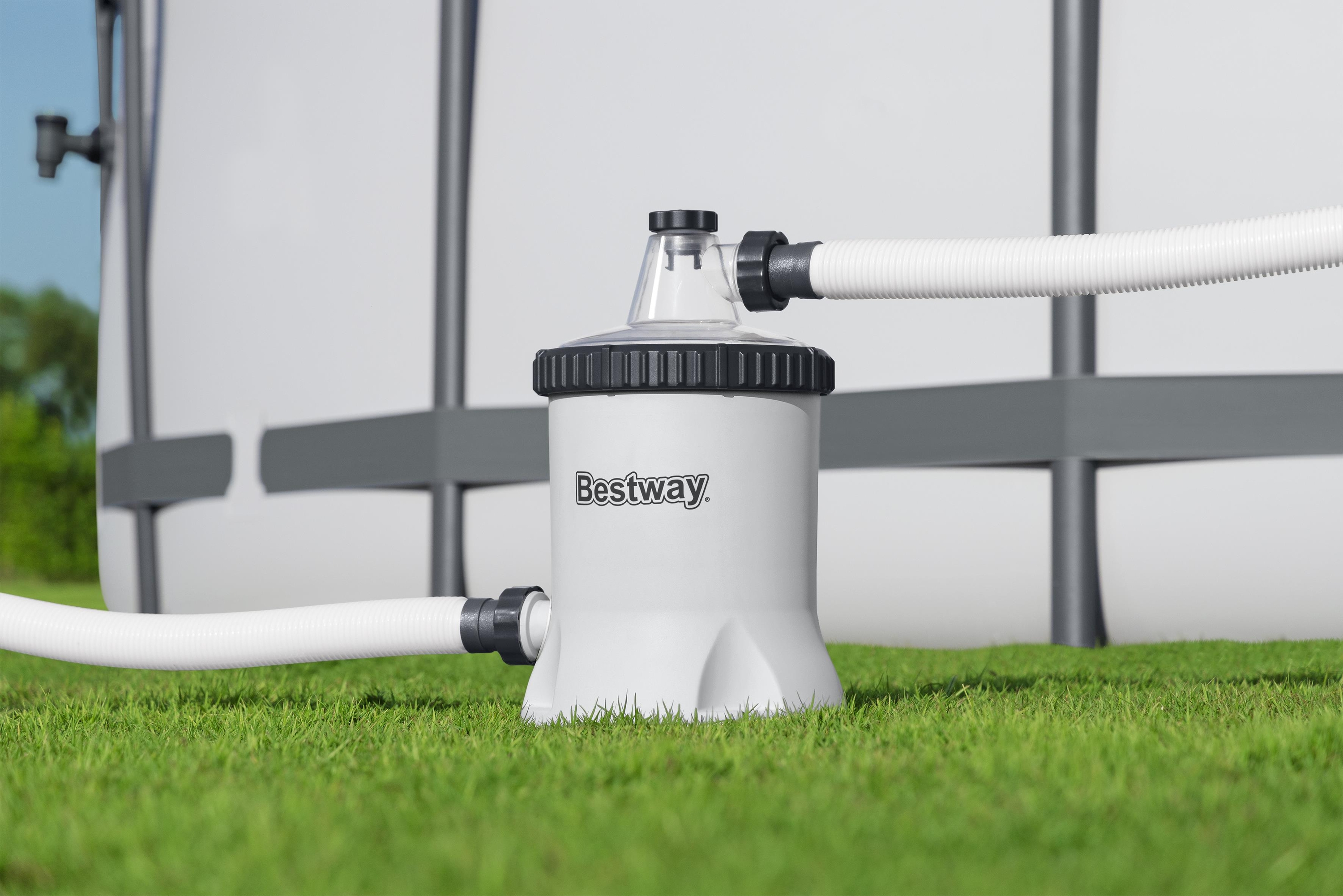 Technische Daten: 220-240 V, 12 V Trafo, 110 W, Schutzklasse II, auch geeignet für den Betrieb in DE / NL / BE / LU Pumpenleistung: 5.678 l/h Durchflussrate: 3.974 l/h Ø 38-mm-Anschluss Für Poolgrößen von 1.100-31.700 Liter GS-zertifizier