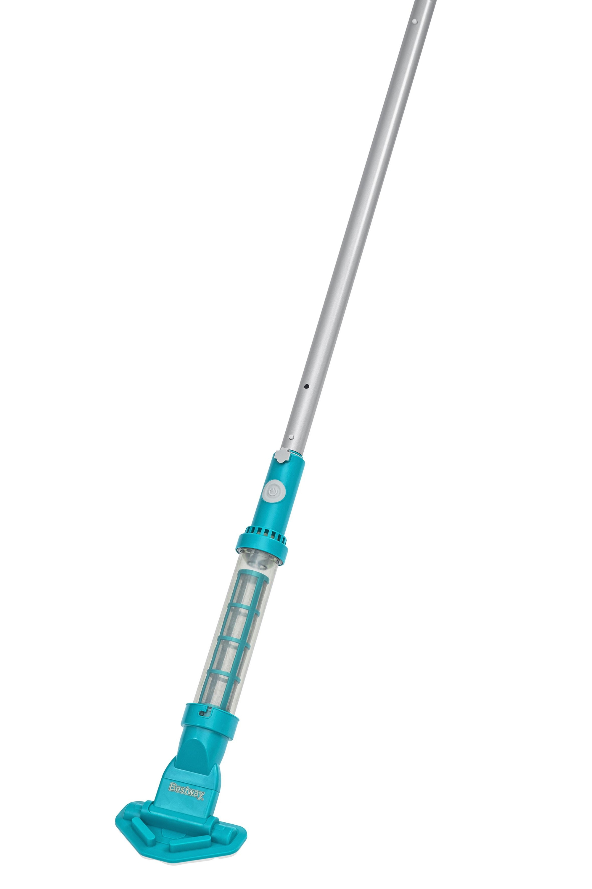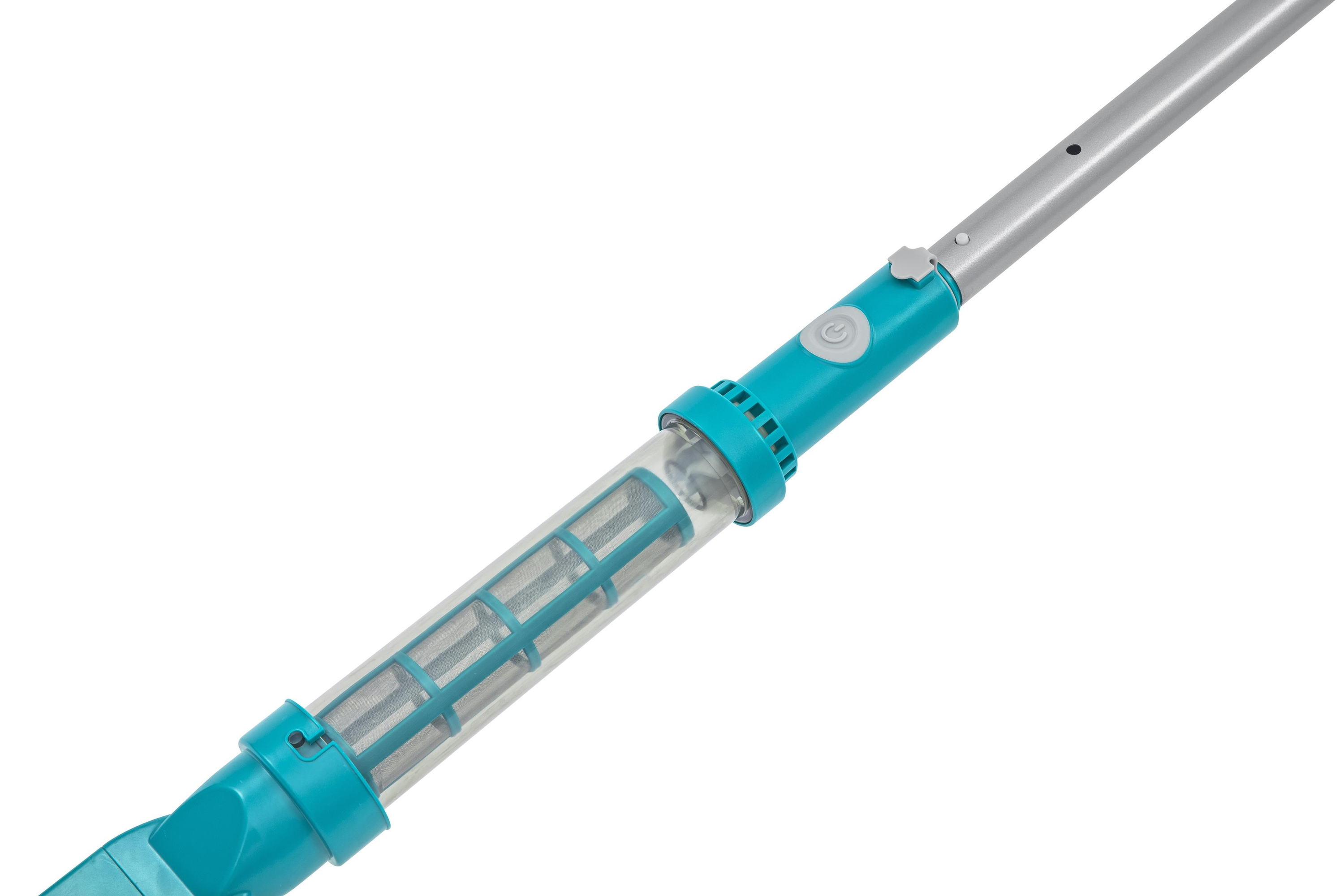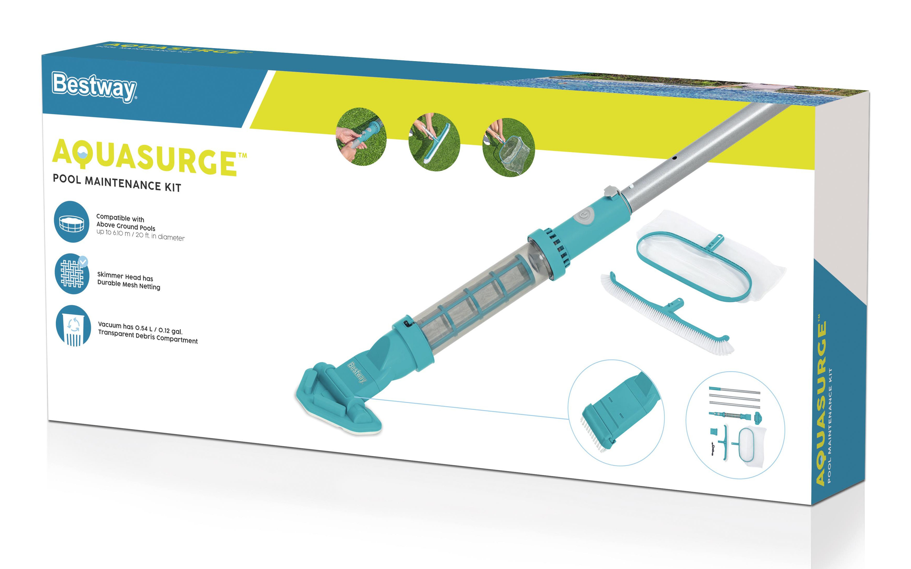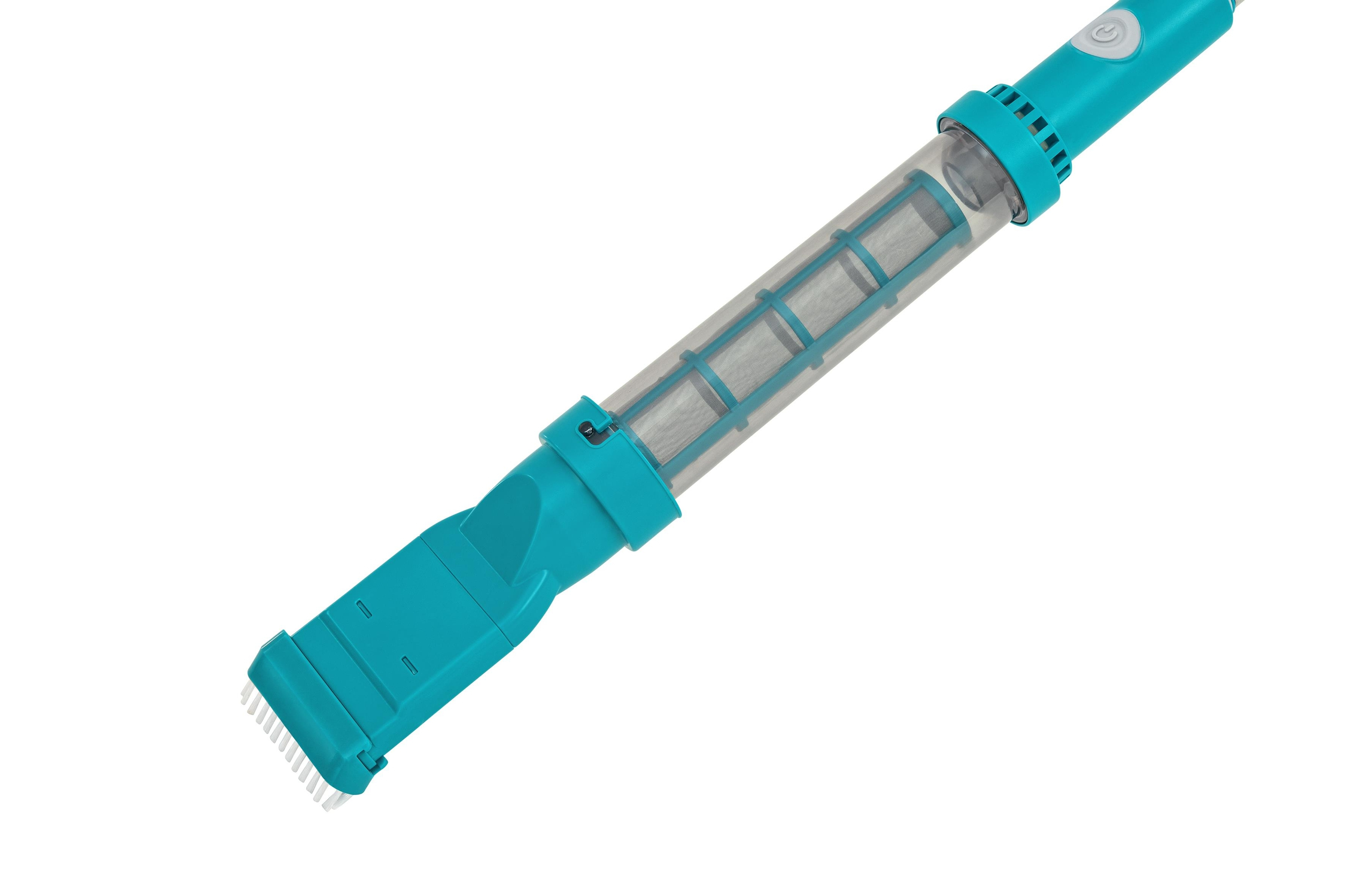 Geeignet für Aufstellpools mit bis zu 610 cm Durchmesser 1 Poolsauger: Integrierter Akku (Laufzeit bis zu 50 Minuten) Inklusive USB-Ladekabel Transparenter Schmutzbehälter (0,54 Liter) 2 verschiedene Saugköpfe Leichter Haltestiel 1 Kesc