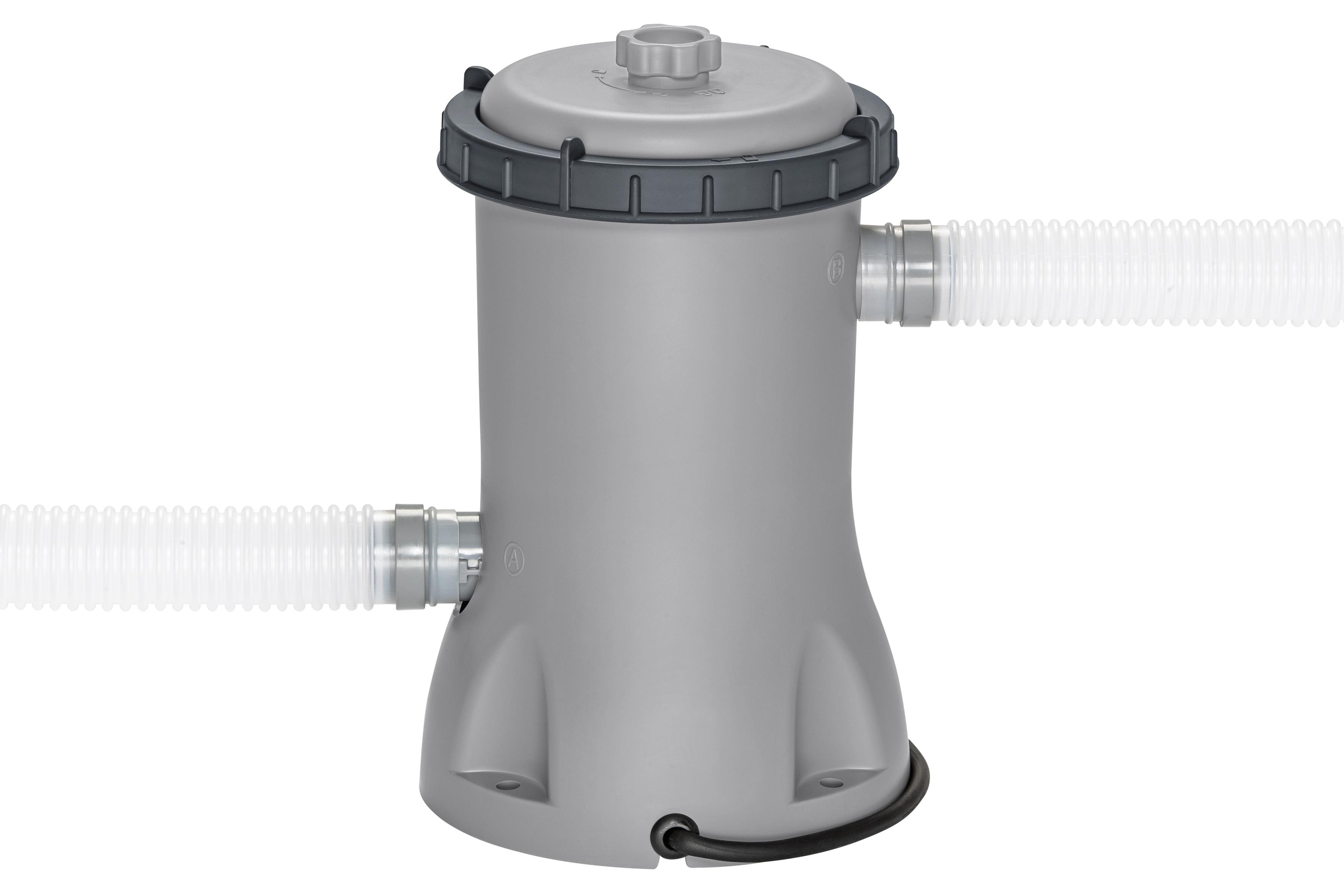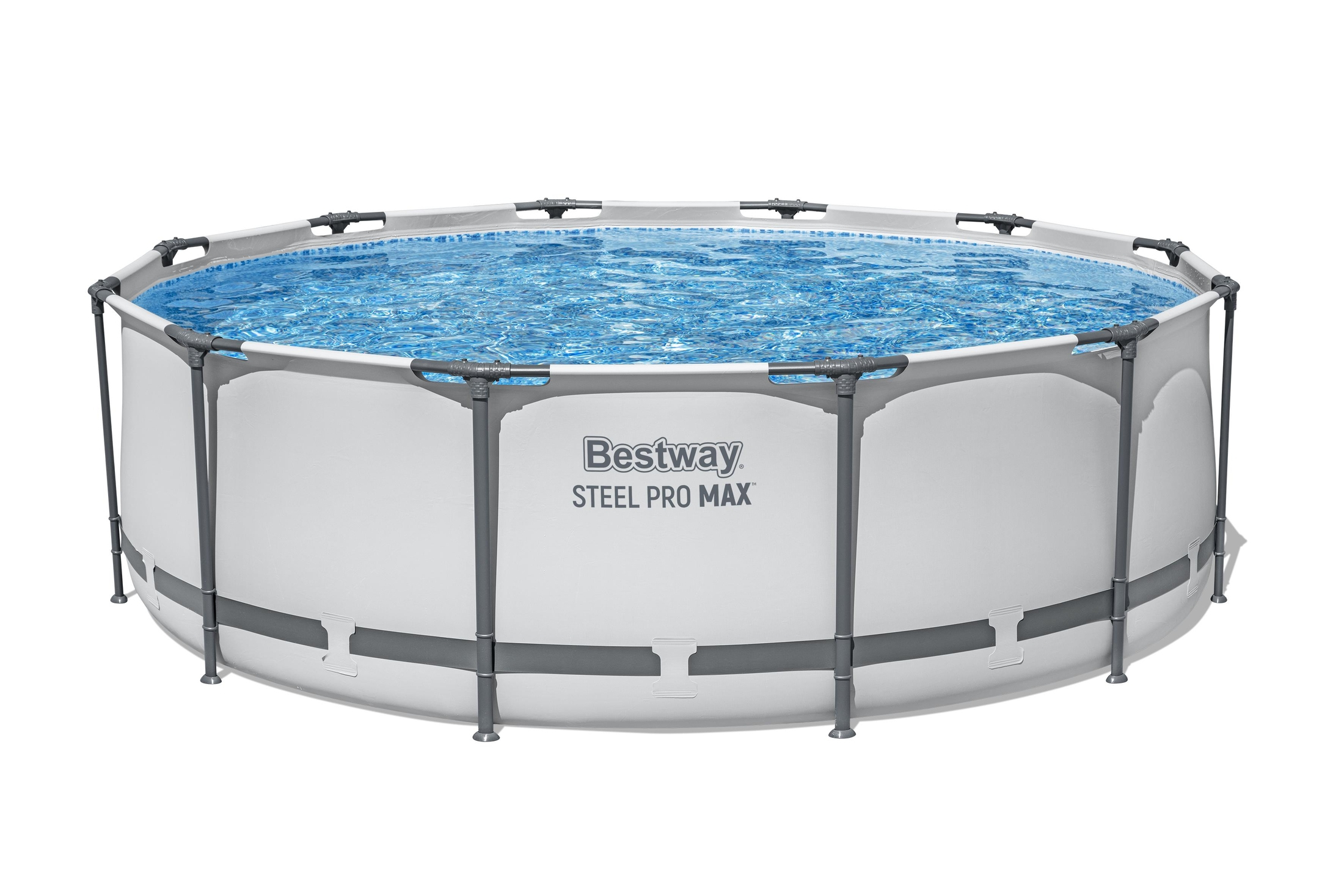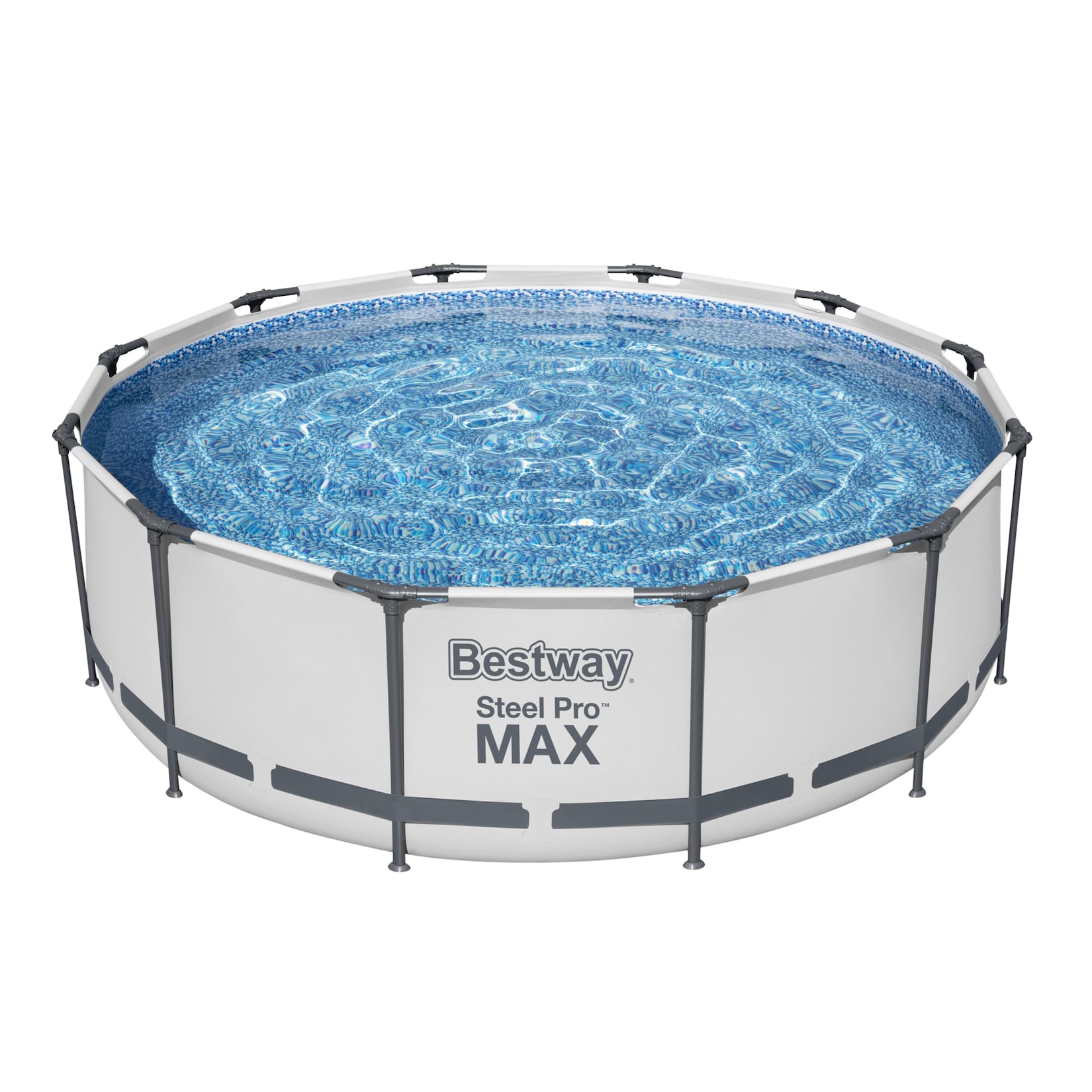 Bestway® Steel Pro MAX™ Frame Pool Set mit Filterpumpe Ø 366 x 100 cm, lichtgrau, rund • Konstruktion: · Größe: Ø 366 x 100 cm · Wasserkapazität (90 %): 9.150 Liter · Robustes, 3-lagiges DuraPlus™ -Material · PVC-Band für extra Stabilität der Seitenwänd