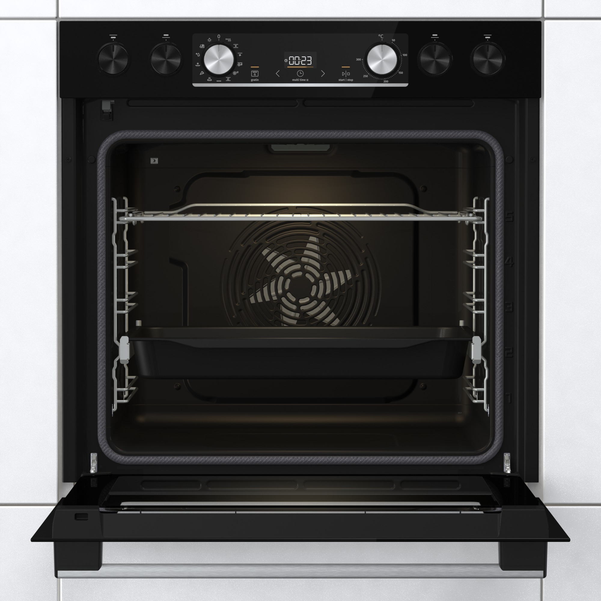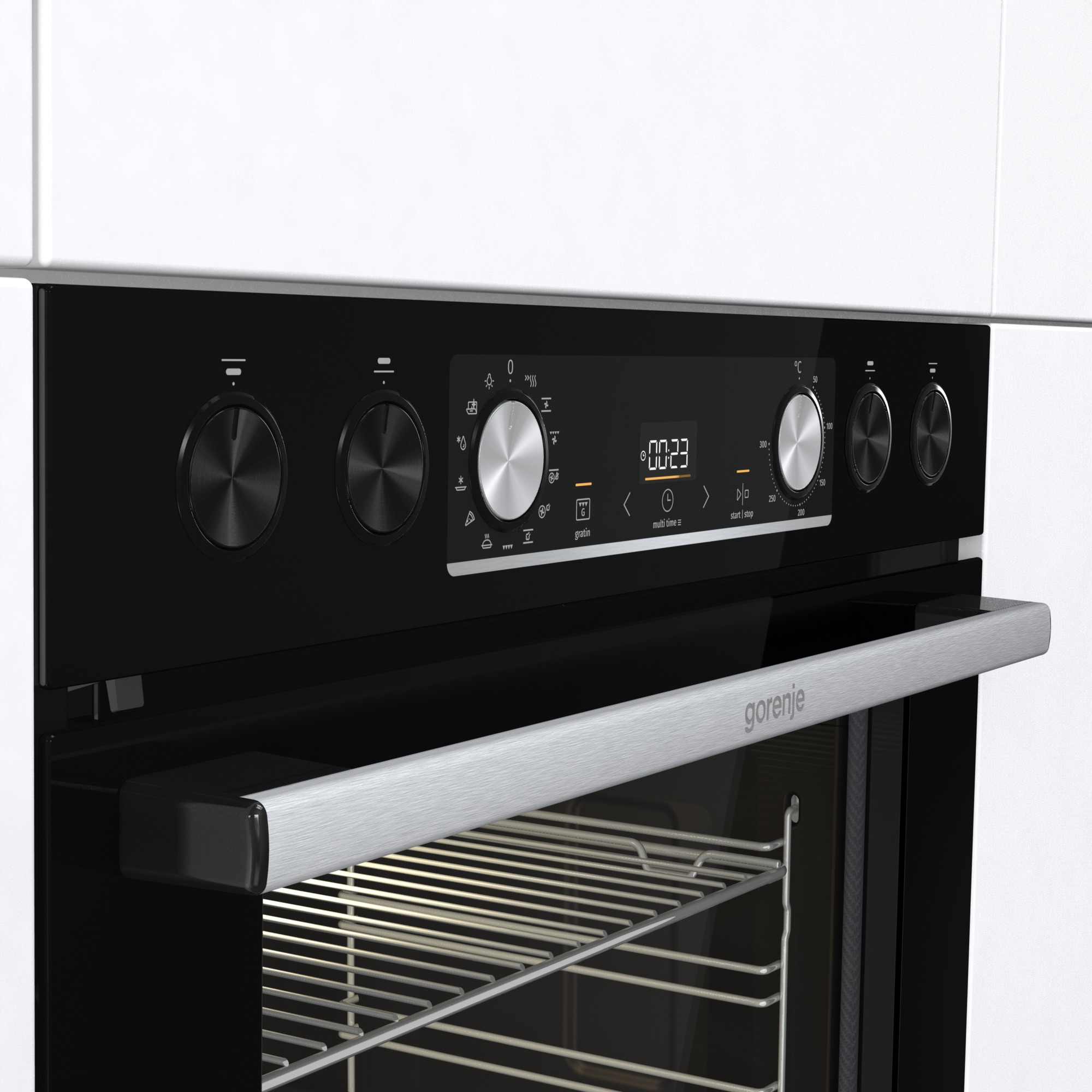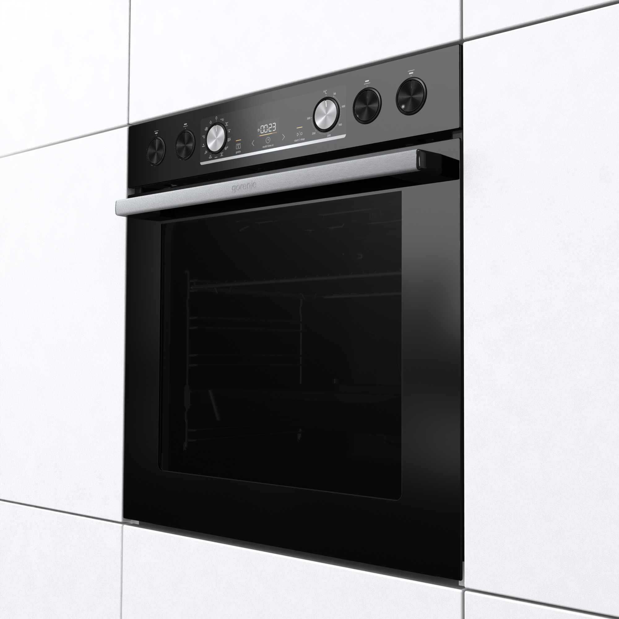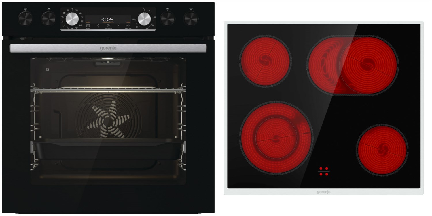 Einbau-Geräte-Set Black Set 4 Pyrolyse von Gorenje Gorenje präsentiert mit dem Black Set 4 Pyrolyse ein Einbau-Geräte-Set mit einem Einbauherd und mit einem Glaskeramikfeld. Für niedrige Kosten steht der Verbrauch von nur 0,97 kWh bei Ober-/Unterhitze und 0,71 kWh bei Heißluft/Umluft. Platzmangel gehört mit dem Black Set 4 Pyrolyse der Vergangenheit an. In dem geräumigen 77-Liter Innenraum können Sie mehrgängige Menüs, den Festtagsbraten oder große Mengen für Gäste ohne Probleme zubereiten. Töpfe finden bei diesem Einbau-Geräte-Set auf 4 Kochzonen Platz. Die Programme beim Black Set 4 Pyrolyse Neben Heißluft/Umluft verwenden Sie die Backofeneinstellungen Auftauen (nur Gebläse), Überbacken und Schnellvorheizfunktion. Barbecue-Genuss unabhängig vom Wetter – damit lockt der Umluftgrill. Mit der Pizzastufe wird die Creazione alla Casa kross. Die weiteren Merkmale Bequem und ohne sich die Finger zu verbrennen holen Sie mit dem Teleskopauszug die Leckereien aus dem Backofen. Als Putzhilfe in Form von Hitze unterstützt Sie die pyrolytische Selbstreinigungsfunktion. Über die versenkbaren Schalter bedienen Sie Einbau-Geräte-Set komfortabel. Weil das Timing beim Kochen von großer Bedeutung ist, hat Gorenje die Elektronik-Uhr vorgesehen. Vervollständigt wird der Lieferumfang des Black Set 4 Pyrolyse durch 1 Grillrost und 1 Fettpfanne. Unsere Kaufempfehlung Die ausgezeichnete Energieeffizienz macht das Black Set 4 Pyrolyse zum Sparmeister. Für Hobbyköche, die sich ein großes Innenraumvolumen wünschen, ist das Black Set 4 Pyrolyse ein Traum.