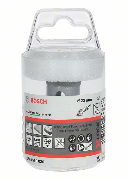 Der Diamanttrockenbohrer Dry Speed hat eine hohe Lebensdauer für das Trockenbohren von Hartkeramik. Der hochwertige Diamantbesatz ermöglicht hohe Bohrdrehzahlen und die Vakuumlöttechnologie gewährleistet eine hohe Lebensdauer. Dieses Produkt eignet sich für Fliesen - von weichen Wandfliesen bis zu sehr harten Bodenfliesen aus Steingut. Er ist für alle Winkelschleifer geeignet.rnrn Beschreibung rnDiamanttrockenbohrer X-LOCK Best for Ceramic Dry Speed, 22 x 35 mmrnrnX-LOCKrnDiamond TechnologyrnrnDer X-LOCK Diamanttrockenbohrer Best for Ceramic Dry Speed bietet hohe Lebensdauer beim Trockenbohren in Hartkeramik. Der hochwertige Diamantbesa