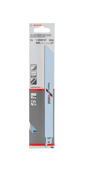 rnS 1025 VFrnBIM, varioverzahntrnMittelstarke bis starke Bleche (2-10 mm), dünnwandige und dickwandige Rohre und Profile ( Hauptmerkmale rn rn Funktionen rn Vorgesehene Verwendung Stichsäge rn Für Materialien geeignet Leitung, Profil, Metallblech (mittelstark), Blech (dick) rn Material Messer Bimetallisch rn rn Leistung rn Anzahl der Zähne pro Zoll 10-14 rn Variabler Klingenzahnabstand Ja rn Klingenzahnabstand (min.) 1,8 mm rn Klingenzahnabstand (max.) 2,6 mm rn rn Verpackungsinhalt rn Menge pro Packung 5 Stück(e) rn Verpackungsart Sichtverpackung rn