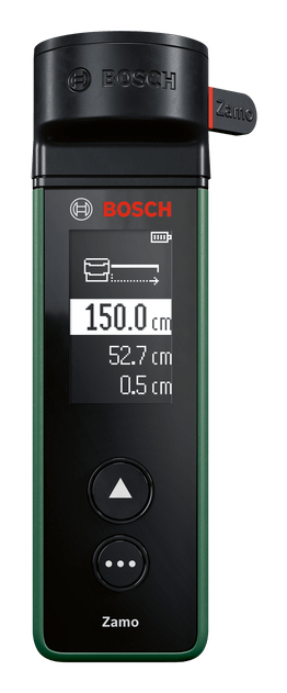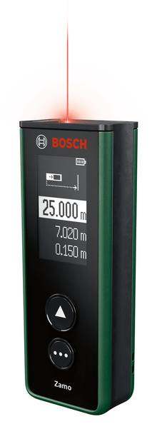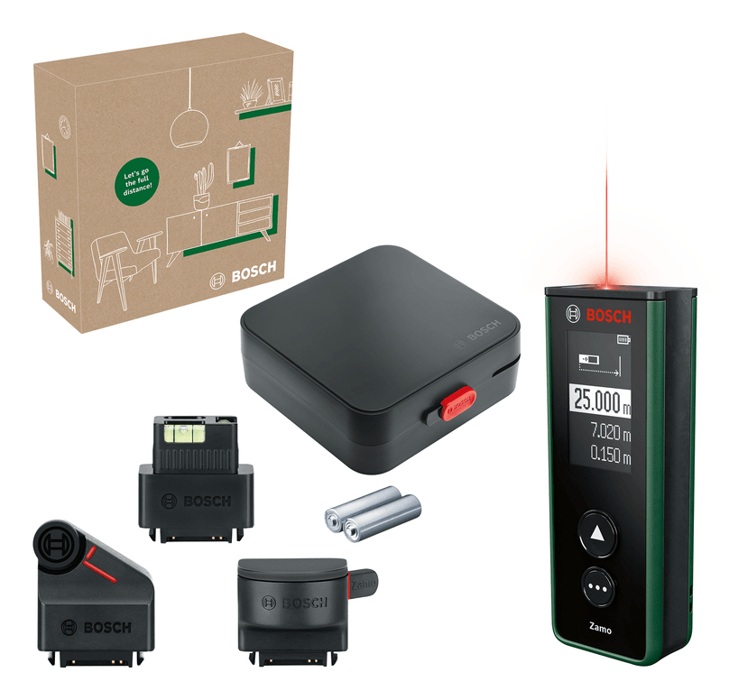 Neueste Lasertechnologie ermöglicht eine schnelle und präzise Entfernungsmessung bis zu 25 m. Einfache und intuitive Bedienung dank zwei Bedientasten und gut lesbarem Display. Die integrierte Flächenfunktion macht die Berechnung der benötigten Menge an Bodenbelag oder Farbe schnell und einfach. Austauschbare Adapter ermöglichen das Messen von freistehenden Objekten, unebenen Flächen und Kurven sowie das Ausrichten von Objekten wie Bildern und Regalen. Features: Speichert die letzten 10 Mess- und Rechenwerte Akkuladung und Software-Updates über USB-C®-Schnittstelle Abschaltautomatik nach 5 min Technische Daten: Messbereich: 0,15...25 m Laserdiode: 635 nm Laserklasse: 2 Messzeit: max. 4 s Stromversorgung: 2x 1,2 V AAA Akkus Gewicht: 0,08 kg Maße: 104x38x23 mm Lieferumfang: Digitaler Laser-Entfernungsmesser Zamo Basic Linien-Adapter Rad-Adapter Band-Adapter 2x AAA Akkus Benutzerhandbuch
