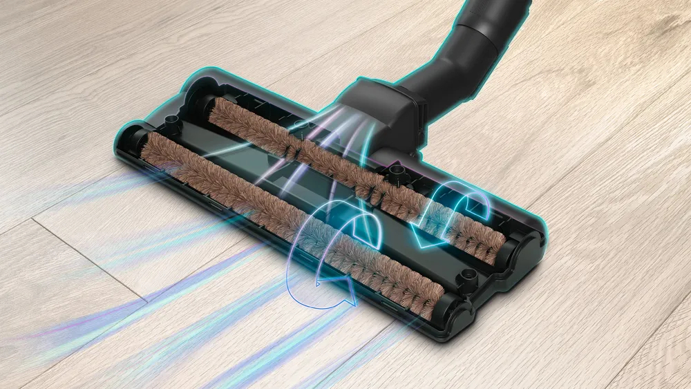 • Schonende Hartbodendüse mit 2 rotierenden Bürstenrollen für die Pflege wertvoller Hartböden