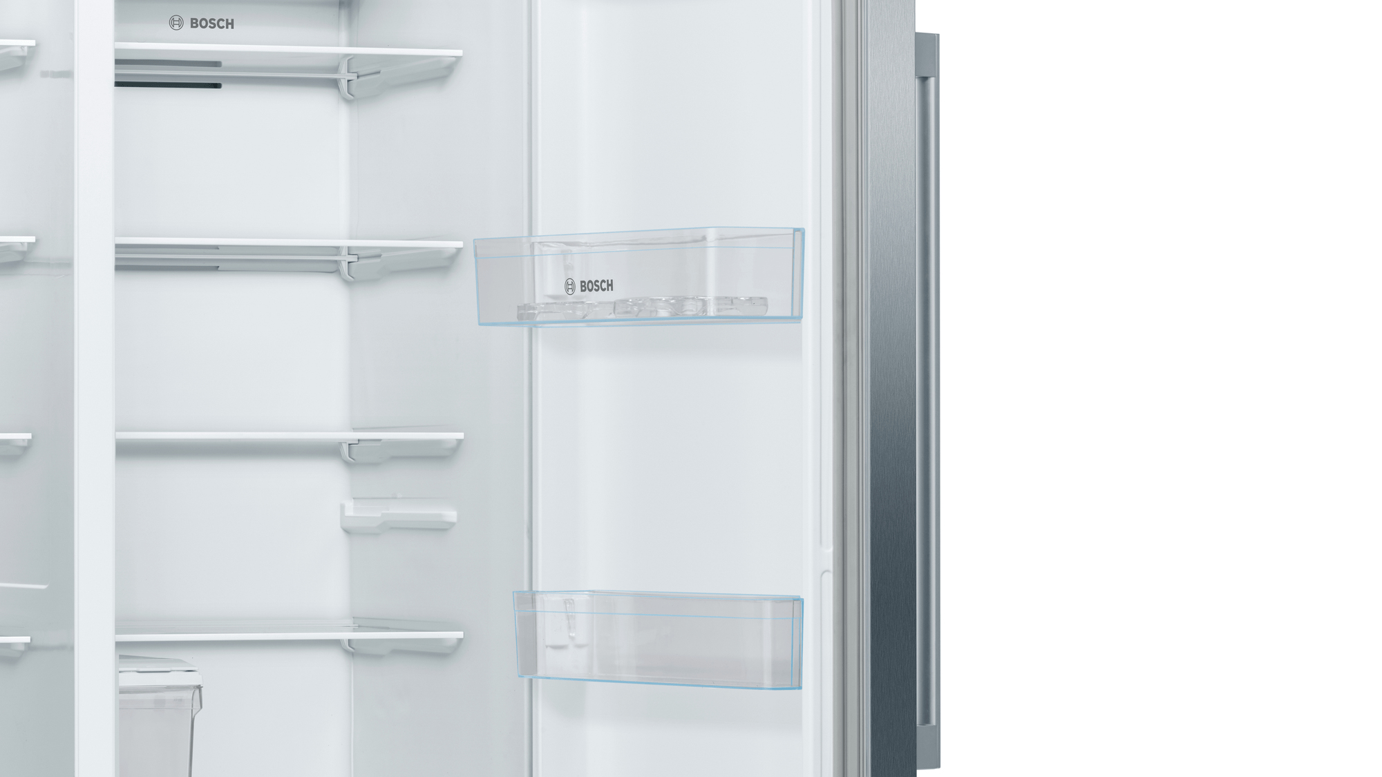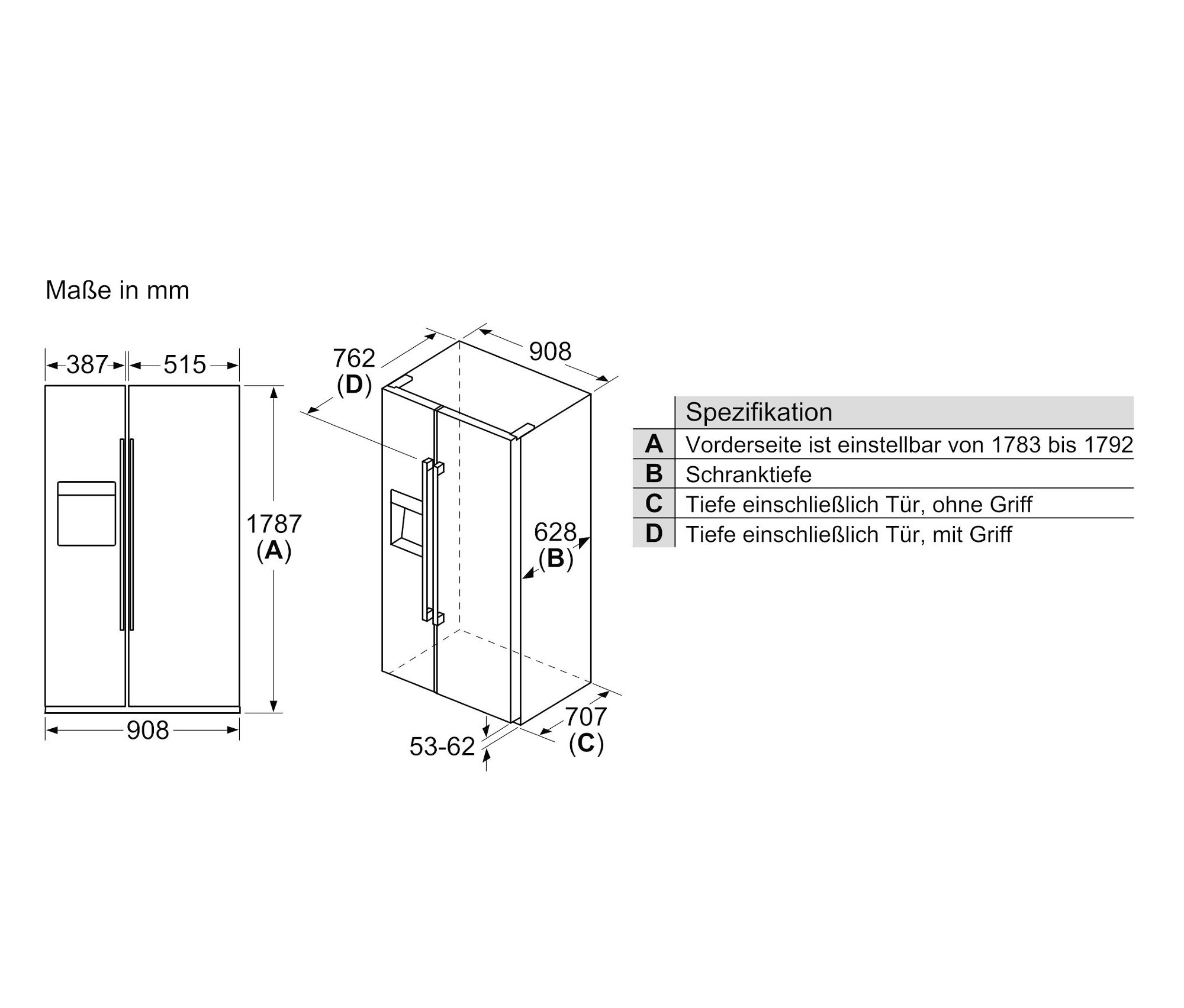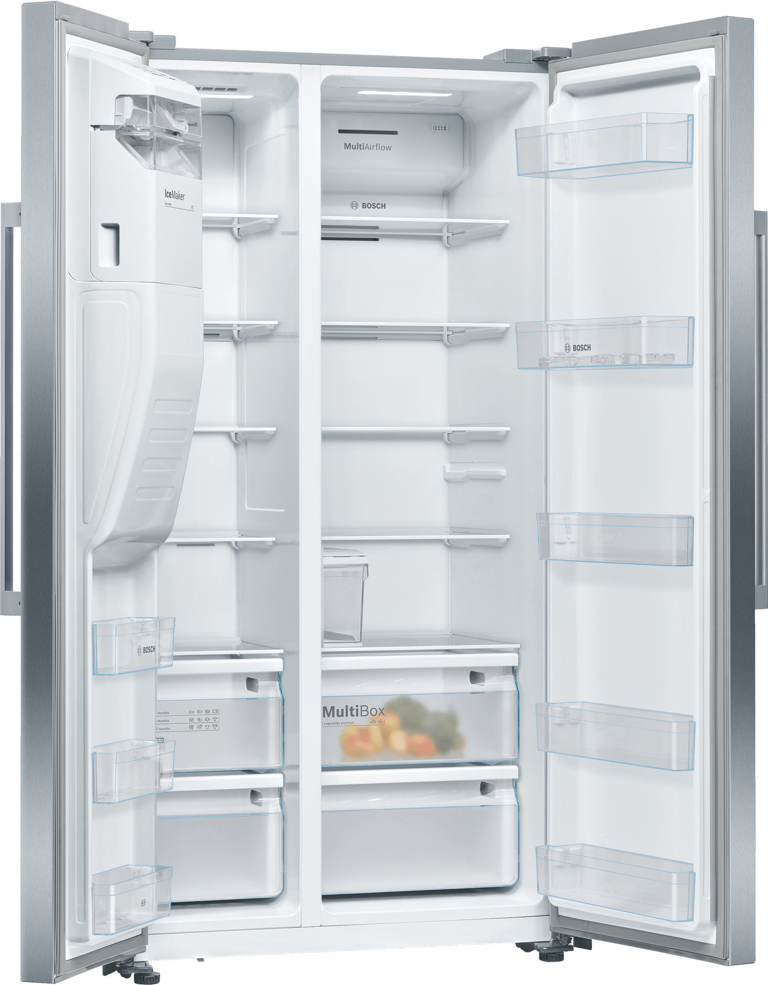 Bosch-Side-by-Side-Kühl-Gefrier-Kombination KAI93VIFP, F (von A bis G), ca. 533 Liter Farbe: Türen edelstahlfarben Seitenwände grau Material: Edelstahl und Kunststoff Maße: B x H x T ca. 91 x 178,5 x 70,5 cm Länge Anschlusskabel ca. 170 cm Inhalt: Inkl. 1 Eierablage, 5 Abstellflächen aus Sicherheitsglas, 2 durchgehender Türabsteller, 2 transparenter Gefriergut-Schubladen, 3 Abstellflächen aus Sicherheitsglas und 2 MultiBoxen auf Rollen Gewicht: Ca. 111 kg Füllmenge: Gesamt ca. 533 Liter Kühlraum ca. 368 l Gefrierraum ca. 165 l Wassertank ca. 4,5 l Leistung: 240 Watt Anschlusswert Technische Details: - Gerät auf 4 Rollen, justierbar - Klimaklasse: SN-T - Energieeffizienzklasse: F (von A bis G) - Energieverbrauch/ Jahr: 404 kWh - Lautstärke: 42 dB Sonstige Hinweise: Lieferung in 1 Packstück Anlieferung frei Bordsteinkante (keine Inselbelieferung) Lieferzeit Deutschland: 1-3 Wochen Garantiegeber: Robert Bosch Hausgeräte GmbH Carl-Wery-Straße 34 81739 München Deutschland Herstellergarantie: 2 Jahre Garantieumfang: auf das Gerät Räumlicher Geltungsbereich: Deutschland Hersteller-Artikel-Nummer: KAI93VIFP Großzügiger Kühlschrank in geradlinigem, modernem DesignMit integriertem Eis- und WasserspenderCrushed Ice, Eiswürfel oder kaltes Trinkwasser bei Betätigung der Spendertaste mit LED-BeleuchtungAutomatischer Eiswürfelbereiter, Eiswürfelproduktion ca. 0,9 kg/24 Std.NoFrost: nie wieder Abtauen durch automatischen Schutz vor EisbildungSuperKühlen: kühlt neu hinzugefügte Lebensmittel schnellerEdelstahl mit inox-Anti-FingerprintMulti-Airflow-System für optimale und gleichmäßige KälteverteilungMit DigitalanzeigeGetrennte Temperaturregelung für Kühl- und GefrierraumNutzinhalt Kühlraum ca. 368 Liter, Nutzinhalt Gefrierraum ca. 165 Liter Mit SuperKühlen und SuperGefrieren sowie optischem und akustischem Türalarm