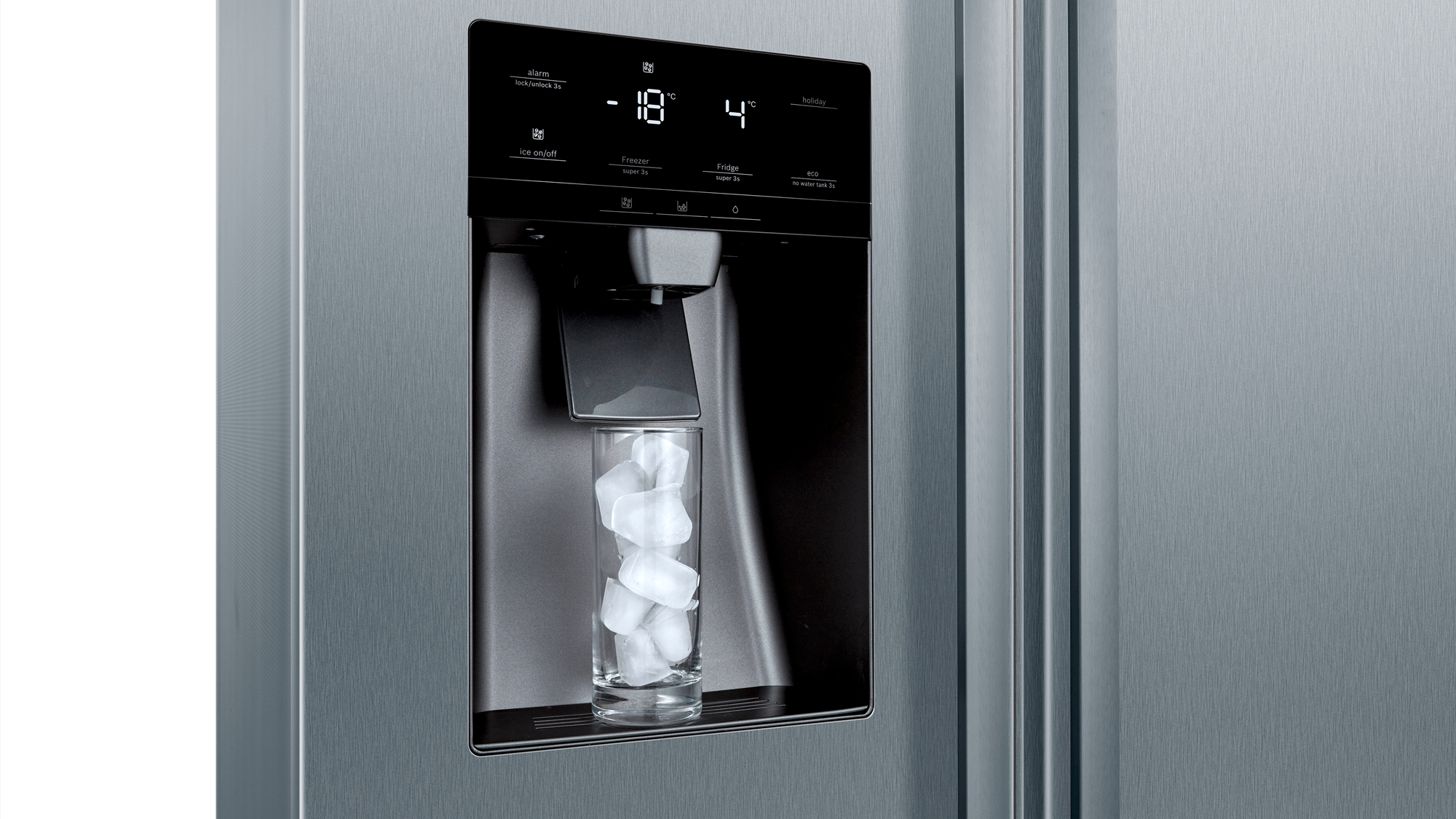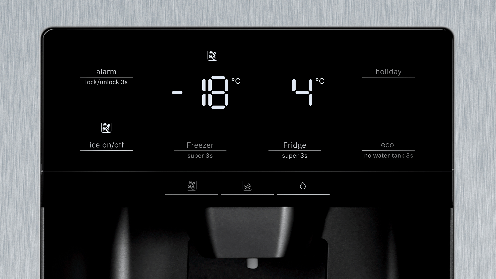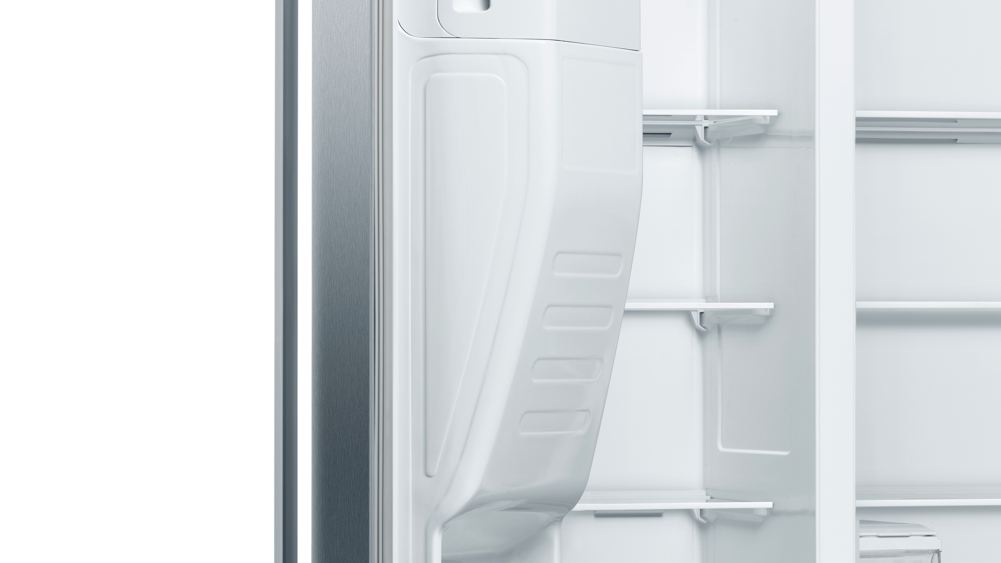 Bosch-Side-by-Side-Kühl-Gefrier-Kombination KAI93VIFP, F (von A bis G), ca. 533 Liter Farbe: Türen edelstahlfarben Seitenwände grau Material: Edelstahl und Kunststoff Maße: B x H x T ca. 91 x 178,5 x 70,5 cm Länge Anschlusskabel ca. 170 cm Inhalt: Inkl. 1 Eierablage, 5 Abstellflächen aus Sicherheitsglas, 2 durchgehender Türabsteller, 2 transparenter Gefriergut-Schubladen, 3 Abstellflächen aus Sicherheitsglas und 2 MultiBoxen auf Rollen Gewicht: Ca. 111 kg Füllmenge: Gesamt ca. 533 Liter Kühlraum ca. 368 l Gefrierraum ca. 165 l Wassertank ca. 4,5 l Leistung: 240 Watt Anschlusswert Technische Details: - Gerät auf 4 Rollen, justierbar - Klimaklasse: SN-T - Energieeffizienzklasse: F (von A bis G) - Energieverbrauch/ Jahr: 404 kWh - Lautstärke: 42 dB Sonstige Hinweise: Lieferung in 1 Packstück Anlieferung frei Bordsteinkante (keine Inselbelieferung) Lieferzeit Deutschland: 1-3 Wochen Garantiegeber: Robert Bosch Hausgeräte GmbH Carl-Wery-Straße 34 81739 München Deutschland Herstellergarantie: 2 Jahre Garantieumfang: auf das Gerät Räumlicher Geltungsbereich: Deutschland Hersteller-Artikel-Nummer: KAI93VIFP Großzügiger Kühlschrank in geradlinigem, modernem DesignMit integriertem Eis- und WasserspenderCrushed Ice, Eiswürfel oder kaltes Trinkwasser bei Betätigung der Spendertaste mit LED-BeleuchtungAutomatischer Eiswürfelbereiter, Eiswürfelproduktion ca. 0,9 kg/24 Std.NoFrost: nie wieder Abtauen durch automatischen Schutz vor EisbildungSuperKühlen: kühlt neu hinzugefügte Lebensmittel schnellerEdelstahl mit inox-Anti-FingerprintMulti-Airflow-System für optimale und gleichmäßige KälteverteilungMit DigitalanzeigeGetrennte Temperaturregelung für Kühl- und GefrierraumNutzinhalt Kühlraum ca. 368 Liter, Nutzinhalt Gefrierraum ca. 165 Liter Mit SuperKühlen und SuperGefrieren sowie optischem und akustischem Türalarm