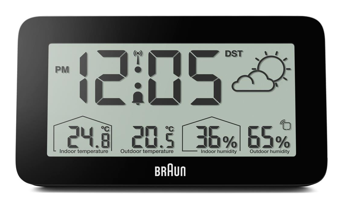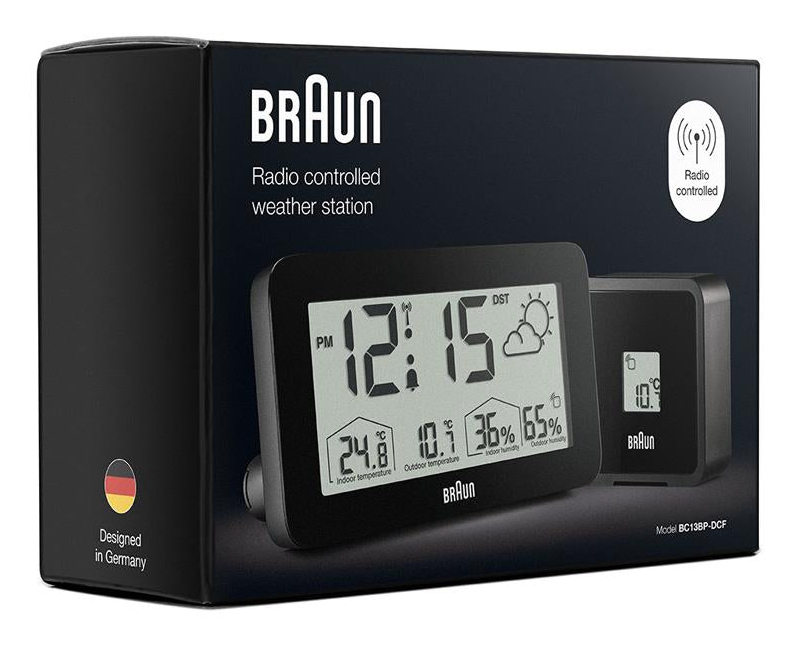 Marke: Braun • Hersteller-Nr.: BC13BP-DCF • Hersteller Serie: digitaler Funkwecker m. Wetterstation • Funktionen: 12-24 h, Crescendo-Alarm, Minute, Schlummerfunktion, Sekunde, Stunde, Temperaturanzeige • Abmaße: 135 x 75 x 17 mm • Artikelgewicht: 0.3 kg • Lieferumfang: Anleitung, Garantie Dok., Umkarton