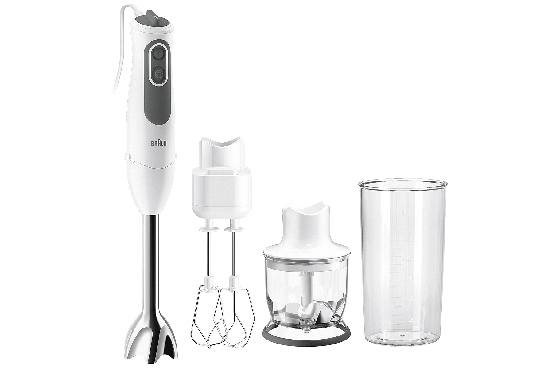 Edelstahl-Mixfuß mit POWER-Bell-Plus Technologie, 11 Geschwindigkeitsstufen plus Turbo-Stufe, SPLASH-Control Technologie, abnehmbarer Schaft mit EasyClick System, Soft-Griff, 600 ml Mix- und Messbecher (BPA-frei), Zubehör spülmaschinengeeignet, Doppel-Schneebesen, 350 ml Zerkleinerer, Leistung 750 W