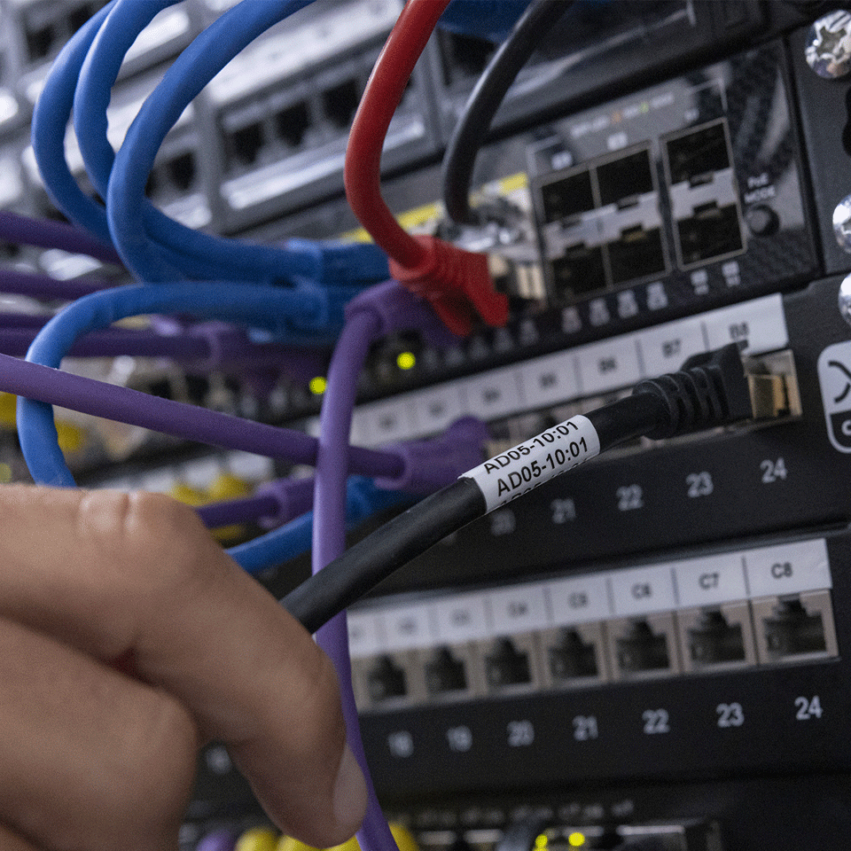 Integrierter automatischer Cutter mit Halbschnittfunktion zum Drucken einer Reihe von Etiketten in einem durchgehenden Streifen. Perfekt für Arbeiten an großen Anlagen, bei denen viele Kabel und Komponenten in sequenzieller Reihenfolge beschriftet werden müssen.