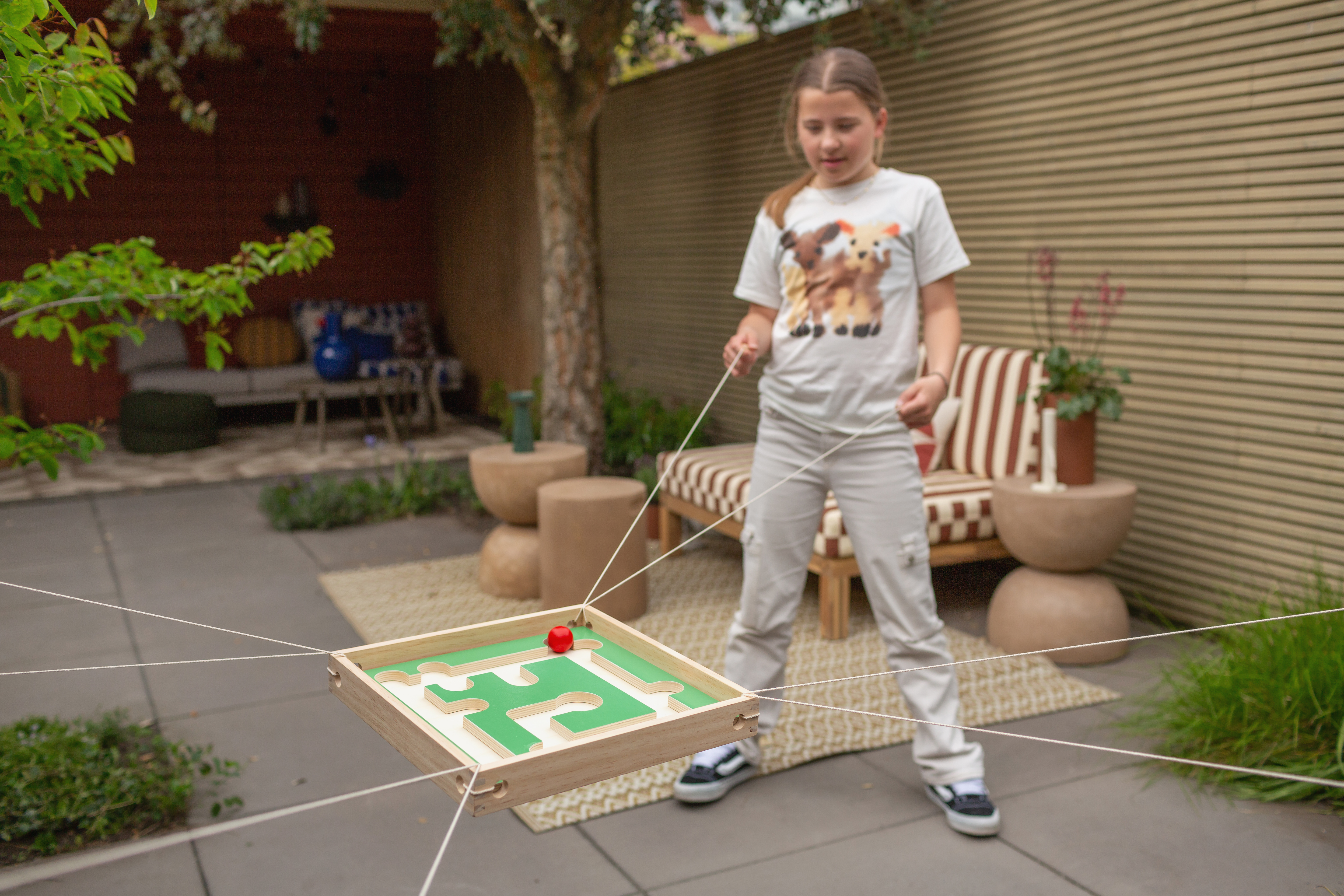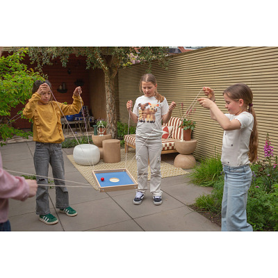 BS Toys Geschicklichkeitsspiel Active Coordination: Teamwork und Teamgeist gewinnen - Das BS Toys Geschicklichkeitsspiel Active Coordination setzt sich aus 1 Holzrahmen, 4 Seilen mit je 2 Griffen, 3 Einlegeböden und 3 Spielbällen zusammen. Die Seile sind durch die Öffnungen im Rahmen geführt, während die Einlegeböden unterschiedliche Bahnen für die Kugeln bieten. Durch geschickte Kommunikation und Koordination versuchen die Spieler:innen, die Bälle in die Ziele zu lenken. Ein spannendes Teamspiel, das Fingerspitzengefühl erfordert. - Produktdetails: - Material: Holz - Maße (LxBxH): 35x35x4 cm - Für 4-8 Spieler:innen