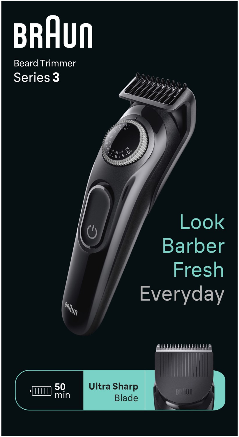 Für einen Barber Fresh Look zu Hause – Braun Series 3 Barttrimmer. Der Trimmer Herren dient auch als Haarschneider / Haarschneidemaschine und ist als Geschenk für den Mann ideal geeignet. Präzise bei jedem Zug mit ultrascharfen Klingen – für ein gleichmäßiges Trimmen aller Bärte. Präzisionsrad mit 40 Längeneinstellungen.