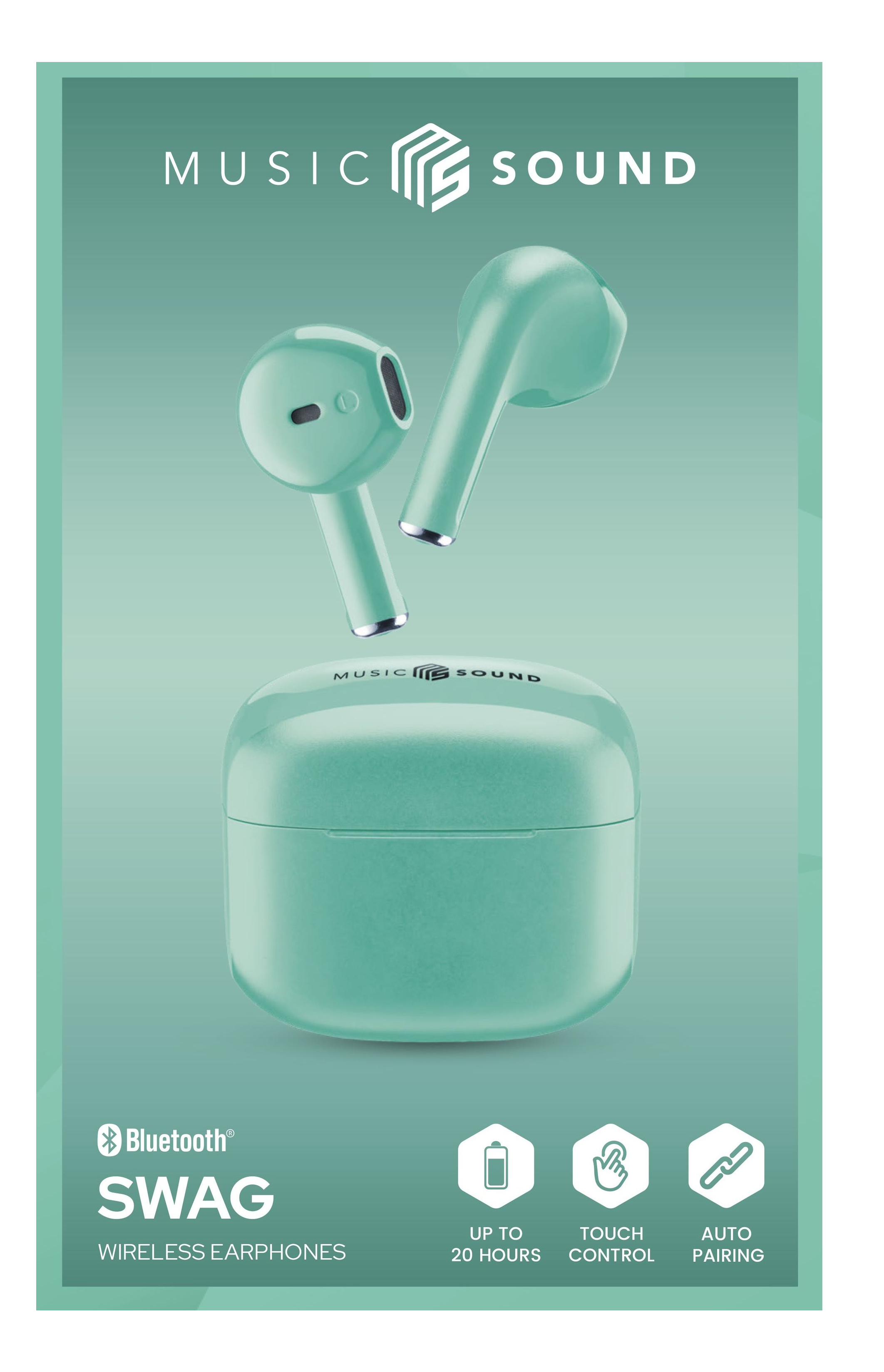 SWAG ist der True Wireless Kopfhörer mit einem farbenfrohen und leicht zu tragenden Case. Sie bieten bis zu 20 Stunden Spielzeit für ununterbrochenes Hören Ihrer Lieblings-Wiedergabeliste. Die Kopfhörer besitzen eine Kapselkonstruktion für einen ausgewogenen Klang und für einen optimalen Komfort.> Highlights- Bluetooth In-Ear Kopfhörer für kabellose Musikwiedergabe- Kopfhörer mit Kapselkonstruktion für ausgewogenen Klang und optimalen Komfort- Bedienelemente an den Ohrhörern zur Verwaltung Ihrer Musik und Anrufe (Touchcontrol)- Kompaktes und transportables Gehäuse um die kabellosen Ohrhörer immer bei sich mit sich zu führen- Automatische Pairing-Verbindung zum einfachen Koppeln der Ohrhörer mit Ihrem Bluetooth Gerät- Bis zu 20 Stunden Spielzeit für ununterbrochenes Hören> Produkttyp- Kopfhörer- ear-Kategorie (ElektroG): relevant, Kategorie 5: Kleingeräte < 50 cm (alle Seiten), Kleingeräte B2C> Versand- WEEE: 64088074- Akkugewicht: 0.6 g3.7 g> Anschlüsse- Anschluss: USB-C- Headsetkonnektivität: Bluetooth> Audio- Mikrofon: Integriertes Mikrofon- Hörtyp: binaural- Kopfhörerhighlights: Touchcontrol- Bauart: geschlossen- Tragevariante: In-Ear> Stromversorgung- Akkukapazität: 25 mAh180 mAh- Akku-/Batterie-Technologie: Li-Ion - Lithium-Ionen- Akkulaufzeit: 20 Stunde(n)- Gesprächszeit: 4 Stunde(n)- Akku- Akkuspannung: 3.7 V- Akku verbaut: in Gerät eingebaut- Ladezeit: 1.5 Stunde(n)- Energie: 0.092 Wh0.66 Wh- Ladeleistung min.: 2.5 W- Ladeleistung max.: 5 W- Ladenetzteil enthalten: Nein- Ladefunktion Power Delivery (PD): Nein> Datenübertragung- Bluetooth- Bluetooth Standard: 5.1- Übertragungstechnik: kabellos> Grundeigenschaften- Farbe: Grün- Gewicht: 67 g> Lieferumfang- Music Sound SWAG WIRELESS EARPHONES Grün- USB-C Kabel- Benutzerhandbuch