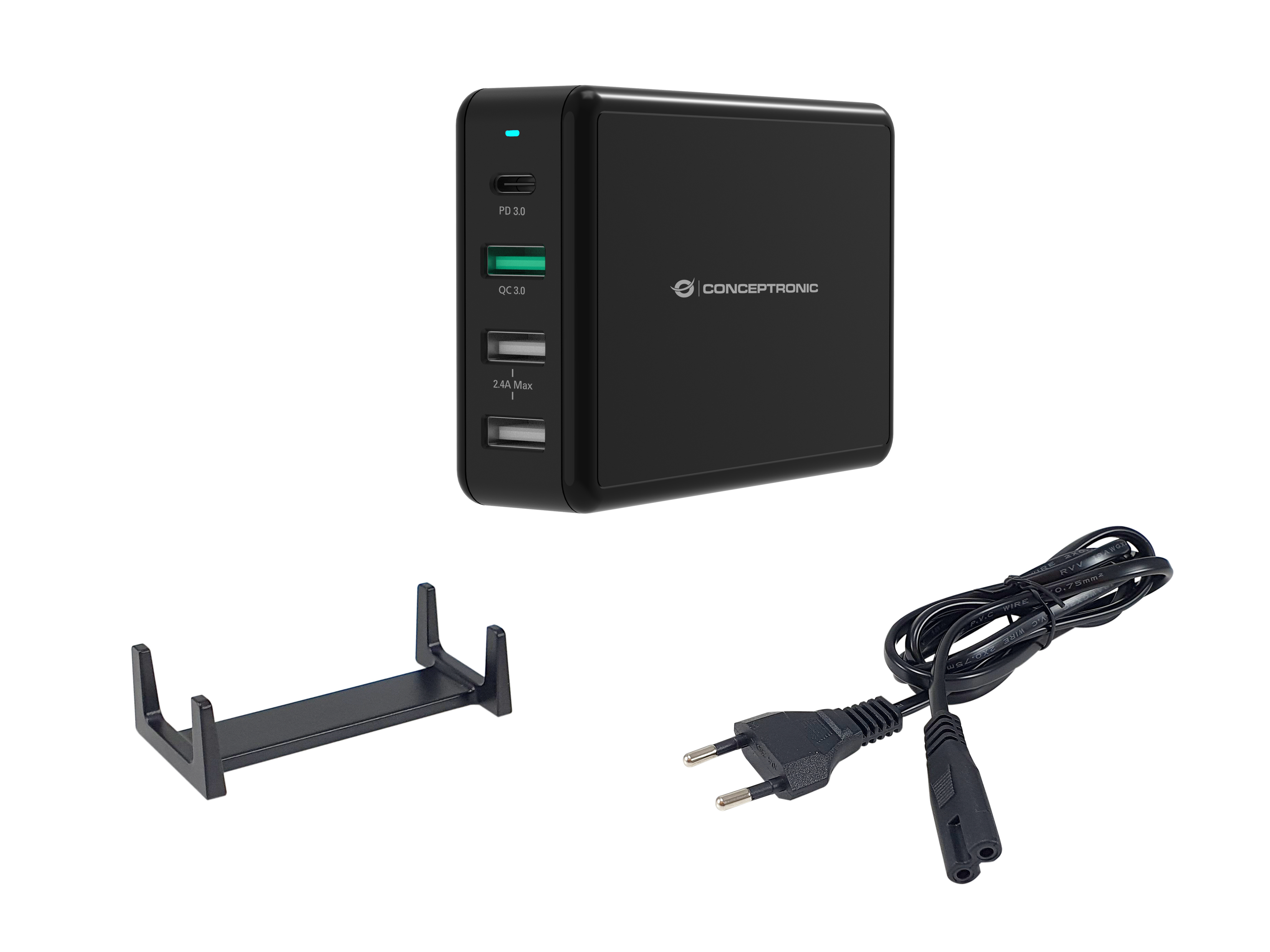 Dieses Ladegerät bietet 1 USB-C-Anschluss (PD 3.0) und 3 USB-A-Anschlüsse (QC 3.0) mit bis zu 65 W Gesamtleistung – ideal zum gleichzeitigen Schnellladen mehrerer Geräte von Smartphone bis Laptop. Es unterstützt Spannungen von 3,6 V bis 20 V und schützt zuverlässig vor Überlastung, Kurzschluss und Überhitzung. Die integrierten Schnelllade-Technologien sorgen für breite Gerätekompatibilität und kurze Ladezeiten. Ein 1,5 m langes Netzkabel ist im Lieferumfang enthalten. Features: 65W Gesamtleistung für schnelles Laden 4 Ports: 1 Usb-C, 3 Usb-A Schutz vor Überlastung und Überhitzung Breite Gerätekompatibilität dank Schnellladetechnologien 1,5m Netzkabel im Lieferumfang Technische Daten: Aufladetyp: Drinnen Aufladekompatibilität: Universal Energiequelle: AC USB 3.2 Gen 1 (3.1 Gen 1) Anzahl der Anschlüsse vom Typ A: 3 USB Typ-C Anzahl Anschlüsse: 1 Schnellladung: Ja USB Power Delivery: Ja USB-Stromversorgung Revision: 3.0 Energieschutzeigenschaften: Überhitzung, Überlastschutz, Kurzschluß Produktfarbe: Schwarz LED-Anzeigen: Ja Max. Leistung: 65 W Maximale Ausgangsspannung: 5 V Minimale Ausgangsspannung: 20 V Ausgangsstrom Anschluss 1: 3,25 A Anschluss 3 Ausgangsstrom: 2,4 A Breite: 69 mm Tiefe: 27 mm Höhe: 103 mm Gewicht: 255 g Verpackungsbreite: 120 mm Verpackungstiefe: 190 mm Verpackungshöhe: 55 mm Paketgewicht: 55 g Verpackungsart: Box AC-Netzadapter: Ja Schnellinstallationsanleitung: Ja Lieferumfang: 1x Desktop-Ladegerät 1x Netzkabel
