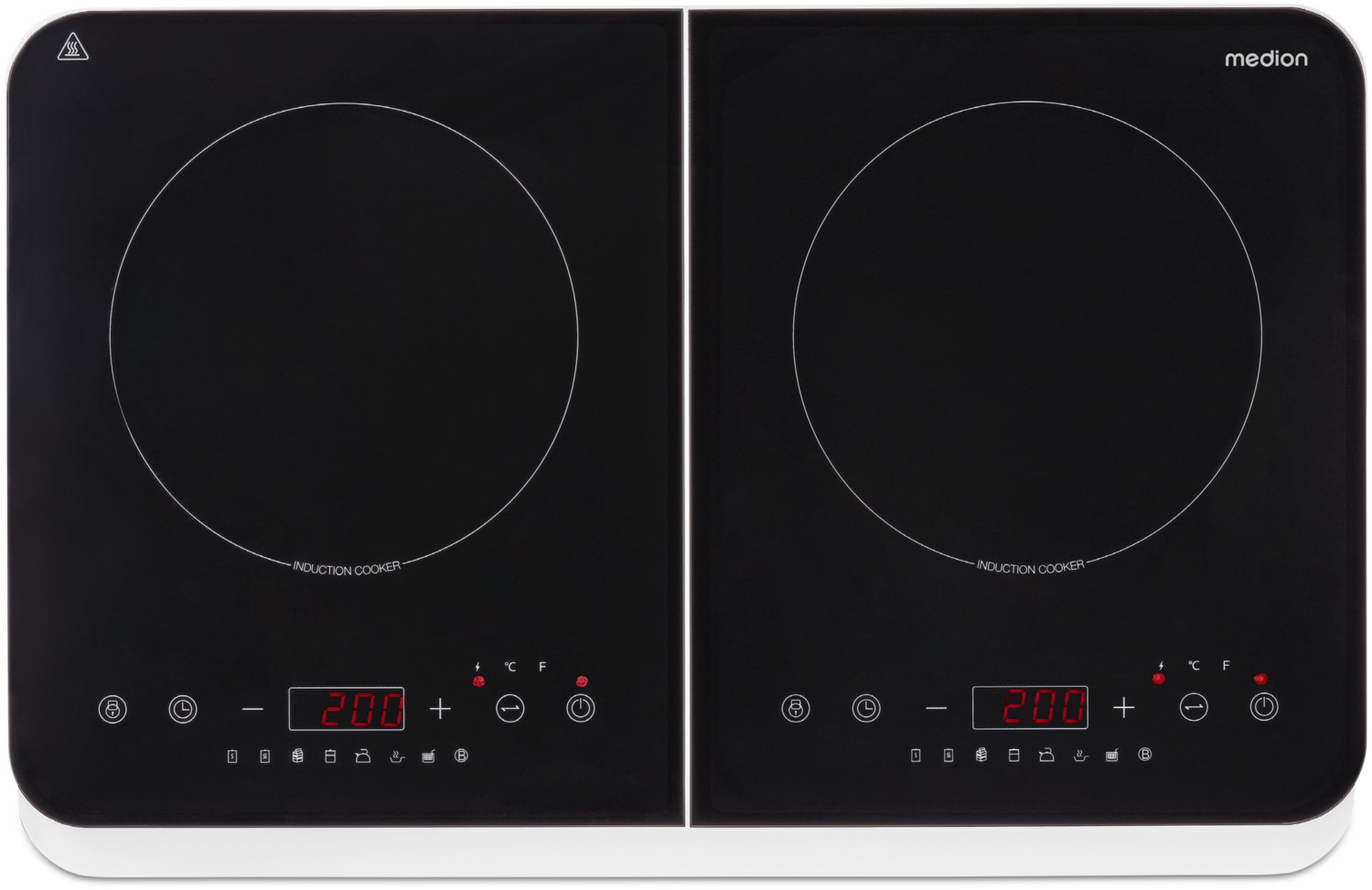Entspannte Kochfreude Die Doppel-Induktionskochplatte ist ausgesprochen leistungsstark. Mit Temperaturen von bis zu 240 °C können Sie Ihr Essen sanft garen oder scharf anbraten. Da die Wärme direkt in die Böden Ihrer Töpfe und Pfannen geleitet wird, lässt sich die Temperatur dabei besonders komfortabel einstellen. Angebrannter Spinat und übergekochte Milch kommen in Ihrer Küche nicht mehr vor. Hier sparst Du gleich doppelt Mit der Doppel-Induktionskochplatte von MEDION sparst Du gleich zweifach. Du sparst Zeit, weil Dein Essen mit der leistungsstarken Platte schneller denn je gegart wird. Temperaturen von bis zu 240 °C sind einstellbar und ermöglichen auch scharfes anbraten leckerer Steaks. Außerdem verbrauchen die Kochplatten dank kurzer Betriebszeiten extrem wenig Energie. Kühle Herdplatten Dank Induktionstechnologie gelangt die nötige Wärmeenergie direkt in die Unterseite Deiner Töpfe und Pfannen. Die Herdplatten bleiben dabei kühl und werden lediglich durch die Abwärme leicht erhitzt – sich am Herd zu verbrennen ist praktisch nicht möglich! Eine Automatische Topferkennung sorgt dafür, dass nichts passiert, wenn Du einmal vergisst die Platte nach dem Kochen auszuschalten.
