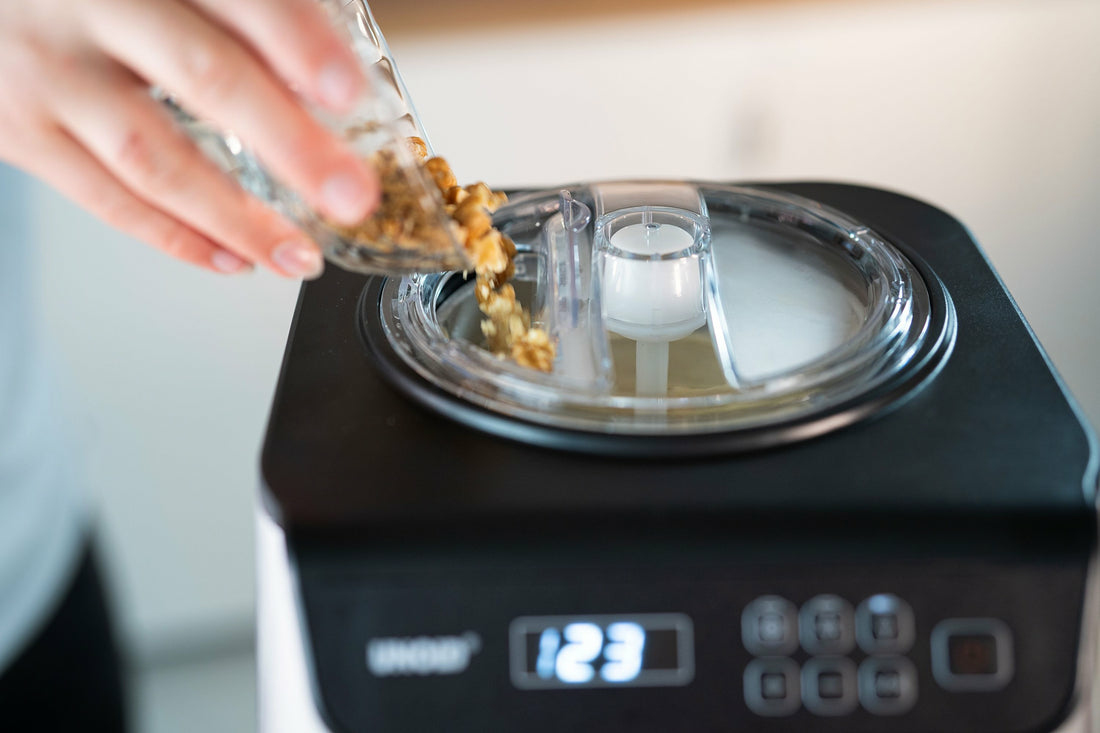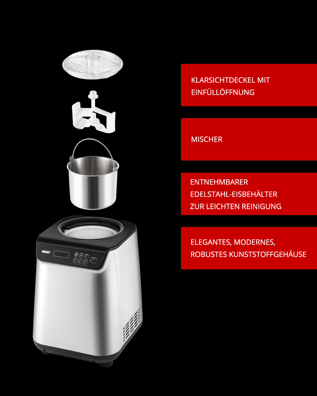 Kompakt & bedienerfreundlich Mit der EISMASCHINE Uno ist der Do-it-yourself-Eisgenuss ein Kinderspiel. Sind die Zutaten vorgekühlt, lassen sich in nur 30 Minuten 1,2 Liter köstliche Sahneeiscreme zubereiten. Aber auch für vegane, laktosefreie und steviahaltige Rezepturen ist das kompakte Gerät ideal. So lassen sich beste Zutaten nach persönlichem Geschmack verarbeiten! Im ebenso eleganten wie robusten Edelstahlgehäuse befindet sich der vollautomatische, selbstkühlende Kompressor, der für eine kontinuierliche Kälteerzeugung sorgt. Der Motor ist sogar für den Dauerbetrieb in der hauseigenen Eisdiele geeignet. Bis zu circa -35°C reicht der Gefrierbereich der EISMASCHINE Uno, die über einfach zu bedienende Tasten aktiviert wird. Das LCD-Display informiert über die Restlaufzeit und bietet auch die praktische Timer-Funktion: von 5 bis 60 Minuten einstellbar, wird das Eis zum gewünschten Zeitpunkt fertiggestellt und kann dann genussvoll weggeschleckt werden. Rezept-Inspirationen gibt es in der Bedienungsanleitung gleich mit! Durch die Deckelöffnung können weitere Zutaten zugegeben werden – Nüsse, Krokant, Fruchtstücke… Für die bequeme Reinigung sorgt der entnehmbare, eloxierte Eisbehälter.