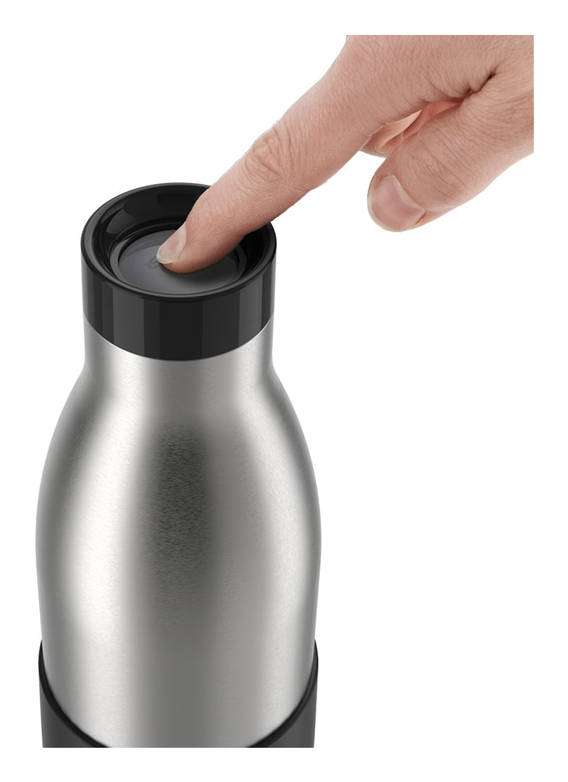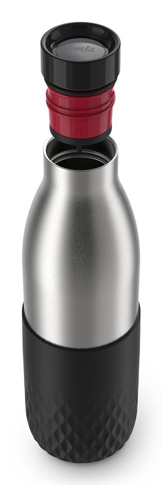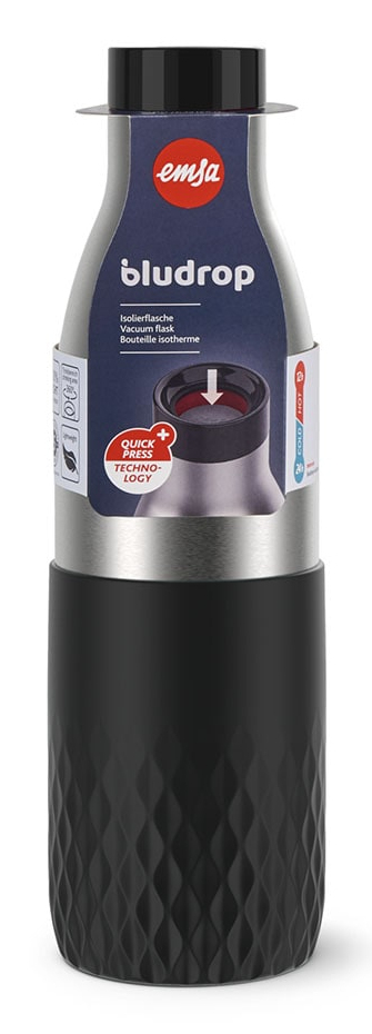 Perfektes Design für unterwegs – emsa Isolier-Trinkflasche Bludrop Sleeve schwarz 500,0 ml, 1 St.Die neue Isolier-Trinkflasche von emsa kombiniert Stil und Funktionalität. Dank ihres innovativen Quick-Press-Verschlusses lässt sie sich mühelos per Knopfdruck öffnen und schließen. Zudem ermöglicht die 360°-Trinköffnung ein angenehmes Trinken aus jeder Position – ideal für unterwegs.Langlebig und leistungsstarkHergestellt aus robustem, doppelwandigem Edelstahl ist diese Flasche nicht nur langlebig, sondern auch vakuumisoliert. Das hält Ihre Getränke bis zu 24 Stunden kalt oder 12 Stunden warm – perfekt für heiße Sommer- oder kalte Wintertage. Die praktische Soft-Touch-Manschette sorgt für einen sicheren Griff und erhöht den Komfort beim Tragen und Trinken.Hygiene und Sicherheit an erster StelleMit dem zu 100% dichten Design transportiert die Flasche Flüssigkeiten absolut sicher, ohne ein Tropfen zu verlieren. Der zerlegbare Verschluss ermöglicht eine einfache Reinigung für maximale Hygiene. Darüber hinaus ist die Bludrop Sleeve Isolier-Trinkflasche BPA-frei und somit unbedenklich für Ihre Gesundheit.Ihr perfekter Begleiter für jede GelegenheitEgal, ob Sie im Büro, beim Sport oder auf Reisen sind – mit der Isolier-Trinkflasche von emsa bleiben Sie jederzeit gut hydriert.Ihre neue Lieblingsflasche wartet – bestellen Sie die emsa Isolier-Trinkflasche Bludrop Sleeve noch heute hier in unserem Online Shop!