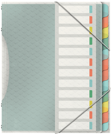 Esselte Ordnungsmappe Colour'Ice; Mit 12 Fächern; Mit auswechselbarem Inhaltsverzeichnis auf der Vorderseite; Mit Gummizug-Verschluss über den Vorderdeckelecken; Oberfläche mit 3-D-Effekt geprägt; Material: Polypropylen (PP), 0,5 mm; Format: 320 x 266m, DIN A4; Farbe: farbige Taben;
