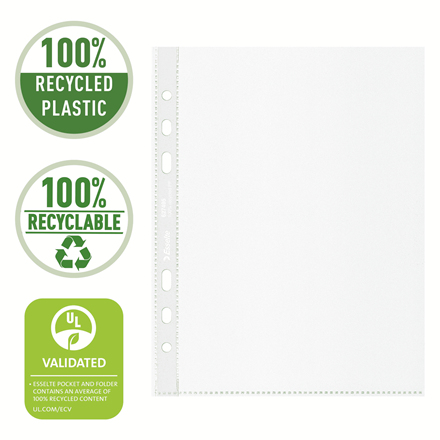 Esselte Prospekthülle recycled A5; Aus 100% recycelter PP-Folie, zu 100% recycelbar; Säurefreies Material verhindert das Vergilben der Unterlagen; Der Anteil des recycelten Materials ist zertifiziert durch UL; Oben offen; Mit verstärktem Lochrand recycelter Folie; Dokumentenecht; Genarbt; Mit Universallochung; Material: recycelbares Polypropylen (PP), 0,07 mm; Format: 168 x 215 mm; Für DIN A5; Inhalt: 100 Stück; Farbe: farblos.;
