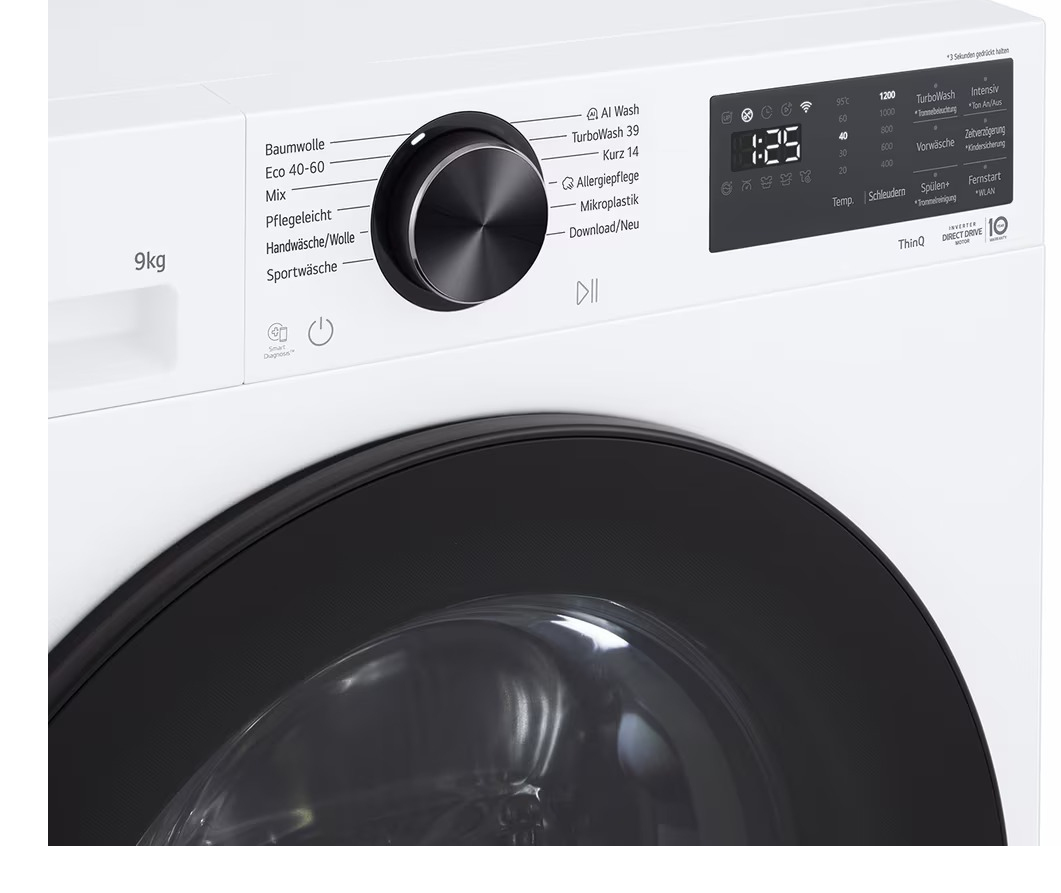 Waschmaschine F2X7SLIM9W von LG LG bietet mit dem Modell F2X7SLIM9W eine Stand-Waschmaschine. Mit einem Fassungsvermögen von 9 kg eignet sich das Gerät für große Familien. Die Möglichkeit, die Waschmaschine via WLAN über das Smartphone oder Tablet zu bedienen und , macht das Modell besonders smart. Eine Stand-Waschmaschine wie diese, die über die Features Endzeitvorwahl und Start-/Pause-Taste verfügt, lässt Sie Ihren Tag flexibel gestalten. Auf das richtige Programm kommt es an Für Koch- und Buntwäsche, Outdoor- und Sportbekleidung, Wolle, Baumwolle, Pflegeleichtes sowie Mischwäsche besitzt das Gerät jeweils eigene Programme. Keime werden mit den Spezialprogrammen für Allergiker zuverlässig beseitigt. Benötigt Ihre Wäsche wegen starker Verschmutzung eine besonders gründliche Reinigung, stellt dies dank der Vorwäsche-Taste kein Problem dar. Mit dem Kaltwasch-Programm kann entsprechend empfindliche Kleidung schonend behandelt werden. Vom Kurz-Programm, von der Kurz-/Zeitspar-Taste und vom Schnell-Programm profitieren Sie, wenn es fix gehen muss. Zu den Optionen der LG F2X7SLIM9W zählen auch das Outdoor/Imprägnieren-Programm und die Dampf-Funktion. Welches Programm ist wohl das passende? Stellen Sie sich diese Frage, nutzen Sie am besten das Automatik-Programm, denn hier wird alles exakt auf die Wäsche abgestimmt. Der Wasserverbrauch passt sich an die Füllmenge mittels cleverer Sensorik an. Es wird ein extra Spülgang eingelegt, wenn zu viel Schaum in der Trommel ist. Abgesehen von der Auswahl eines Programms ist es möglich, die Schleuderstufe zu reduzieren oder den Schleudervorgang komplett auszustellen. Bedingung für saubere Wäsche ist eine saubere Waschmaschine, daher besitzt die LG F2X7SLIM9W ein Reinigungsprogramm. Zusätzliche Eigenschaften der Stand-Waschmaschine Die Kindersicherung und der Wasser-Stopp bieten extra viel Sicherheit. Ein Unwucht-Korrektur-System beim Schleudern gehört ebenso zur Ausstattung der LG F2X7SLIM9W. Die LG F2X7SLIM9W arbeitet dank eines Inverter-Motors und eines Betriebsgeräuschs von maximal 71 dB ausgesprochen leise. Zu nennen ist im Bezug auf den Verbrauch die Energieeffizienzklasse A. Die Waschmaschine mit einer Maximalzahl von 1200 U/Min. wurde mit der Schleuderwirkungsklasse B ausgezeichnet. Dies sorgt dafür, dass 53,9% Restfeuchte in der Wäsche bleibt. Der Tür-Anschlag ist links. Unsere Kaufempfehlung Was Sie suchen, ist eine Waschmaschine, die mit dem Smartphone bedienbar ist, über eine Kindersicherung und Wasser-Sicherung verfügt und sich selbst reinigt? Mit der LG F2X7SLIM9W machen Sie alles richtig.