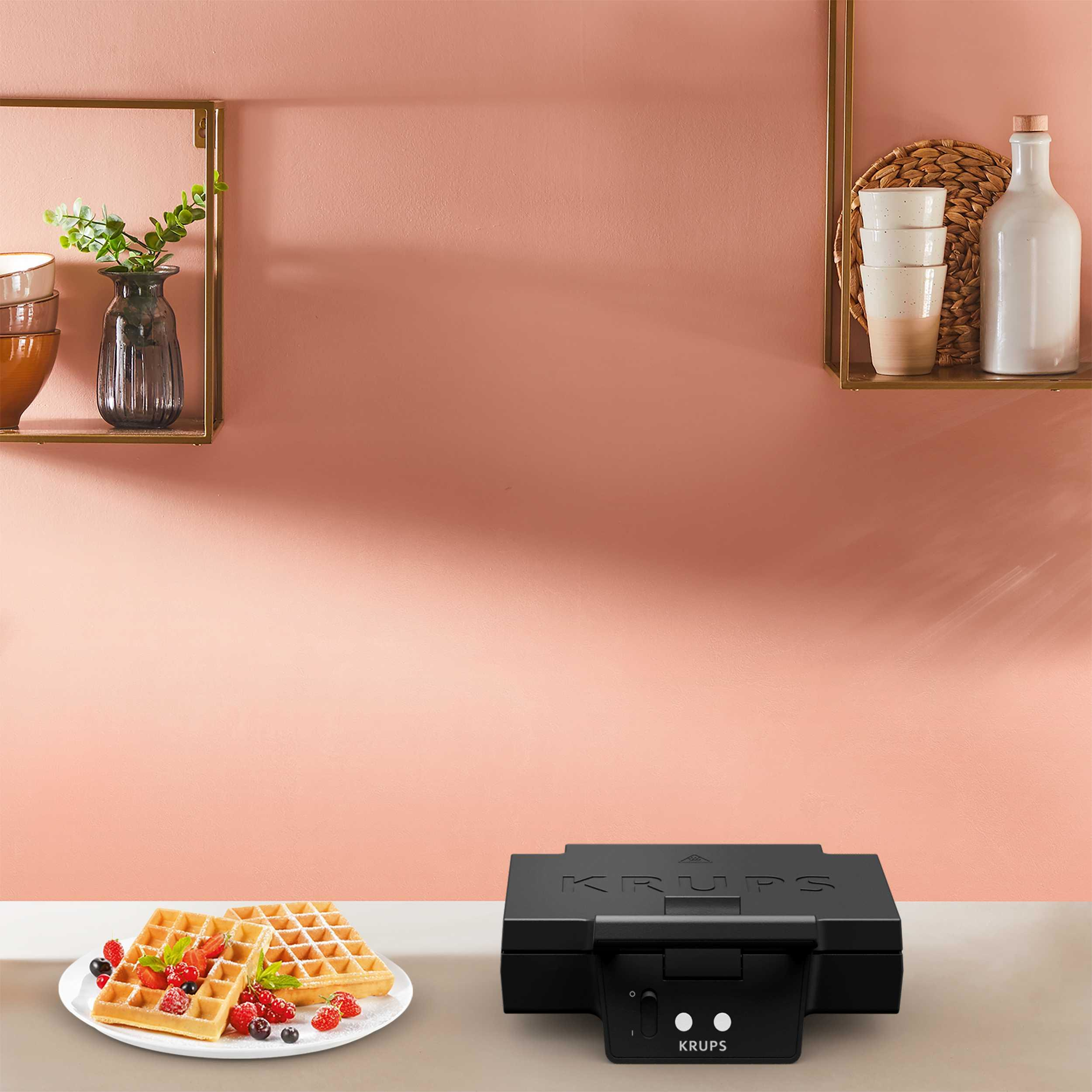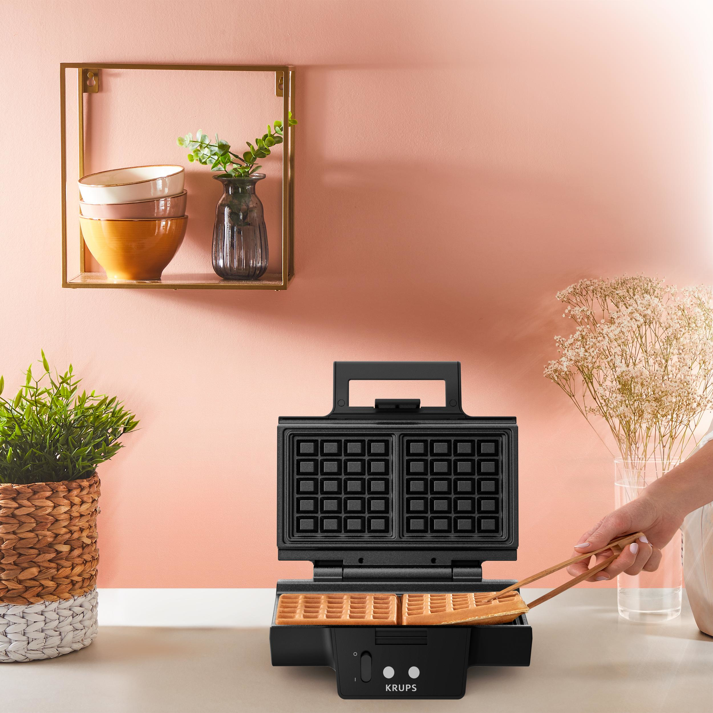 Leckere Waffeln zu Hause Das KRUPS Waffeleisen ist die Antwort auf köstliche viereckige Waffeln, die schnell zu Hause zubereitet werden können. Dank der tiefen, doppelten Garplatten können zwei Waffeln gleichzeitig zubereitet werden, für großzügige Ergebnisse. Mit der Vorheizanzeige und der grünen Bereitschaftsanzeige zum Backen lassen sich ganz einfach köstliche Ergebnisse erzielen