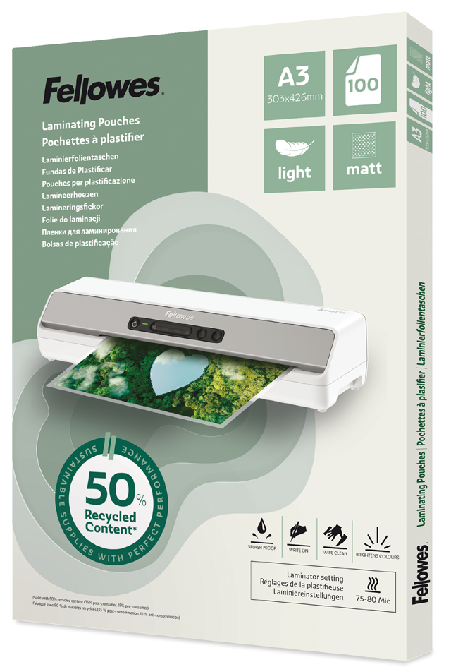 hergestellt aus 50 % recyceltem Material, LIGHT-Ausführungzur Verwendung bei der 75/80 mic Laminatoreinstellung,2 x 75/80 mic, Maße: (B)303 x (H)426 mmInhalt: 100 Stück(100143436)