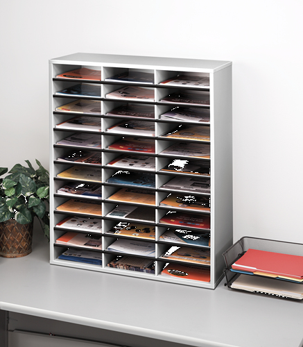 Post- und Broschüren Manager; Anzahl der Fächer: 36; Ablageeinheit für Broschüren, Formulare oder Post.; 36 horizontale A4-Fächer.; Schneller und einfacher Aufbau.; Mit selbstklebenden Etiketten für eine einfache Beschriftung der Fächer.; Maße Fach ca: 225 x 60 x 300mm.; Maße Etiketten ca: 9 x 75mm; Verwendung für Papierformate: A4; Werkstoff: Spanplatte mit Melamin-Oberfläche, Fächer aus Wellpappe; Größe (B x H x T): 881 x 737 x 302 mm; Farbe des Gestells/Briefkorbes: taubengrau; Garantiedauer: 1 Jahr beschränkt;