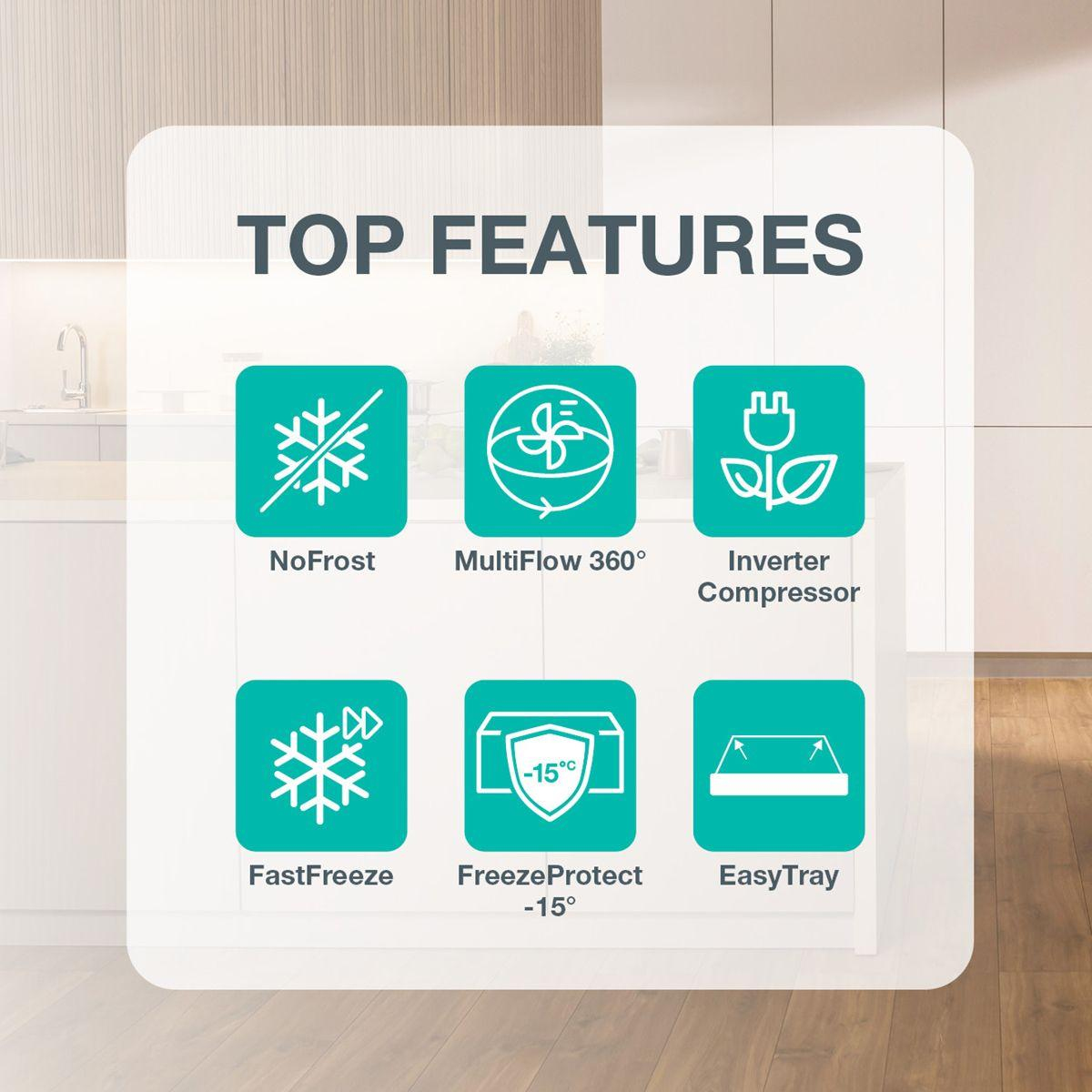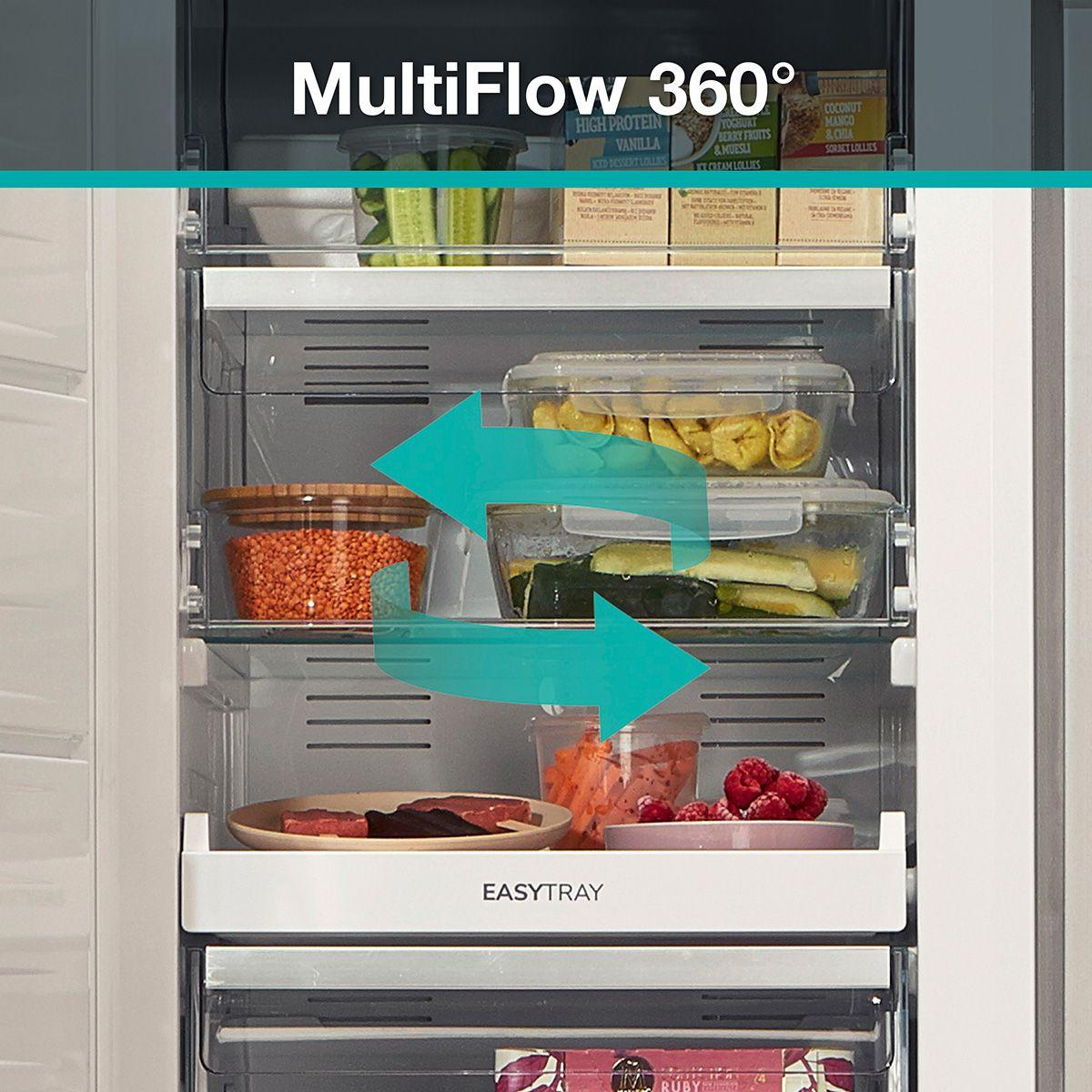 Das MultiFlow 360°-Belüftungssystem verteilt die Luft gleichmäßig im Kühlteil, um eine optimale Luftzirkulation und beste Lagerbedingungen für Ihre Lebensmittel zu gewährleisten.